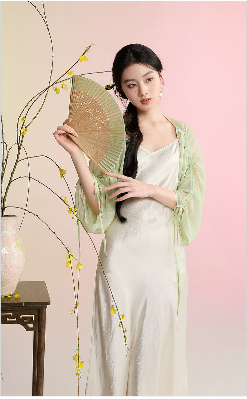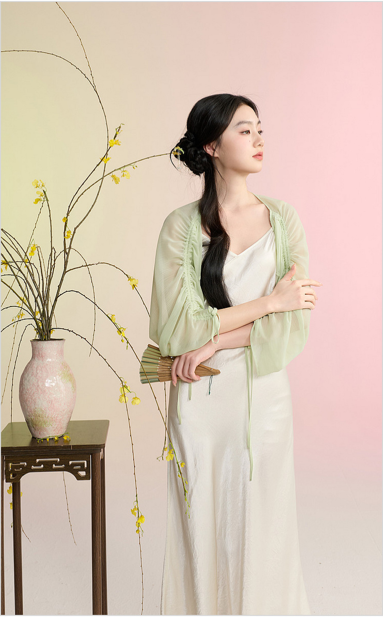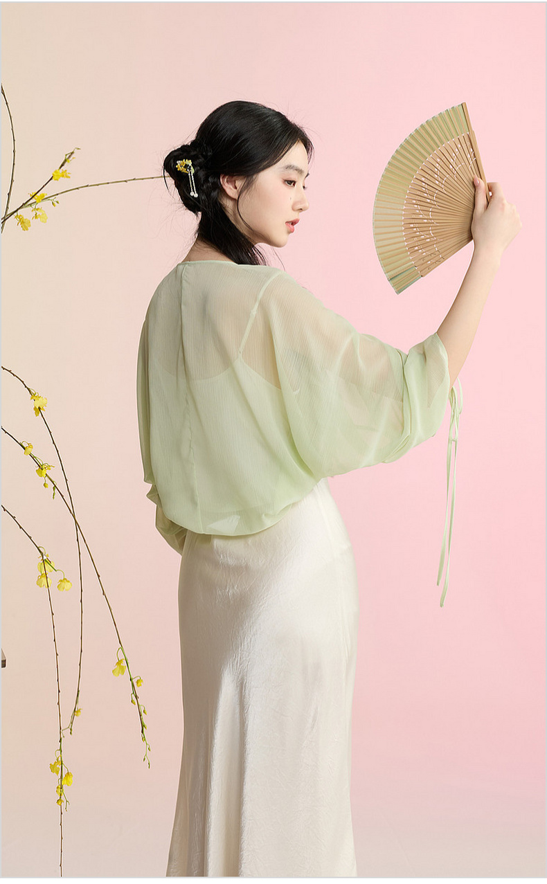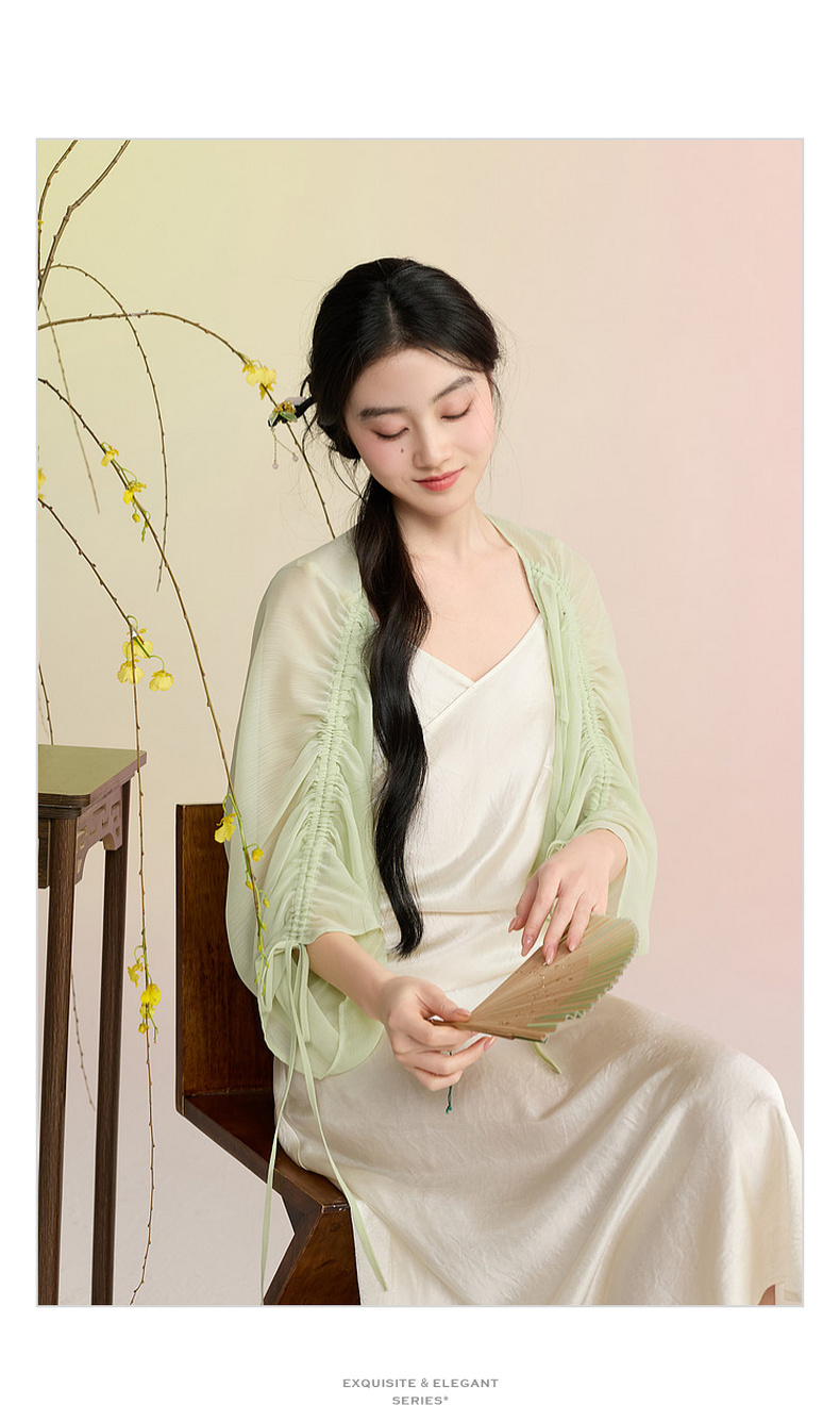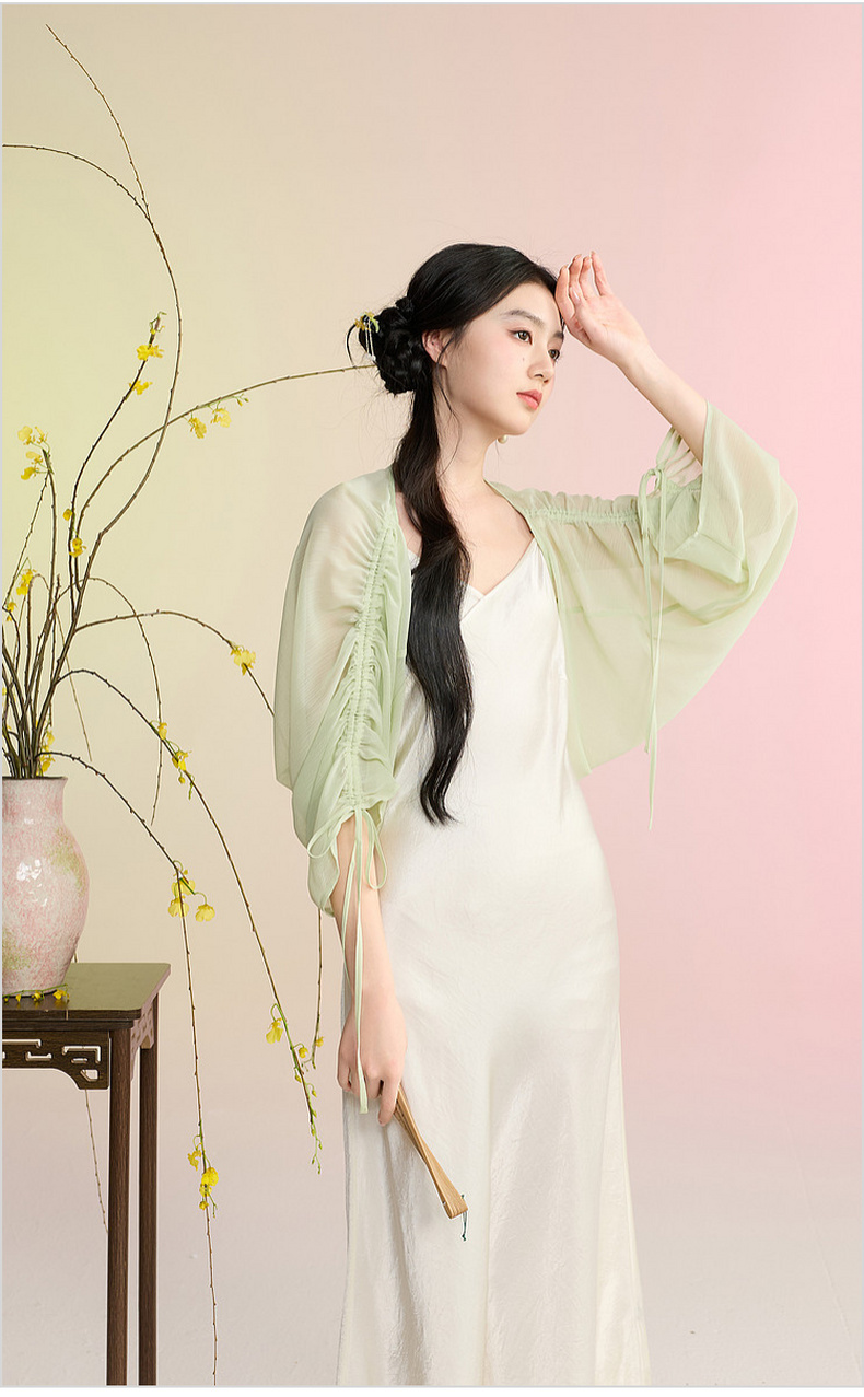三彩2026新款国风雪纺披肩度假风遮阳灵动抽绳流苏朦胧通勤约会女