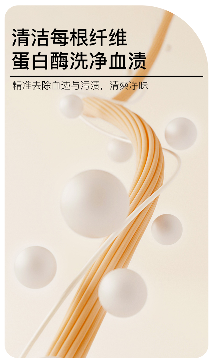 高活性蛋白酶:焕活洁净能量 可以深入织物纤维,有效去除小内内上的附着物、🩸血渍、异味... 专职溶解各种痕迹,洗后不会造成有害物残留,省心又省力! 舒服且高级的皂香独有的清新温润,宛若怡人体香