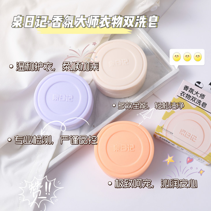 无论是颜值还是质地 都兼顾了「美」和实用性 【泉日记 · 香氛大师衣物双洗皂】 ——温和护衣,柔顺加乘 不单单留香给力还大大增强了衣物的「洁净力」 洁污+去味+留香一“皂”达成!