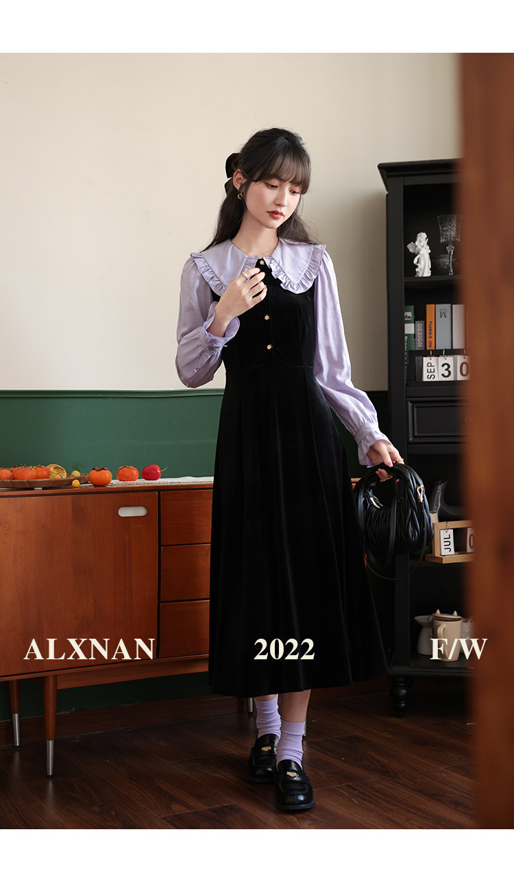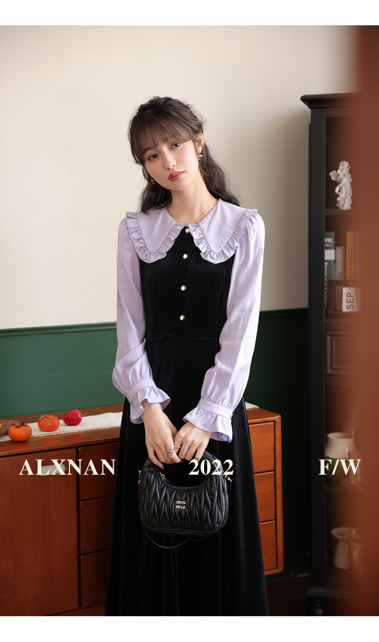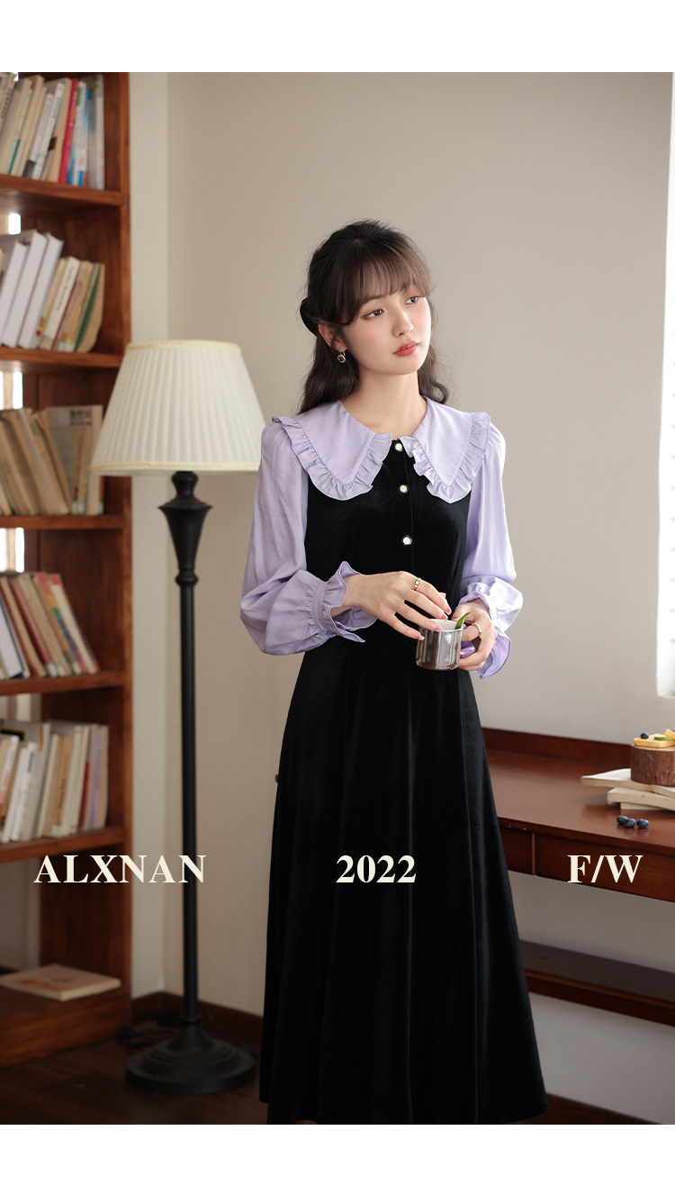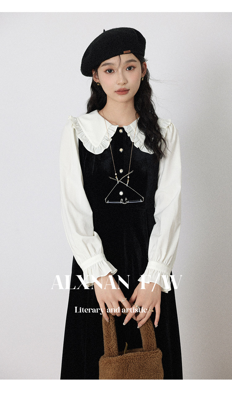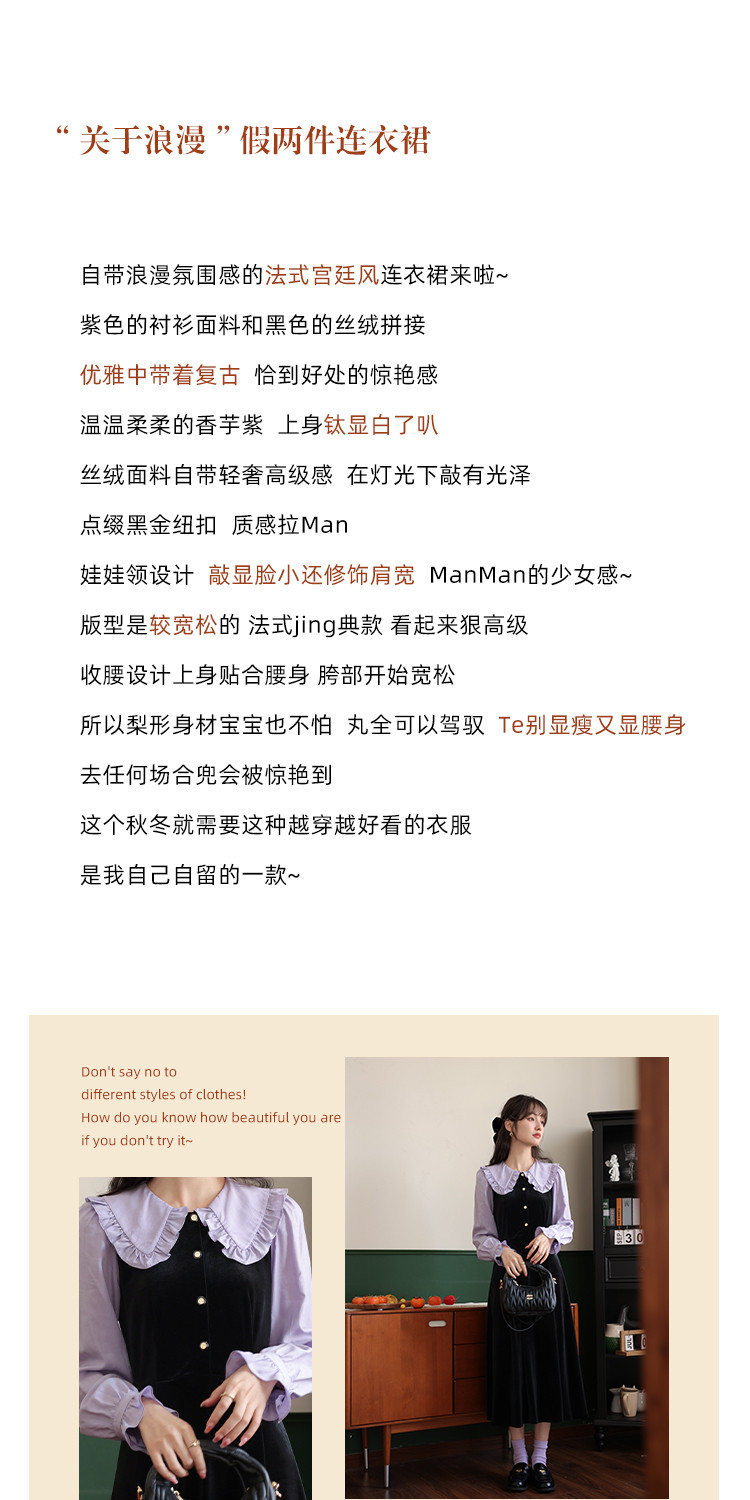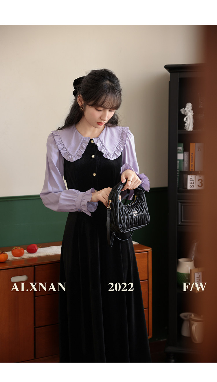 鹿向南「梦幻星辰」假两件法式桔梗娃娃领连衣裙女秋冬季收腰长裙