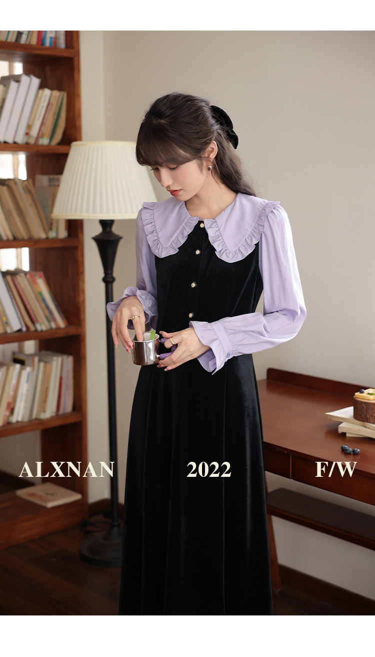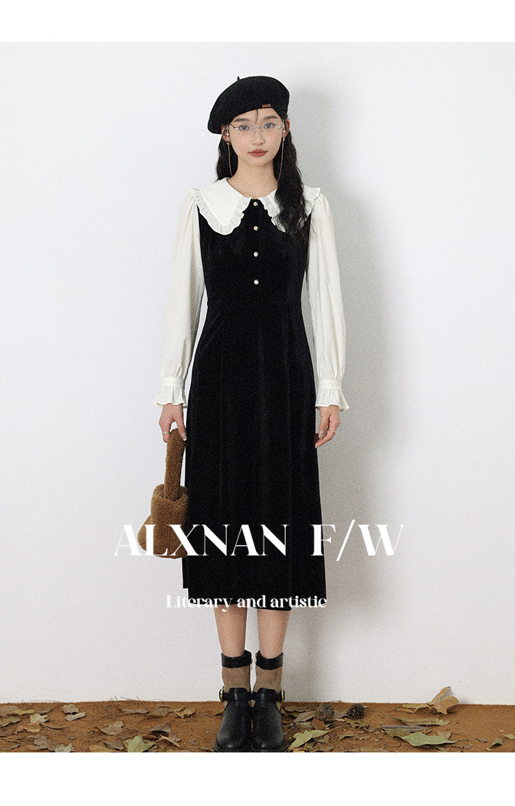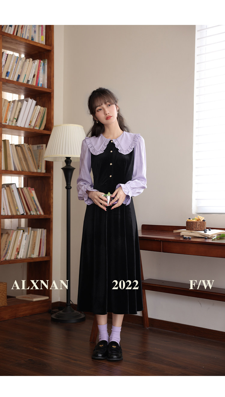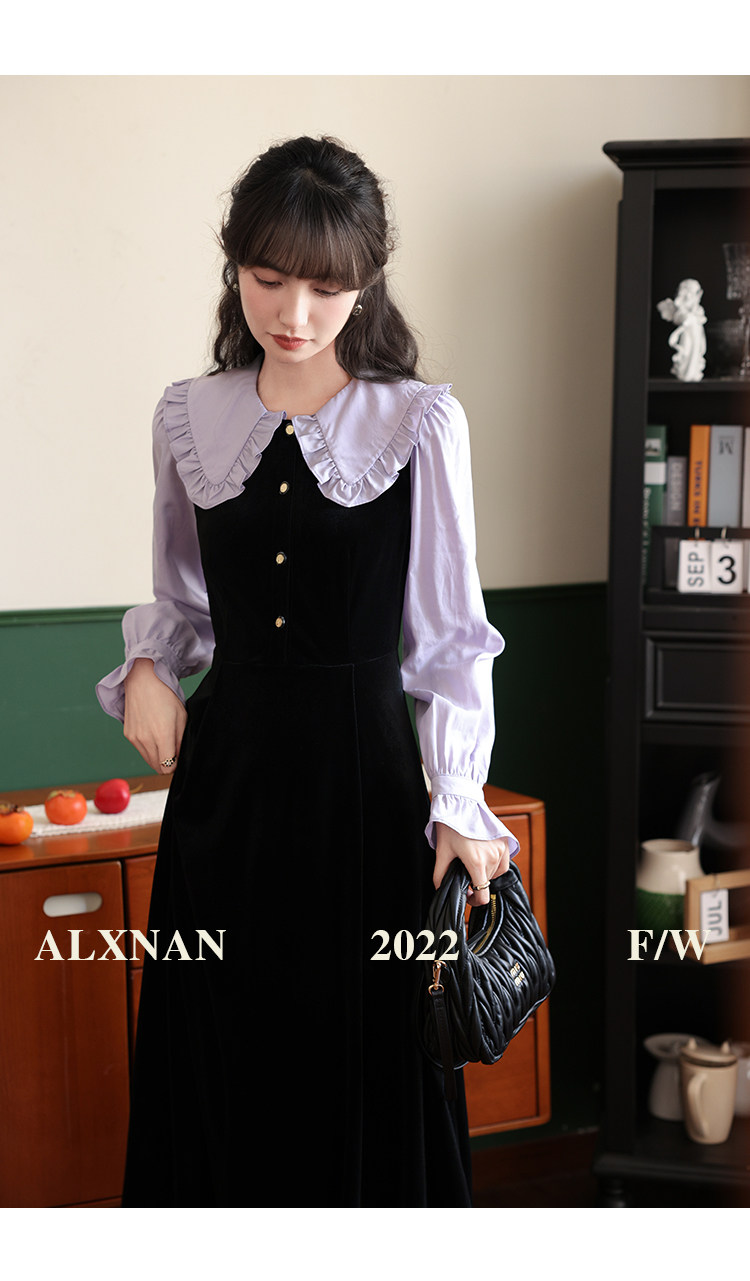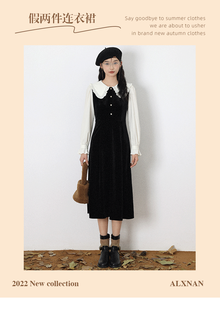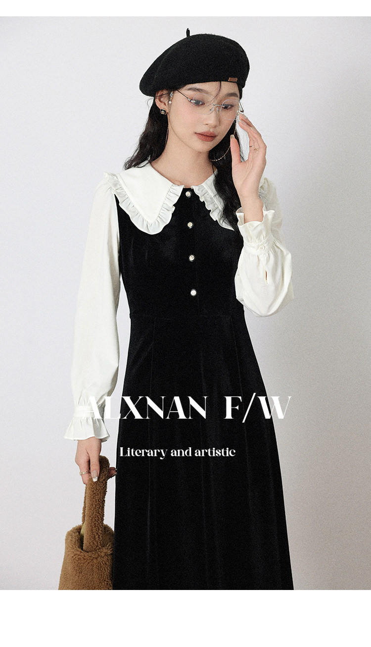 鹿向南「梦幻星辰」假两件法式桔梗娃娃领连衣裙女秋冬季收腰长裙