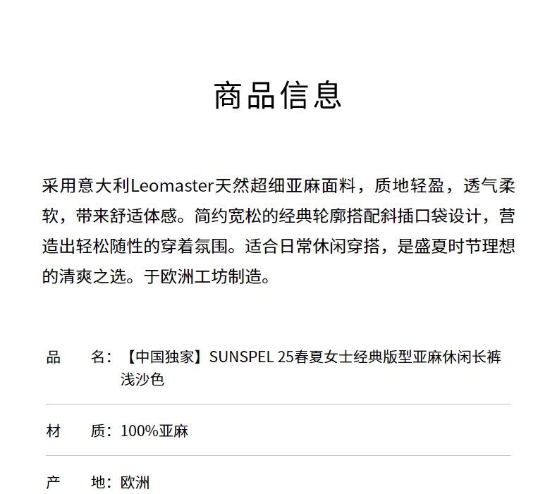 【亚麻系列】SUNSPEL 女士春夏经典版型亚麻休闲长裤 浅沙色