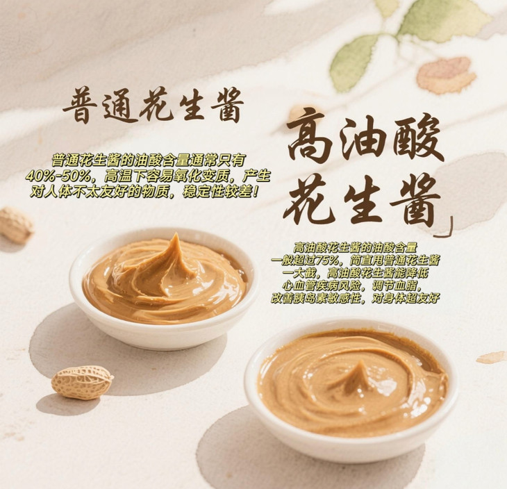 普通花生酱的油酸含量一般在40 - 50% 而高油酸花生酱,油酸含量轻松突破75%🤭 普通花生酱虽然也有油酸 但和高油酸花生酱比起来 健康价值就逊色不少 高油酸花生酱堪称健康小标兵 能帮我们降低心血管疾病风险 调节血脂🩸 而且高油酸花生酱比普通土花生酱质地细腻!! 入口就能感受到那种丝滑柔顺 越回味越香😋