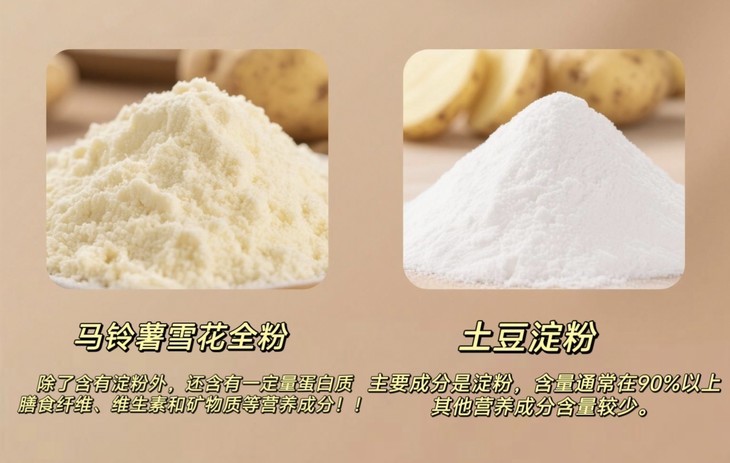 马铃薯雪花全粉和土豆淀粉虽然均来源于马铃薯🥔 但是「马铃薯雪花全粉」将马铃薯熟化后🔥 较好地保留了马铃薯的风味和口感!! 具有浓郁的土豆香味 且质地细腻 口感醇厚