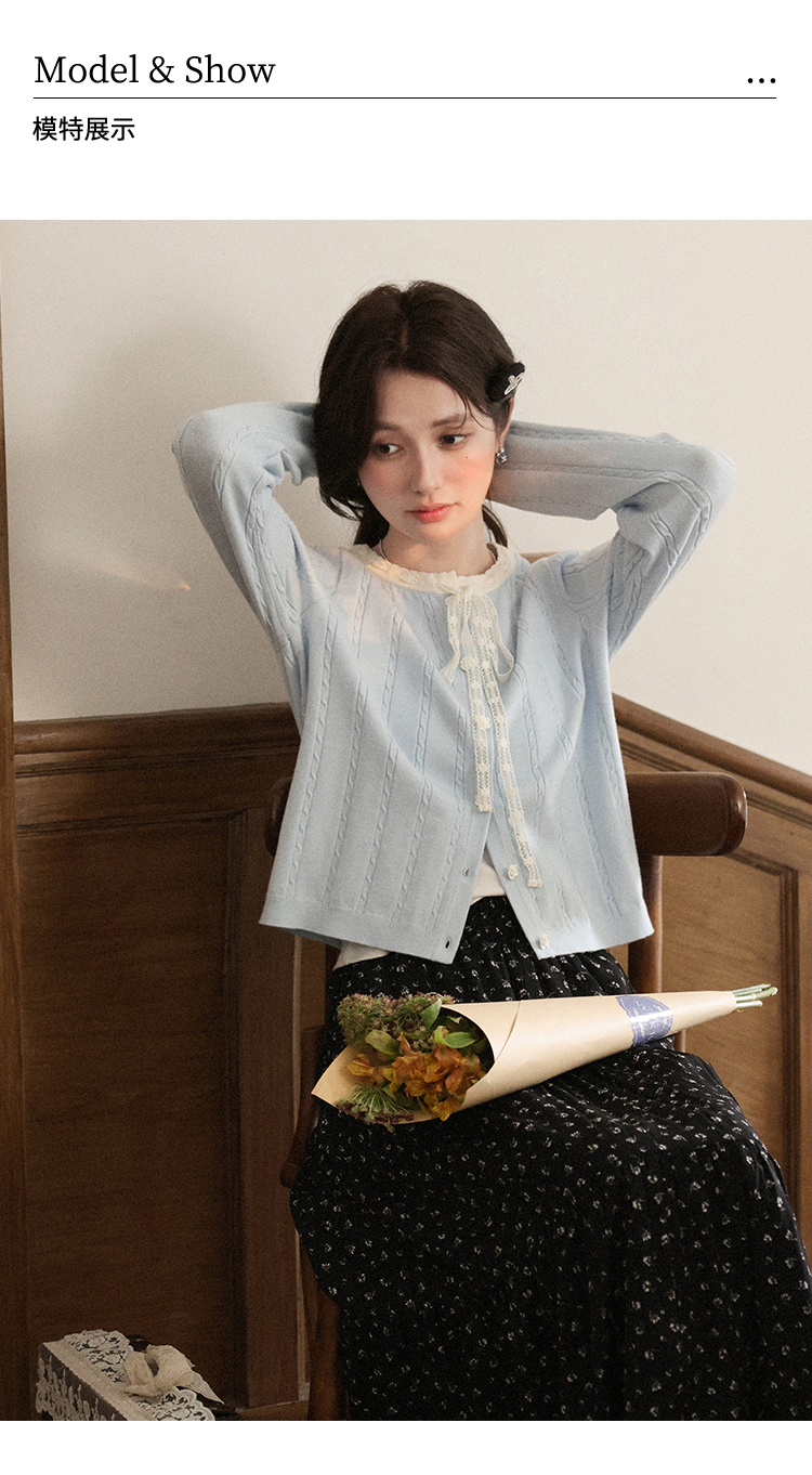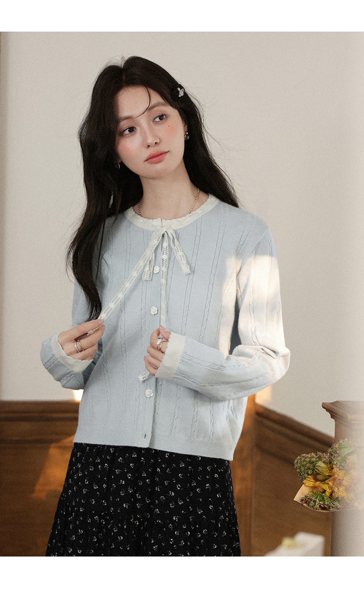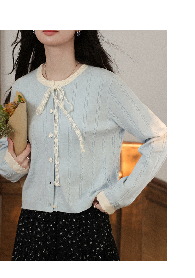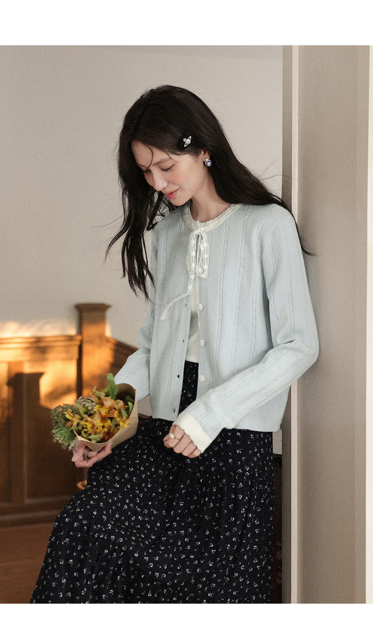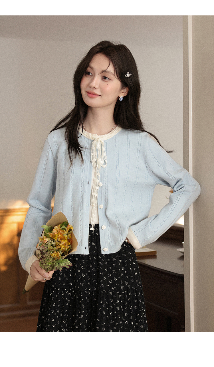 鹿向南「簌簌铃兰」法式蓝色拼色针织开衫外套女早秋长袖短款外搭