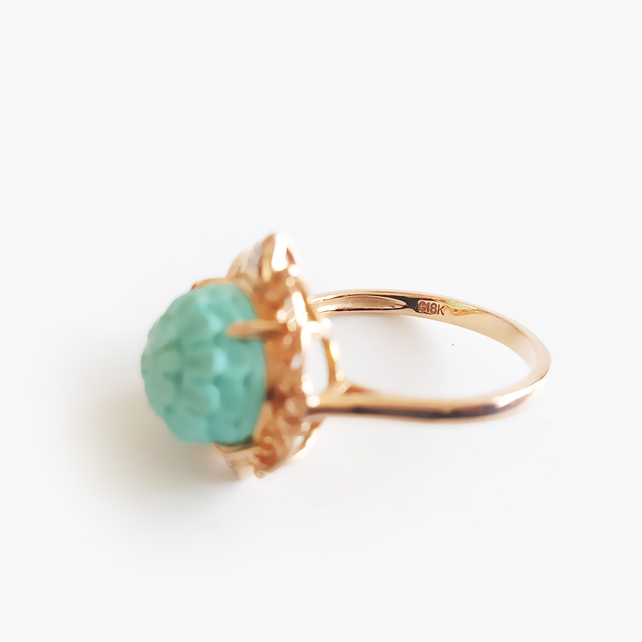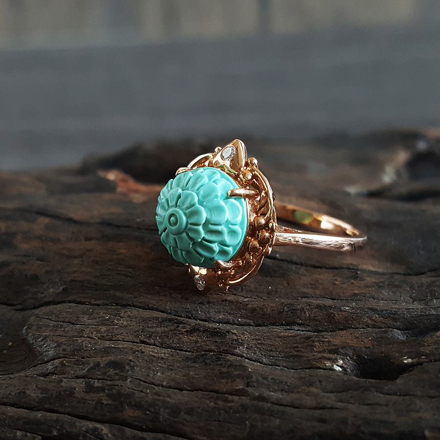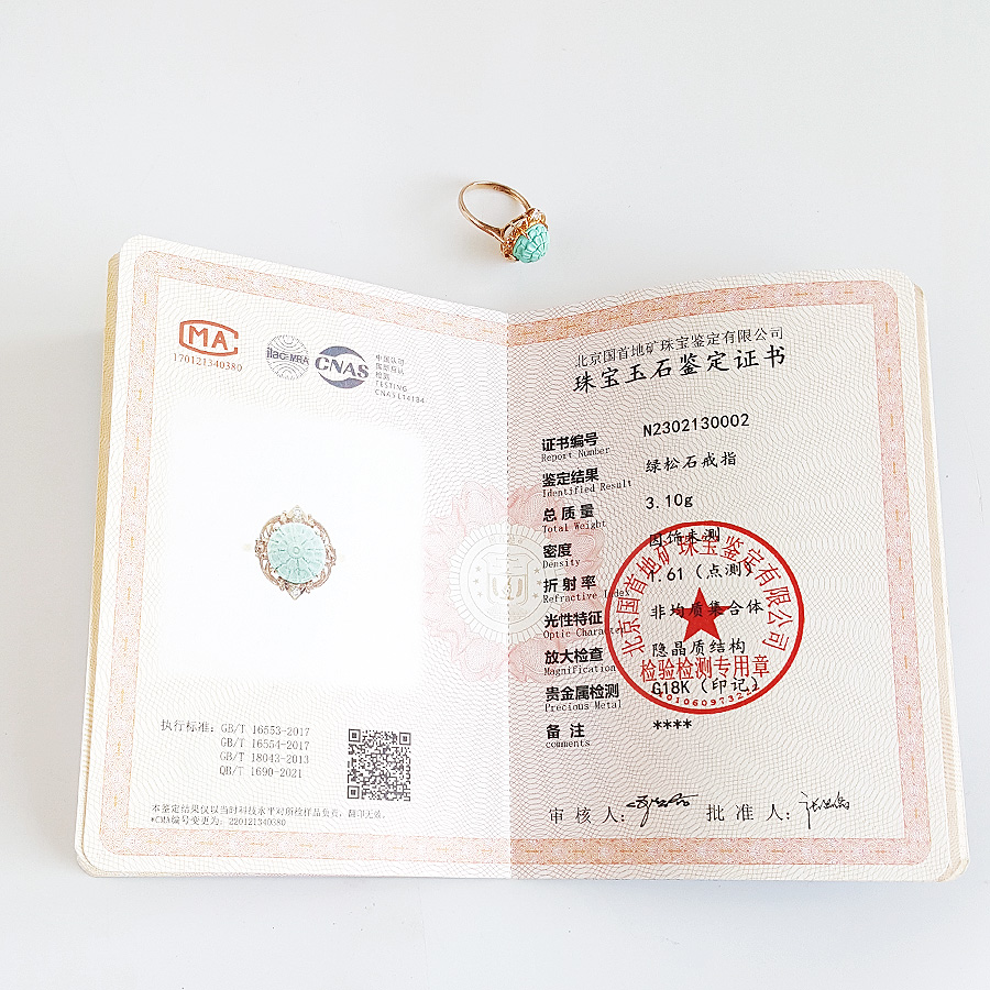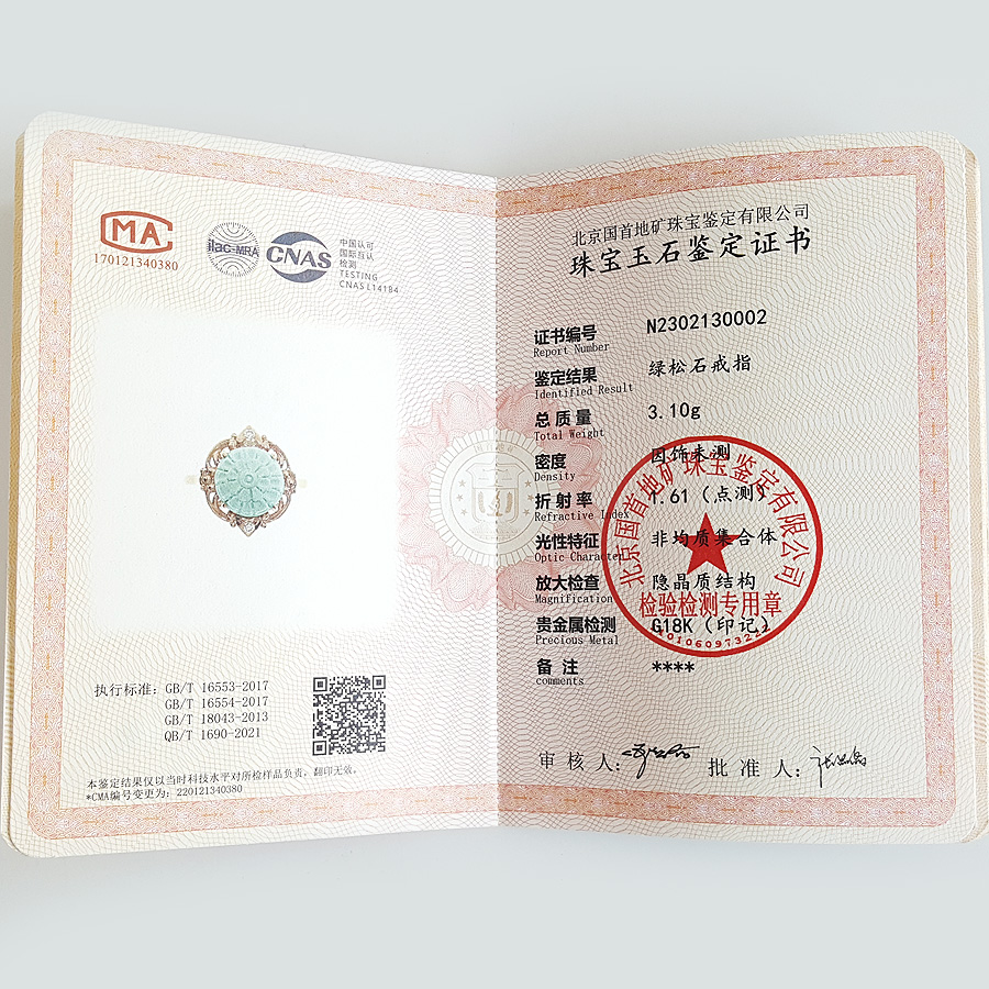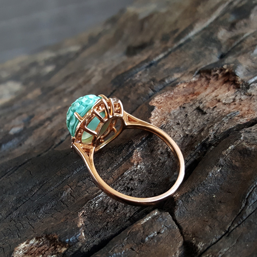 【天然正品】AU750玫瑰金镶钻镶天然高瓷高蓝原矿绿松石戒指 161223NJM31