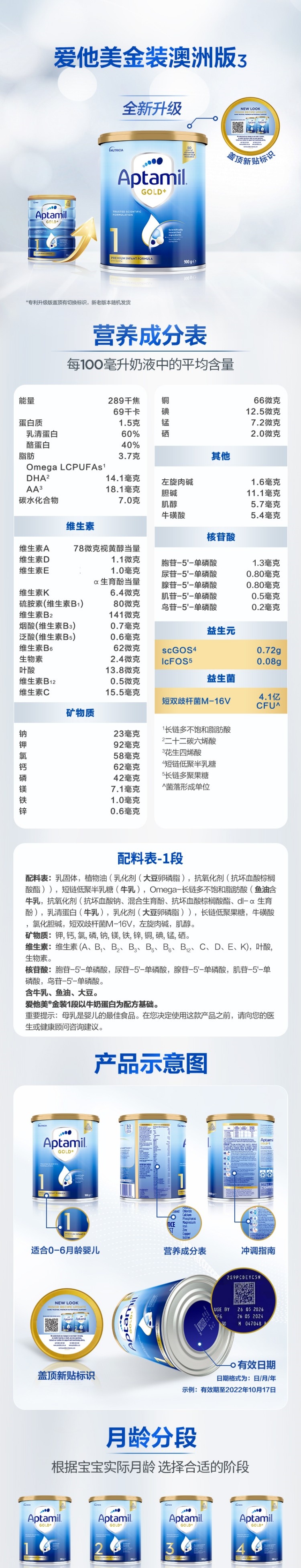 【品牌直供】澳洲Aptamil爱他美金装版奶粉 1段 0-6个月 900g【超过6罐请分开下单】