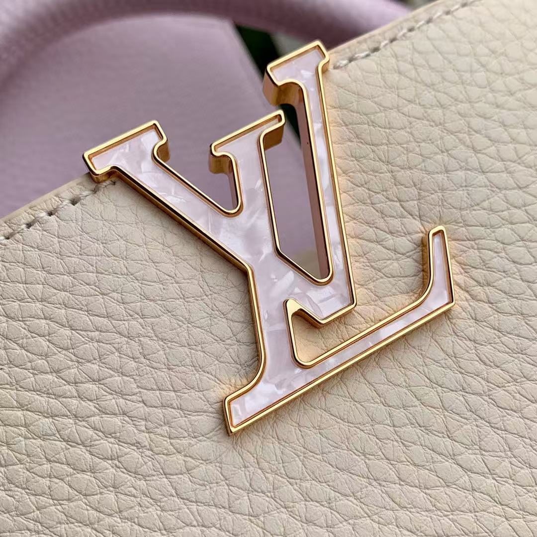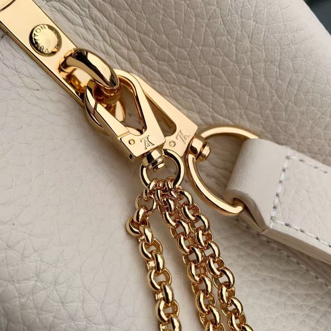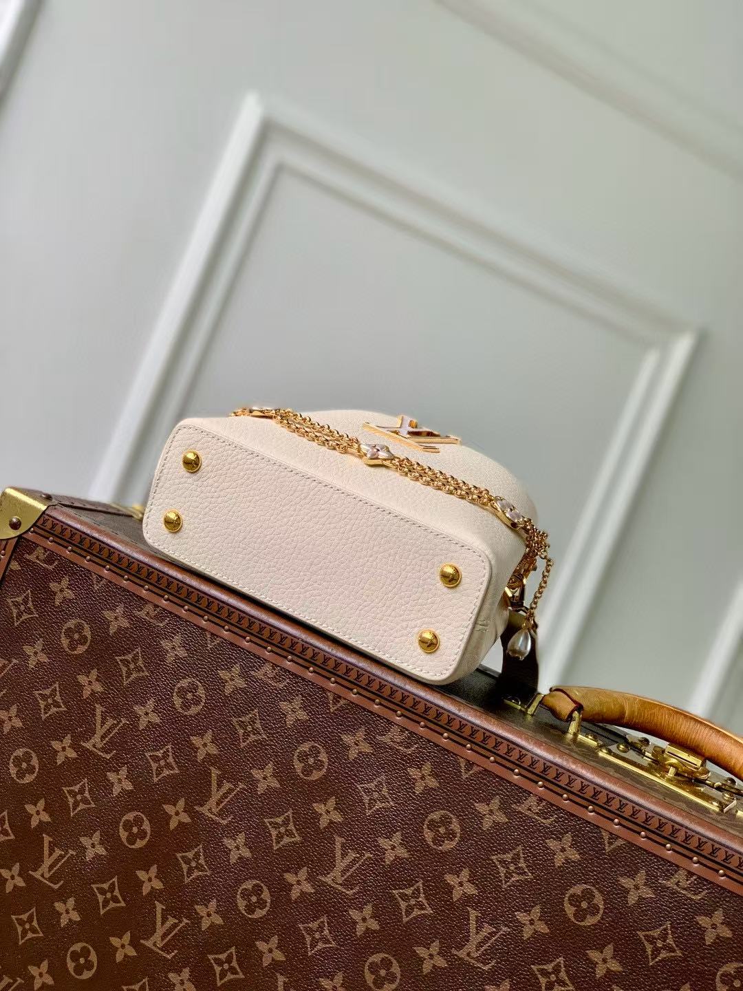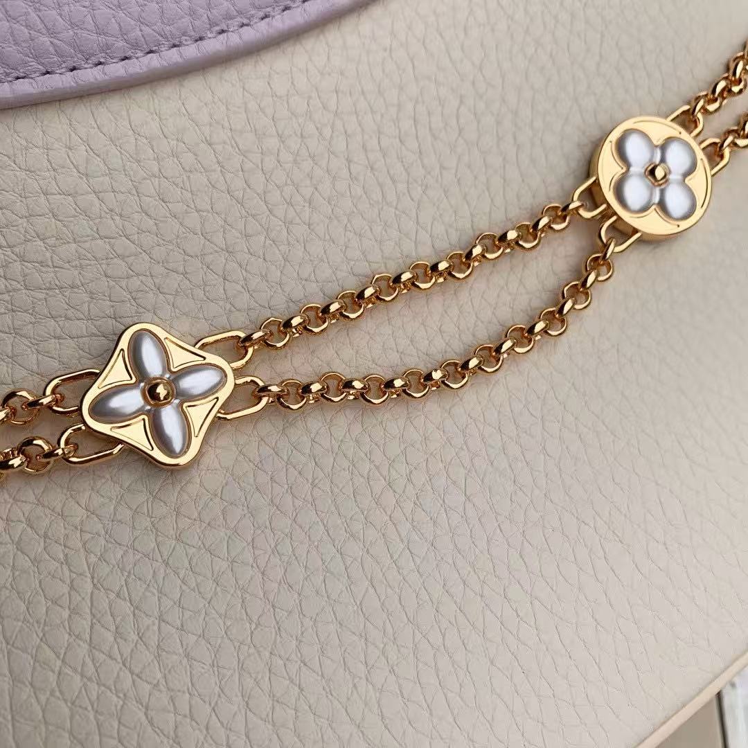 本款 Capucines 迷你 手袋出自 Daydream 系列,为 Taurillon 牛皮革渲染雅致色调,巧妙致意经典贝壳项链。Monogram 花卉点亮巴洛克风格链条,LV 字母标识与莹润珠饰再添熠熠华彩。