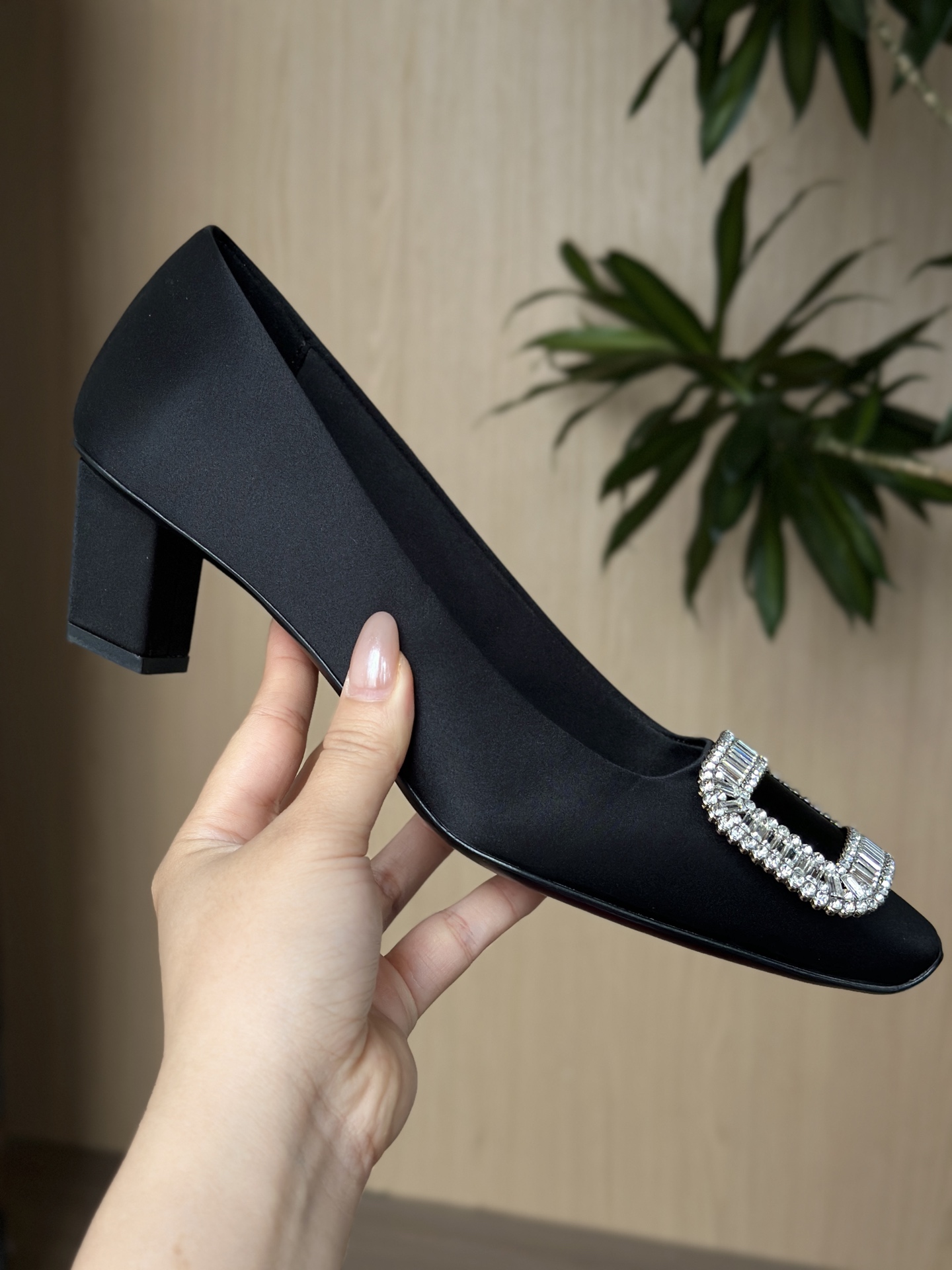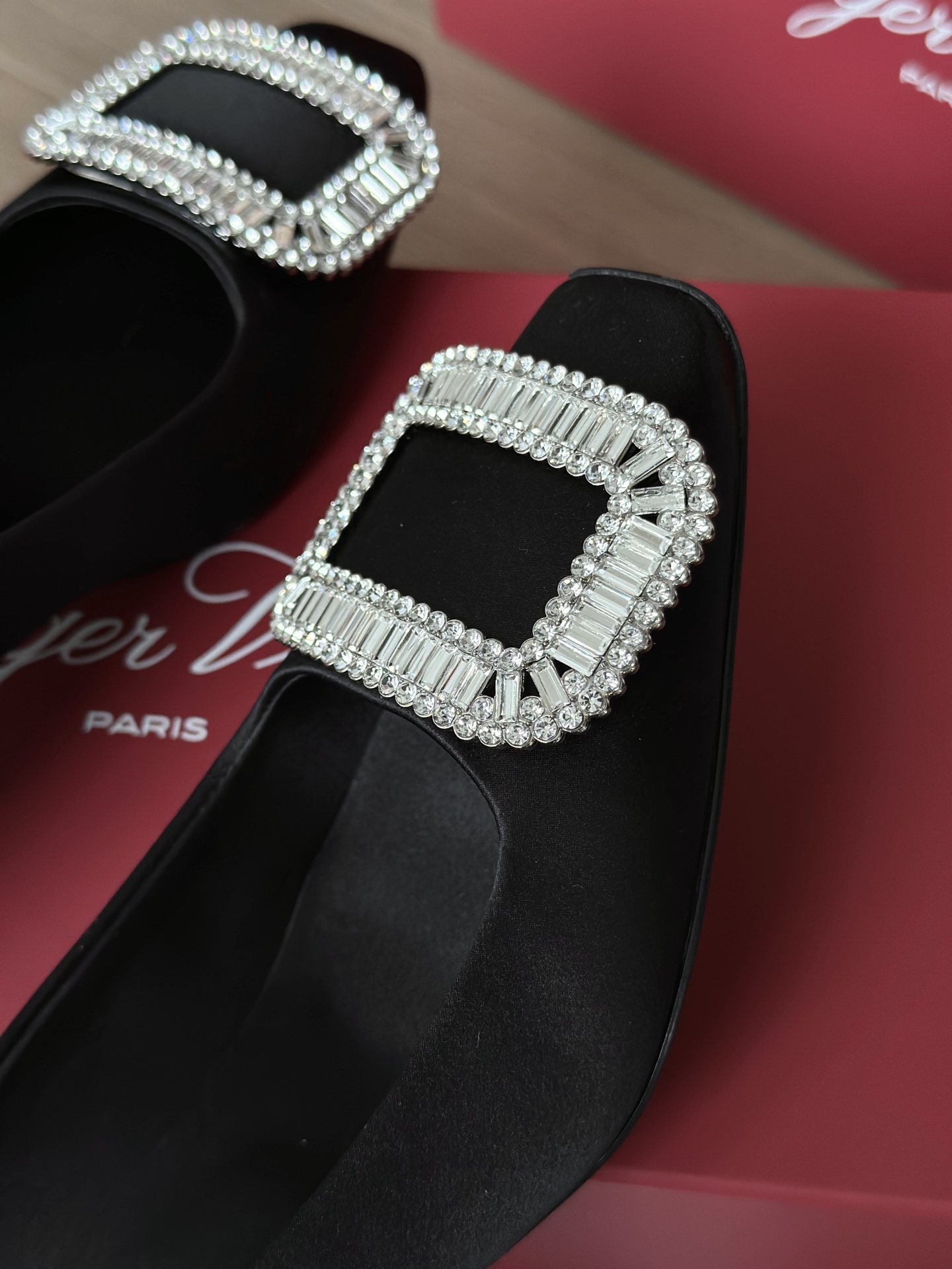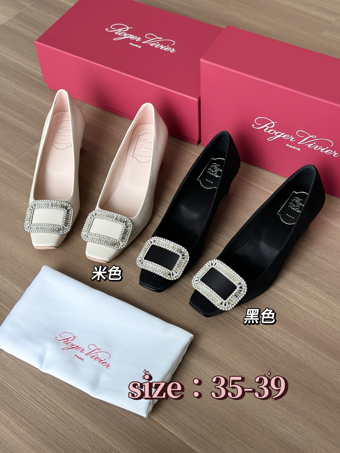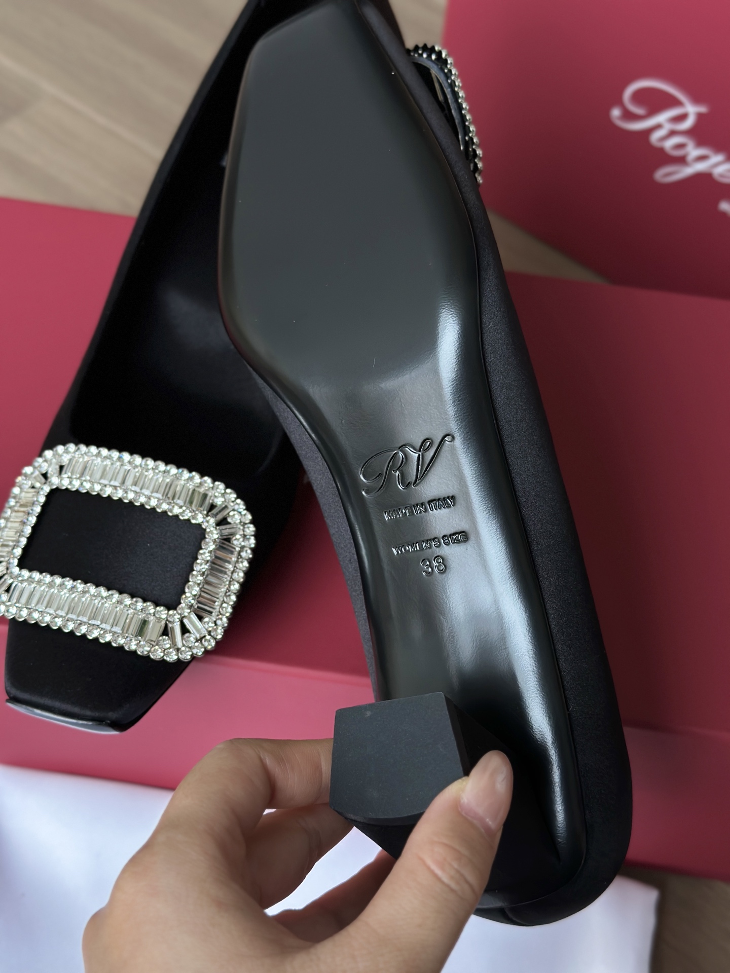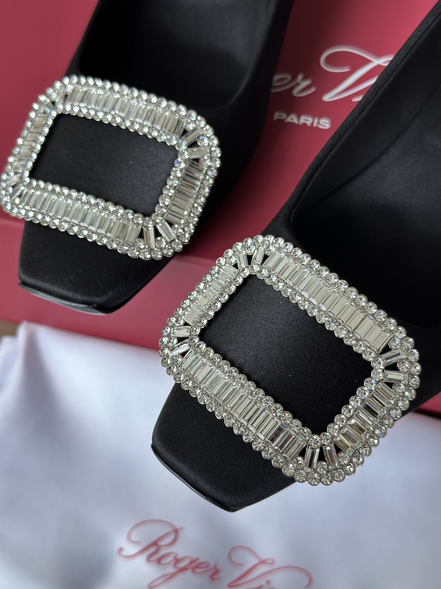 真丝面料丝滑细腻,脚感舒适一旦上脚就舍不得脱。整双鞋着地稳!施华洛世奇水钻,质感奢华!这款RV别出心裁的方钻扣设计搭配4.5cm经典小方跟,使得鞋子穿着更舒适,修饰腿型更修长