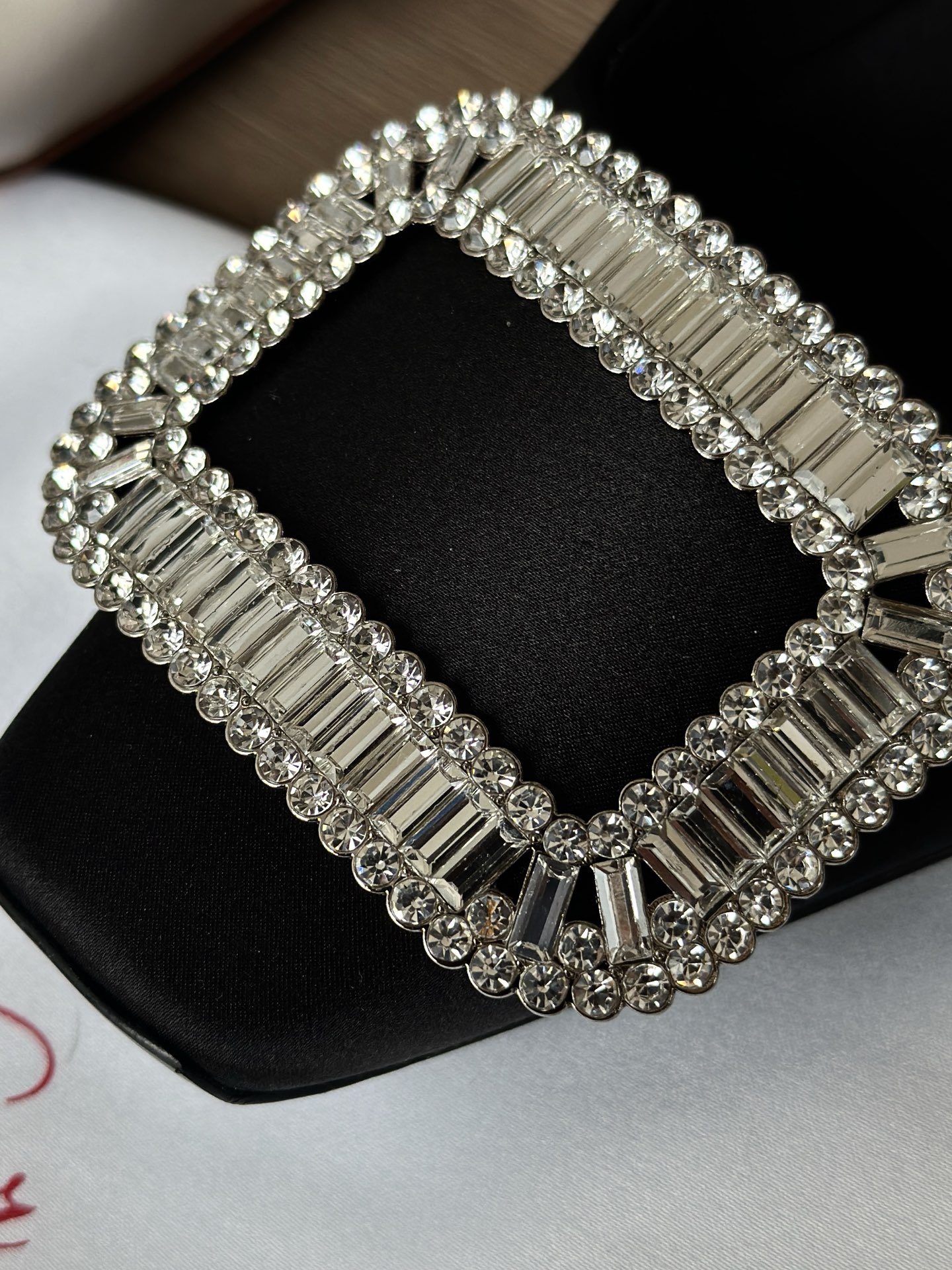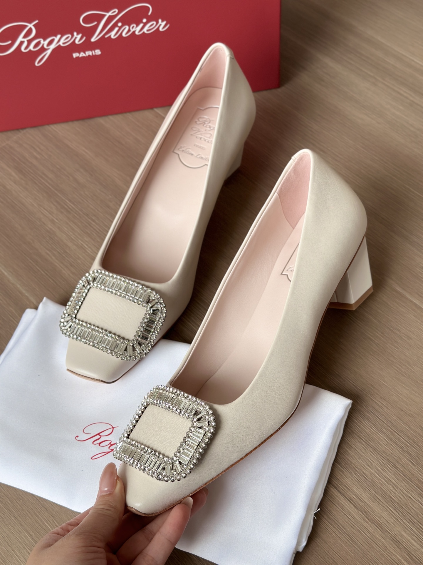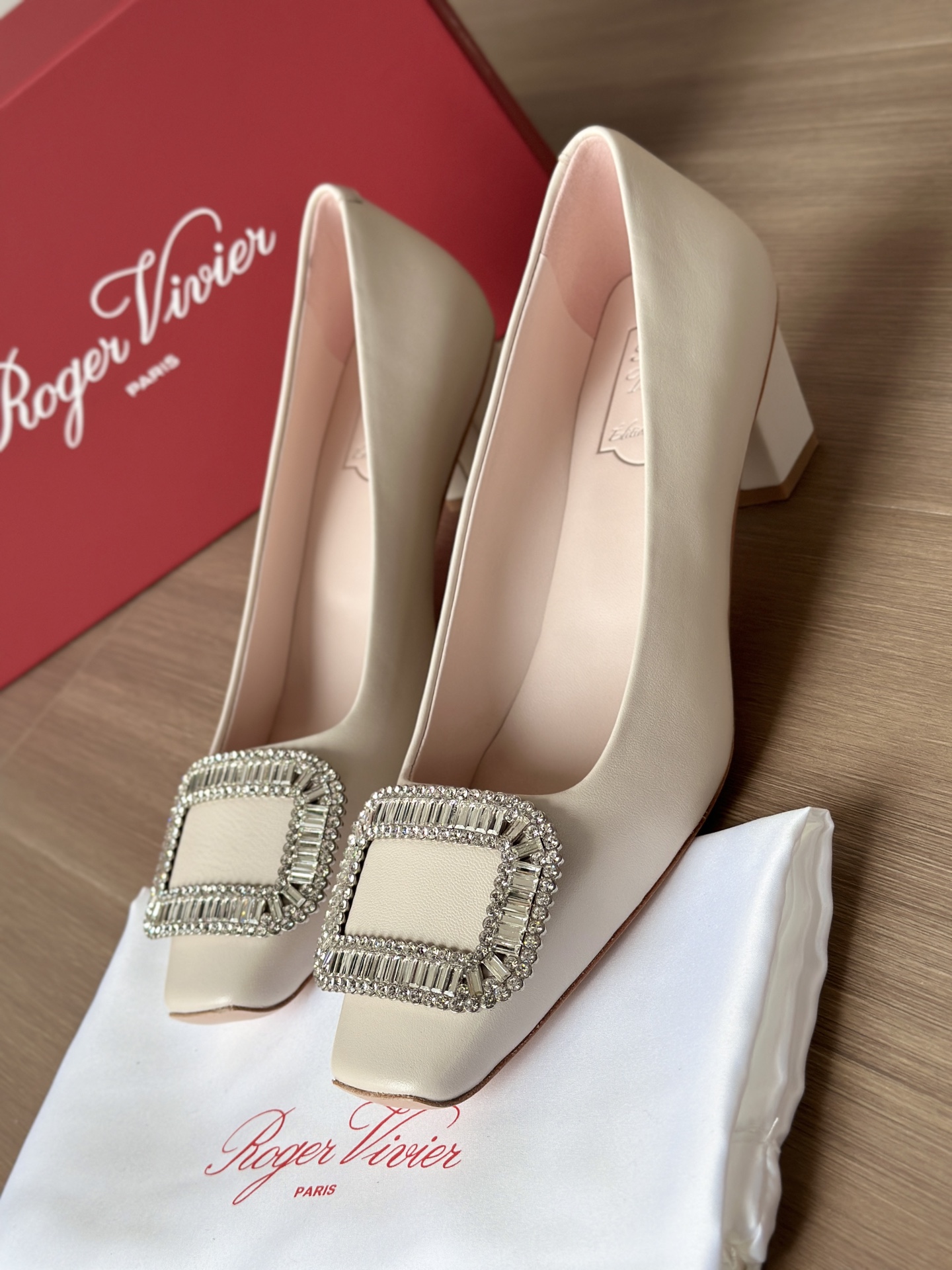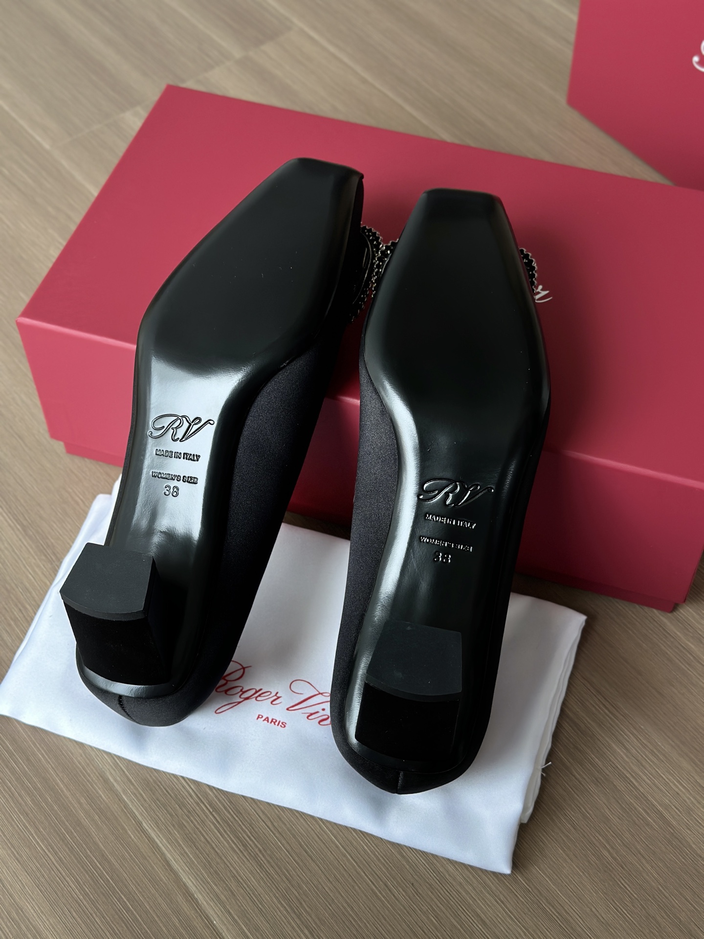 真丝面料丝滑细腻,脚感舒适一旦上脚就舍不得脱。整双鞋着地稳!施华洛世奇水钻,质感奢华!这款RV别出心裁的方钻扣设计搭配4.5cm经典小方跟,使得鞋子穿着更舒适,修饰腿型更修长