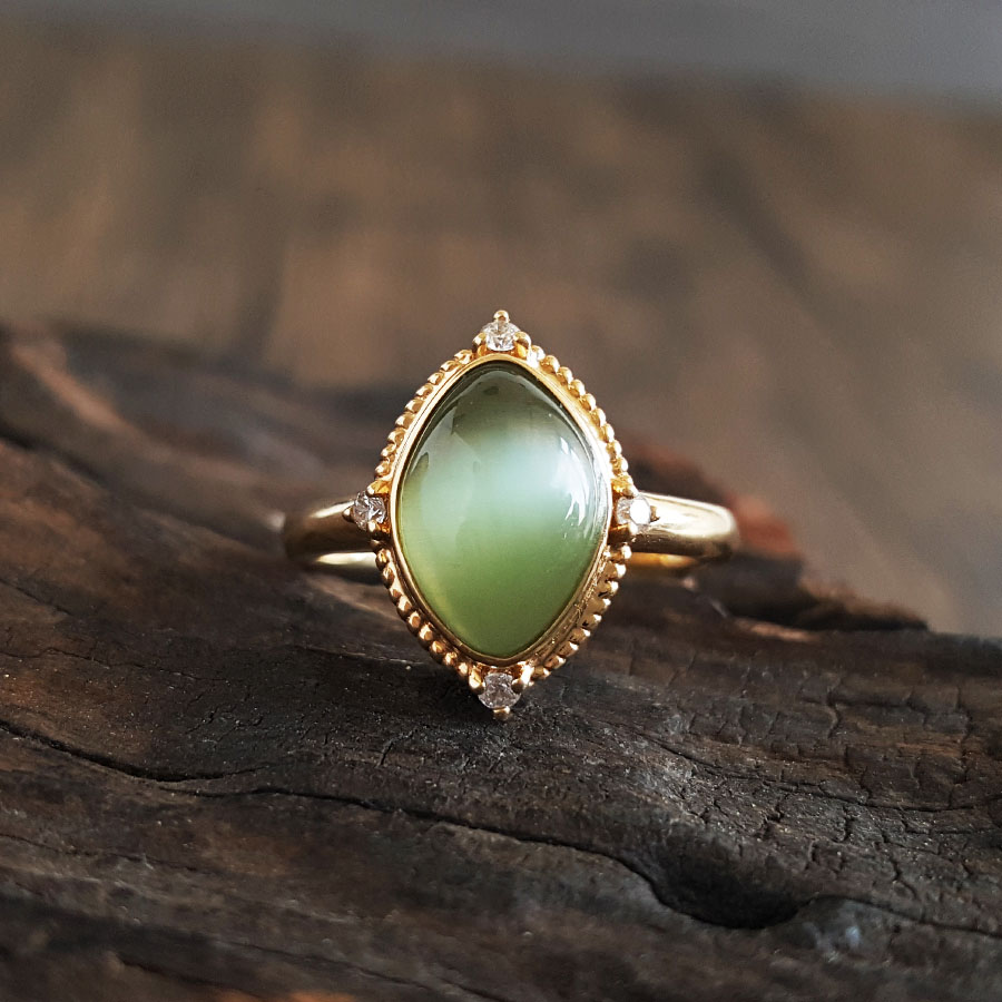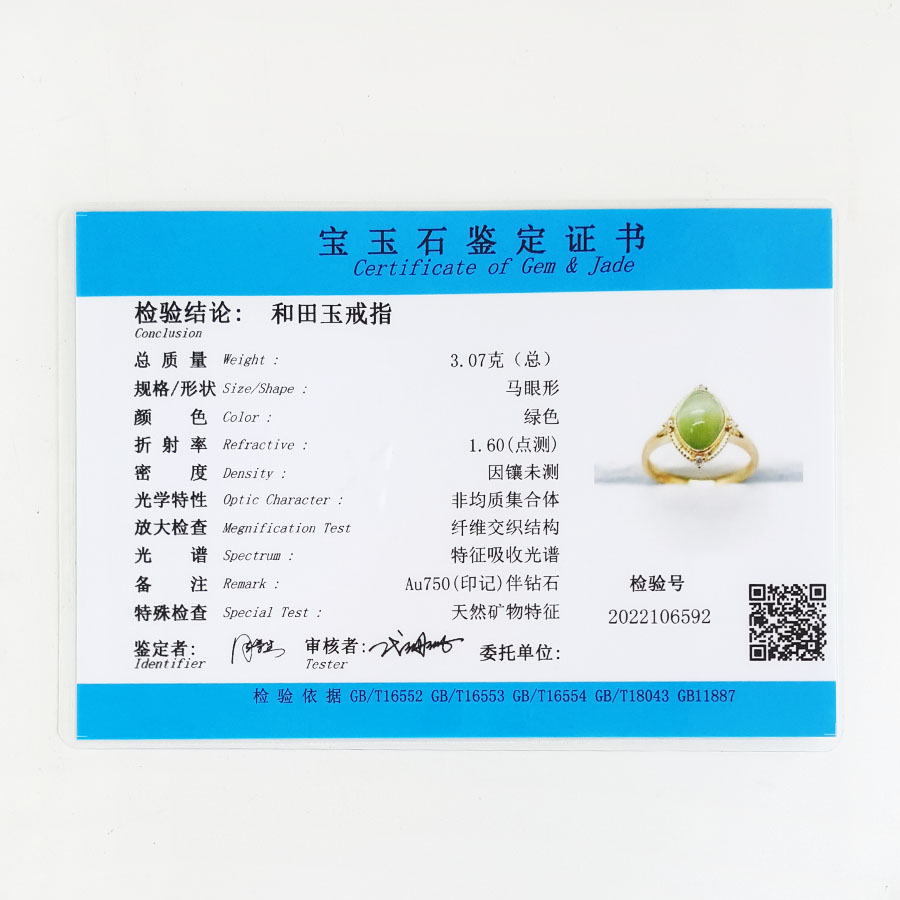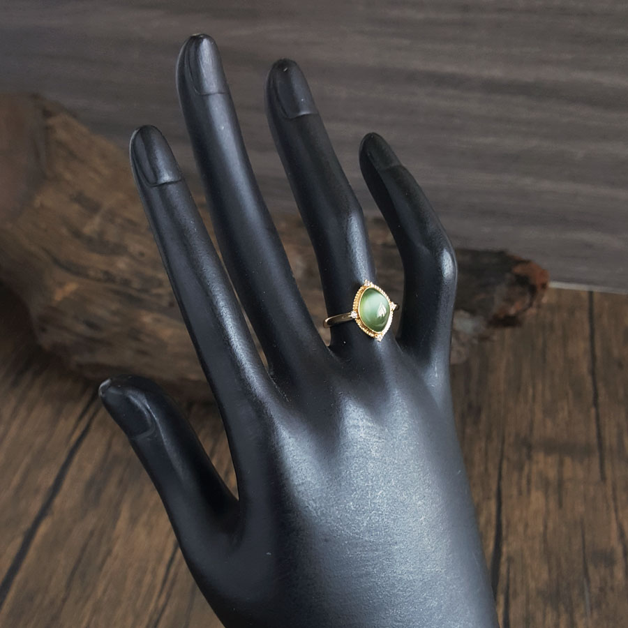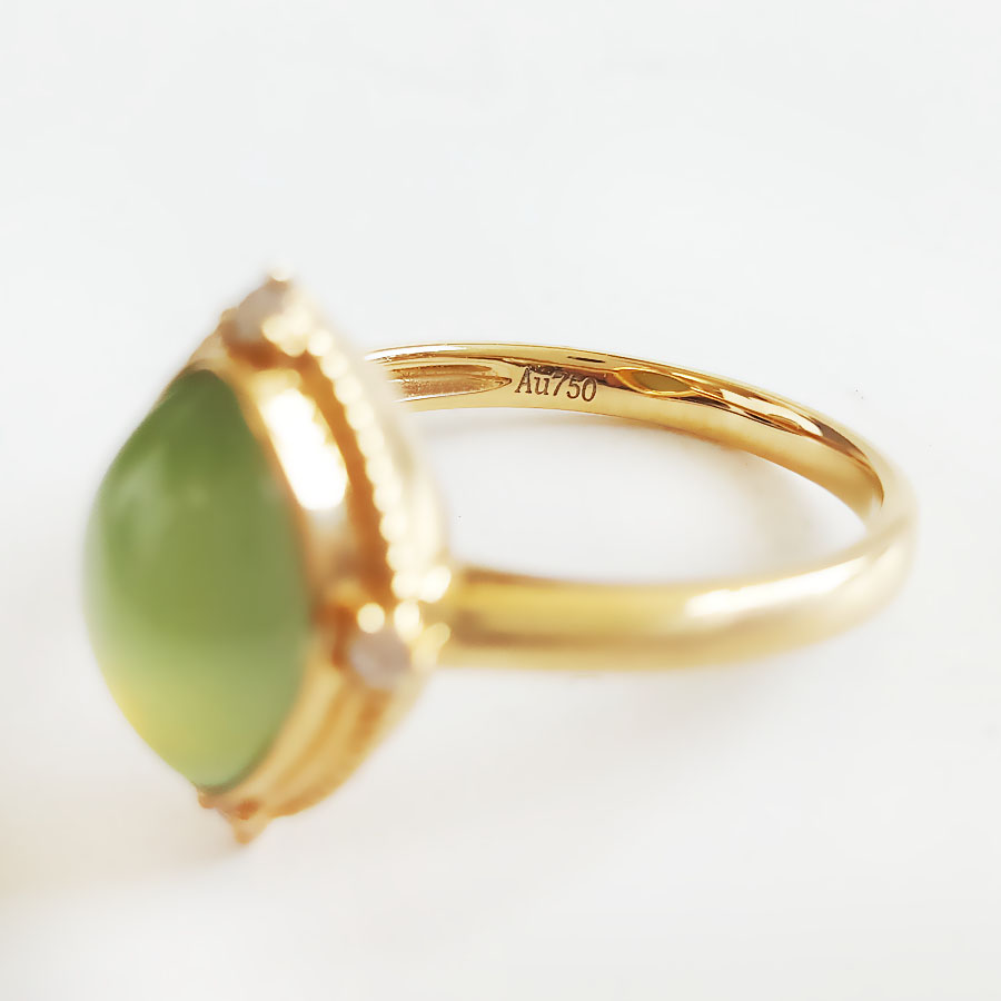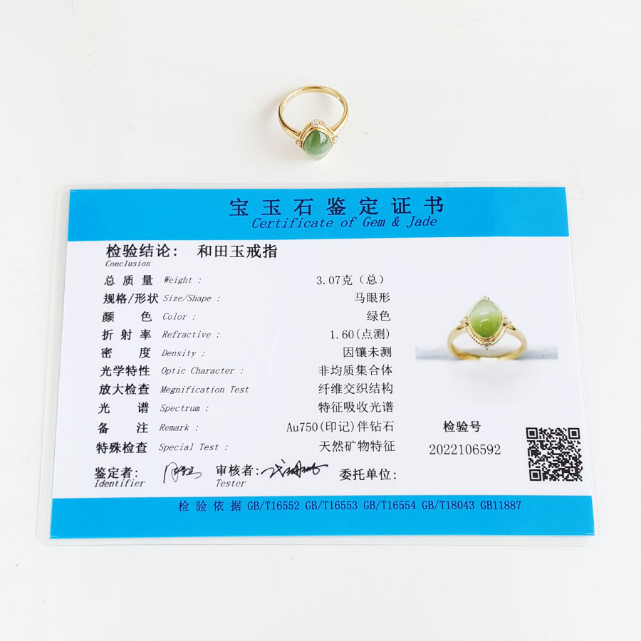 【天然正品】AU750精品黄金镶钻镶天然猫眼碧玉和田玉戒指050424NJM38