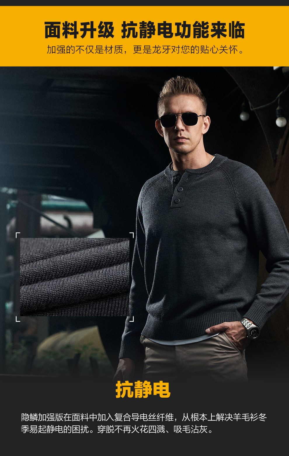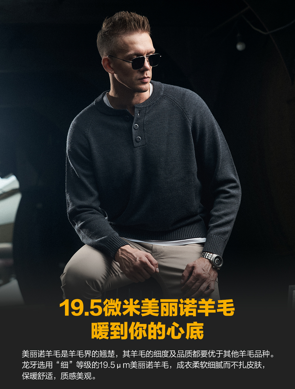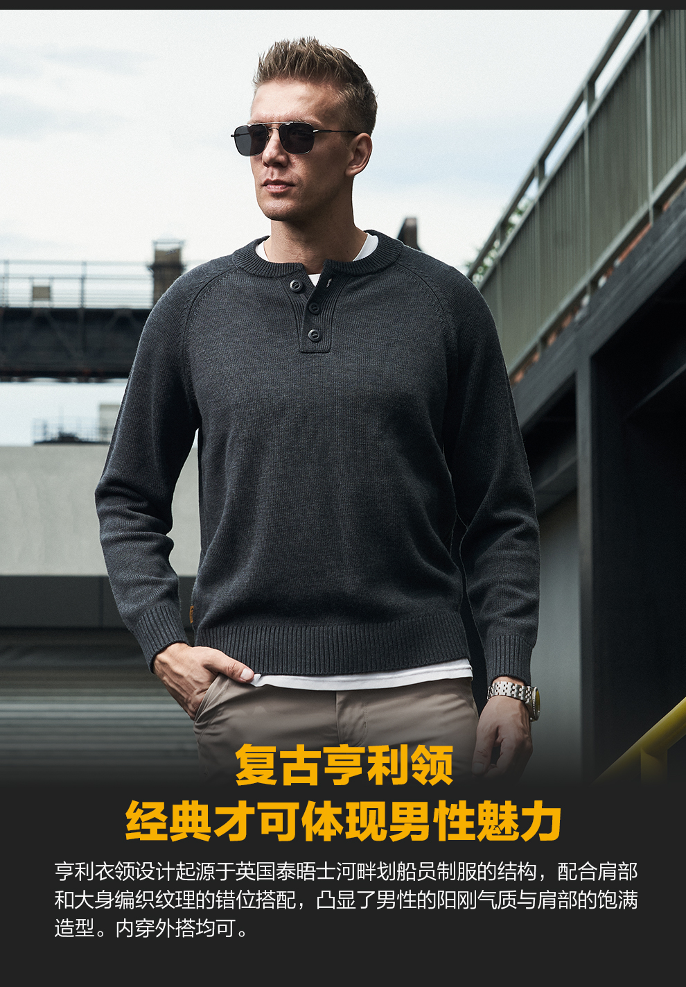 加强版隐鳞美丽诺羊毛亨利领套头毛衣加强版男士美利奴保暖羊毛衫