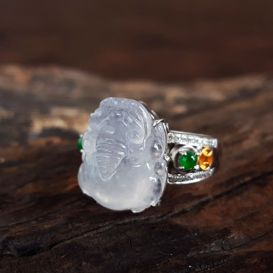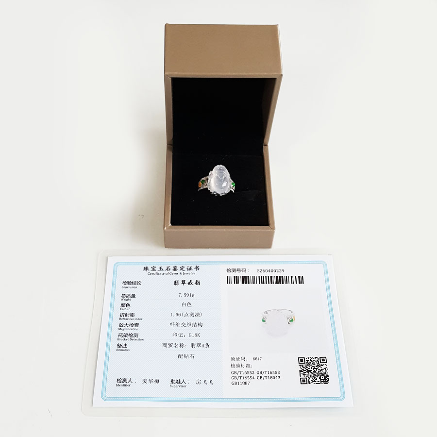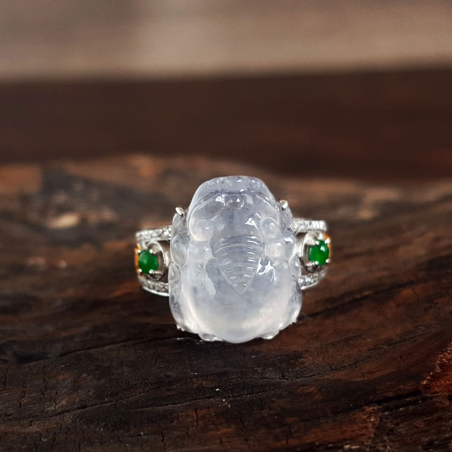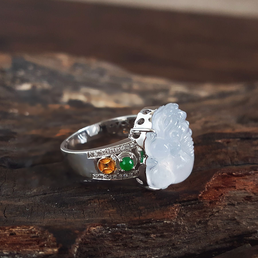 名称 | AU750收藏级白金镶钻镶天然细腻白色冰种瑞兽翡翠戒指 |
