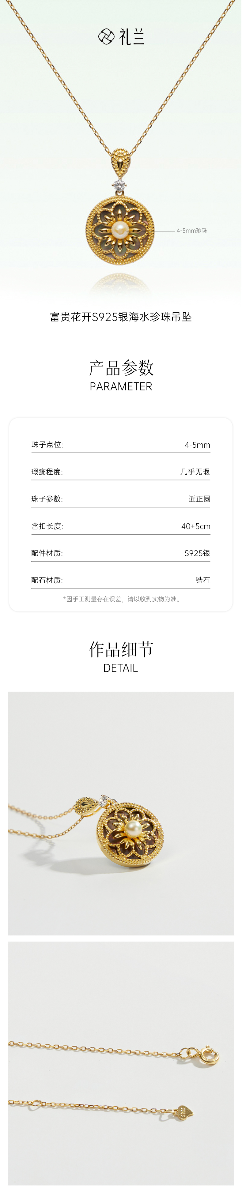 礼兰 富贵花开宫廷S925银akoya海水珍珠吊坠