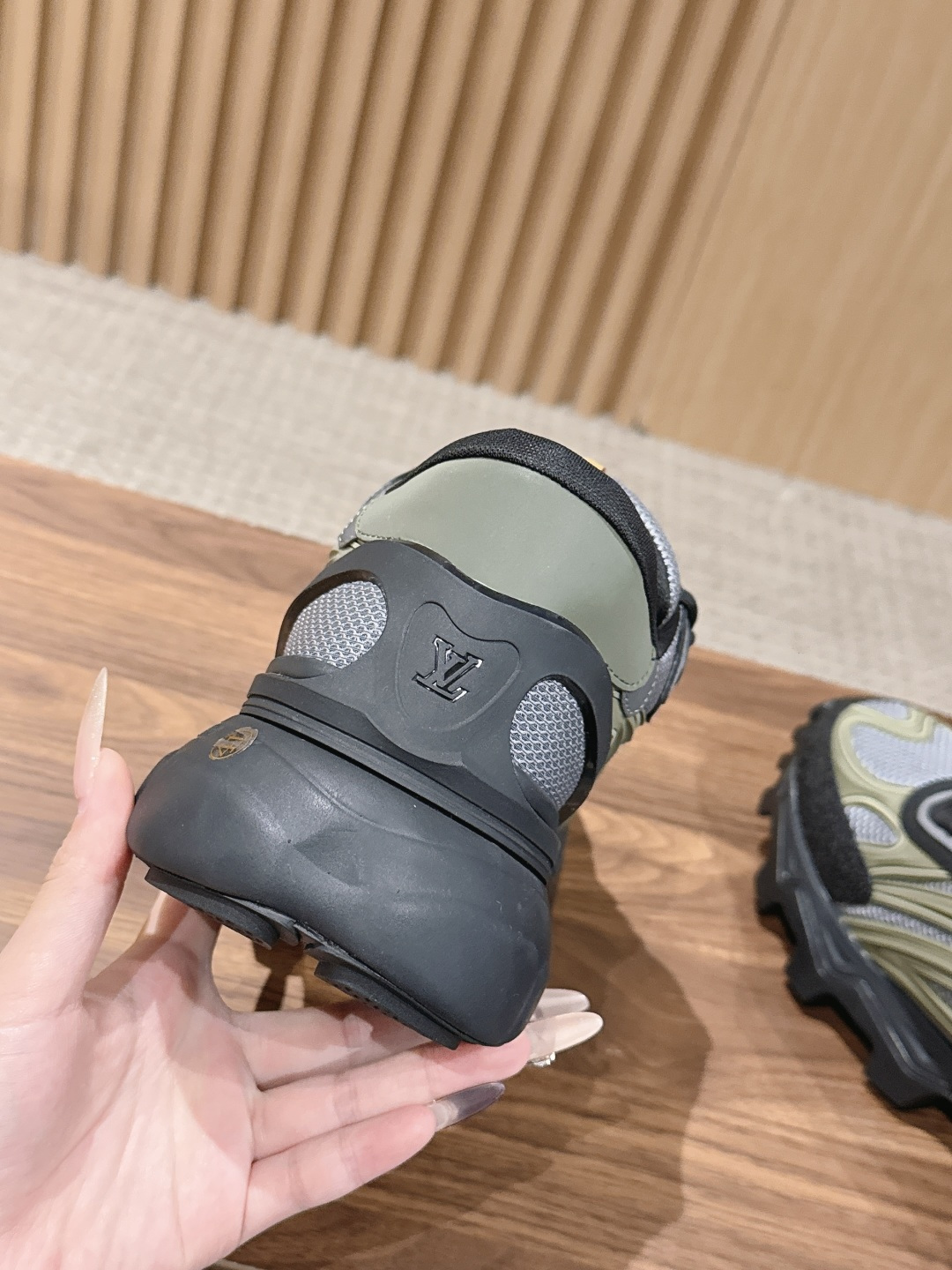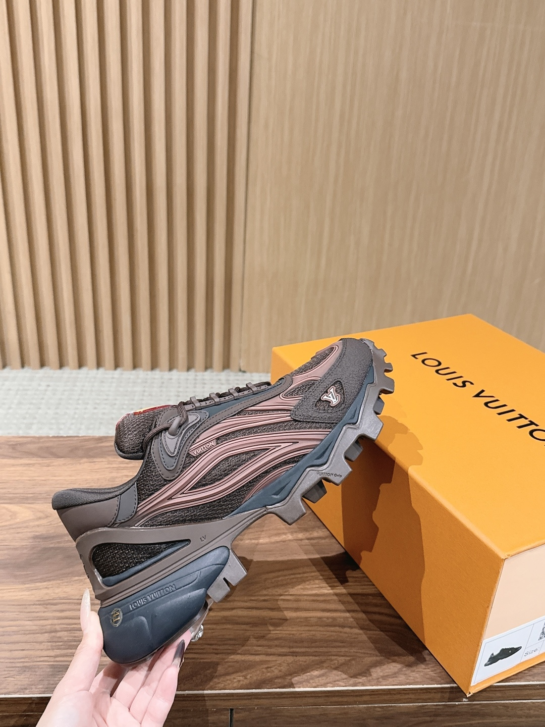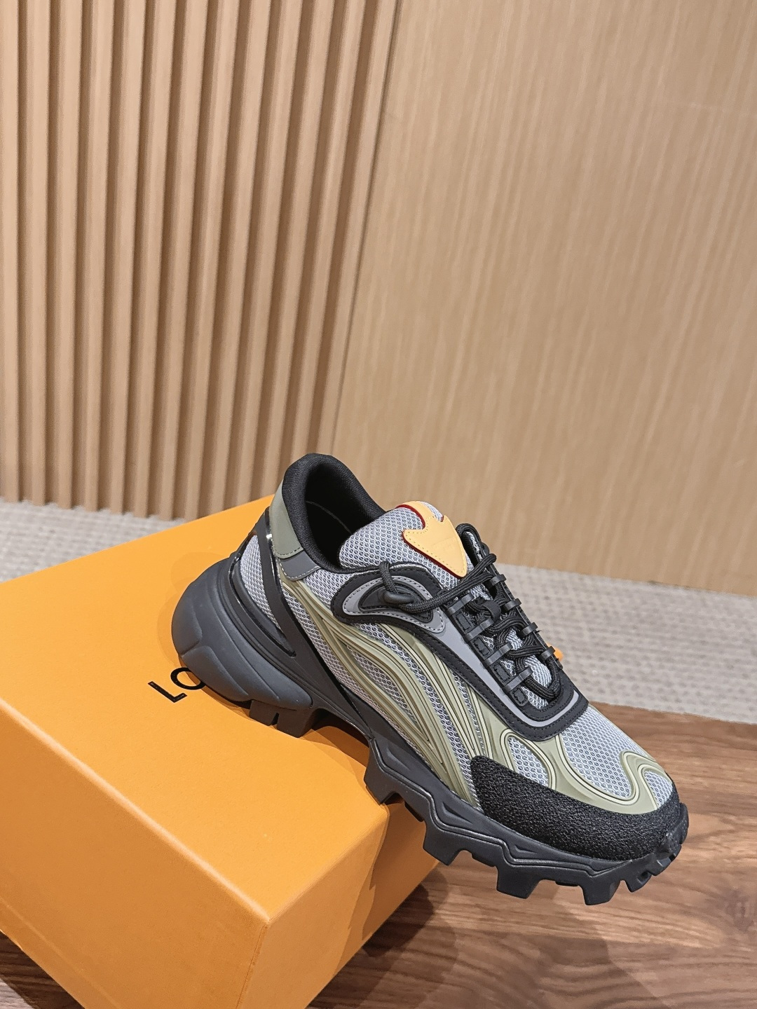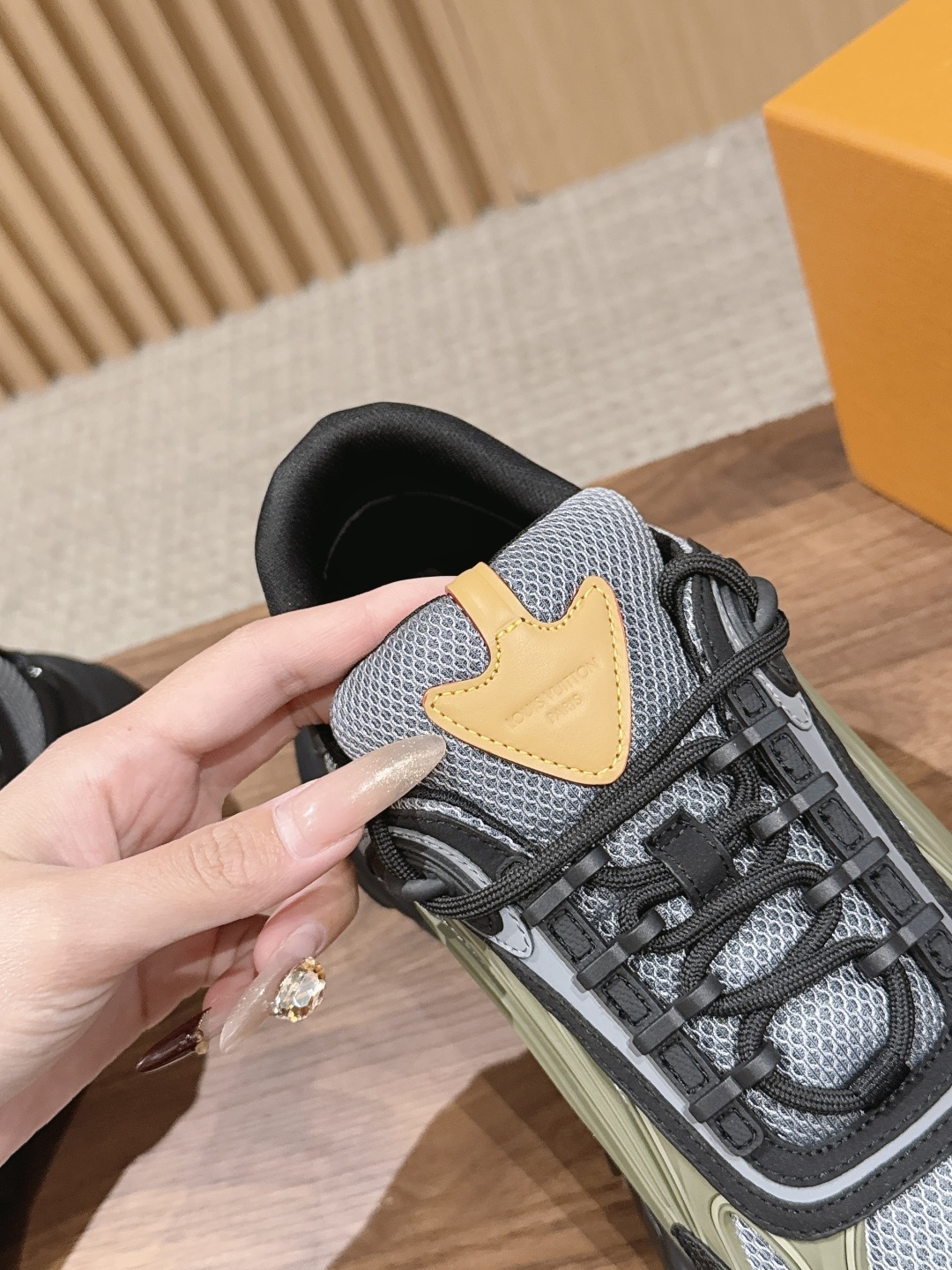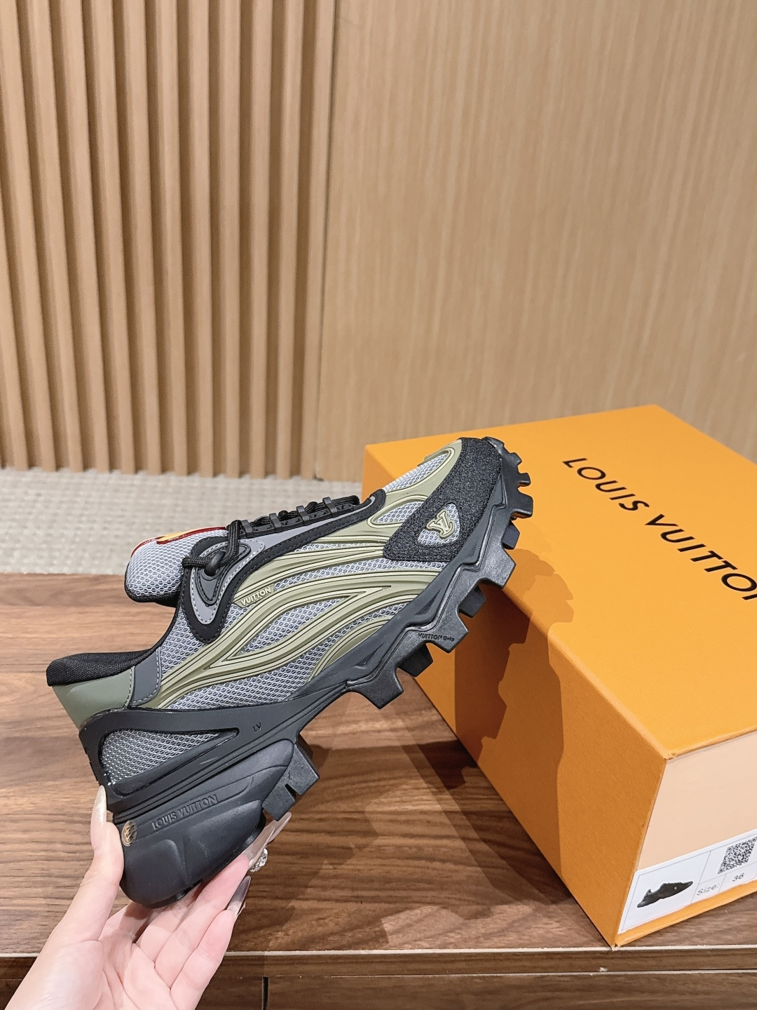 LV ✗ Pharrell Williams 菲董联名的2026新款男士运动鞋 黑色网布+橡胶材质,轻便又耐磨,厚底设计超有支撑力,日常穿搭或运动都OK!鞋面纹理+金属鞋带扣,细节满分,辨识度超高✨。菲董的创意加持,时尚与功能兼备,潮人必入! Size :39-46(46定制不退换)