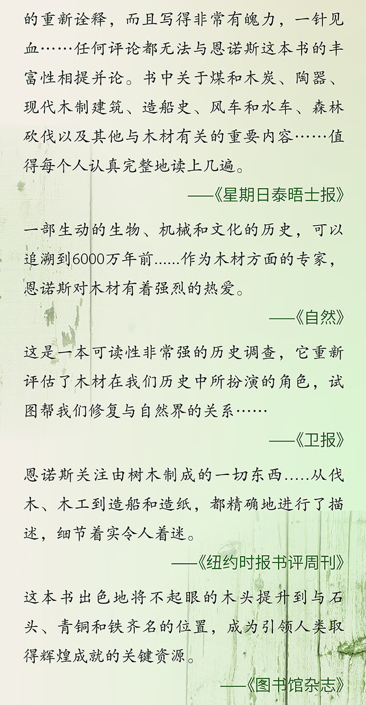 罗兰?6?1恩诺斯结合人类学、考古学、历史学、建筑学、工程学等领域的知识,将木材与文明深度融合,重新诠释了人类史,让我们了解到木材的独特属性如何对我们的身体、思想、社会生活产生至关重要的影响。以木材为中心去看待世界,可以帮助我们更清楚地想明白我们是谁、来自哪里、将前往何方。