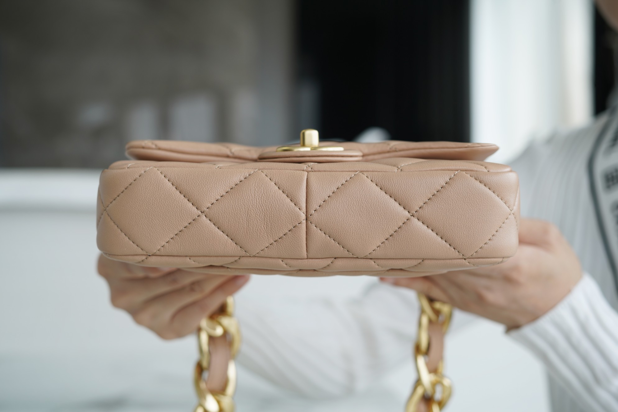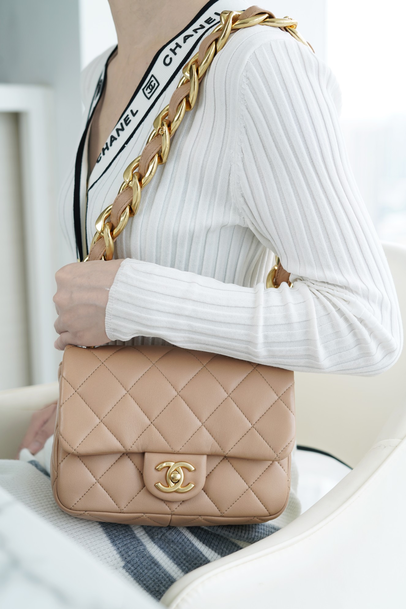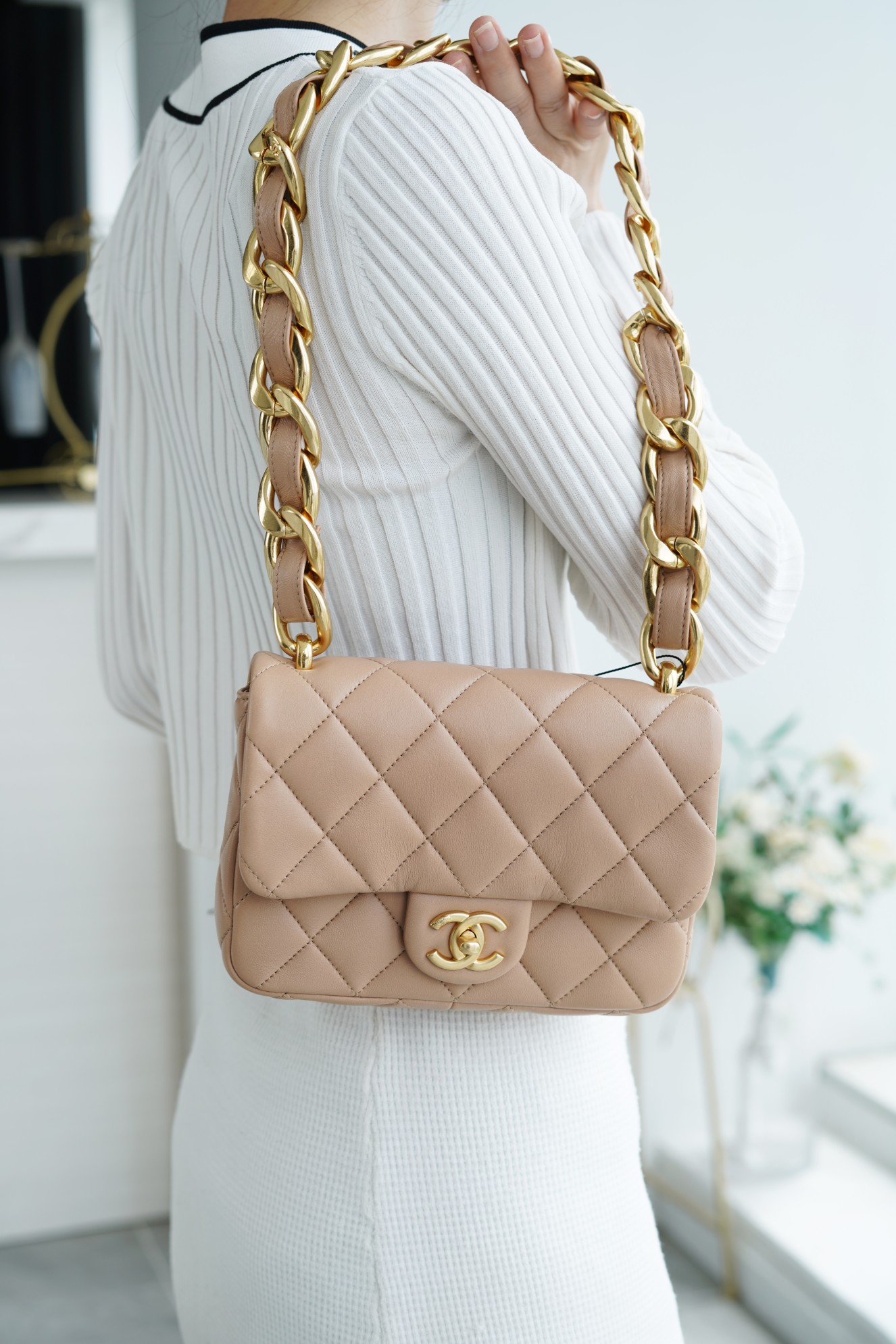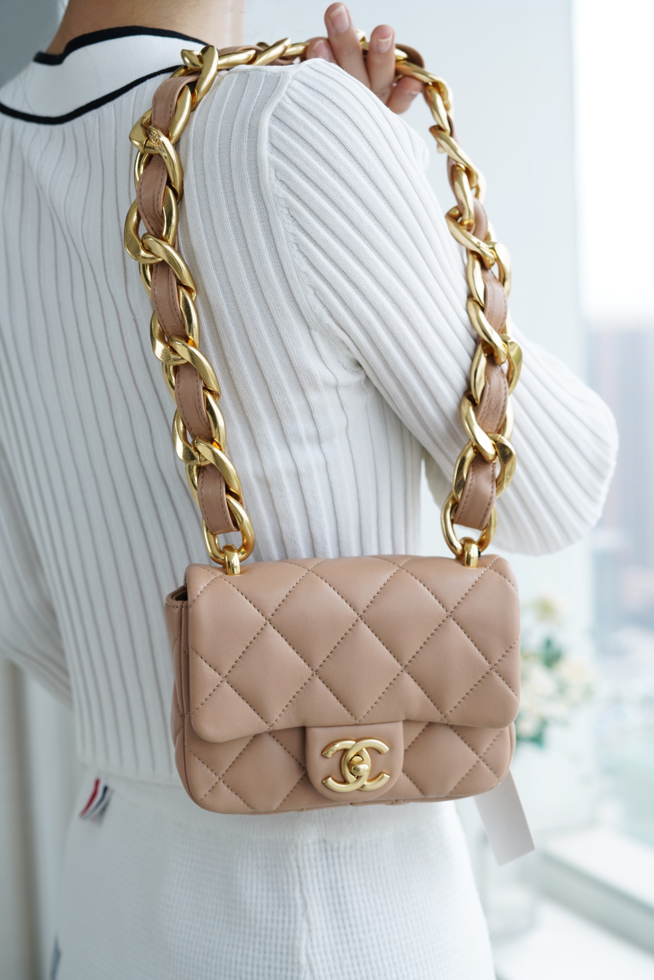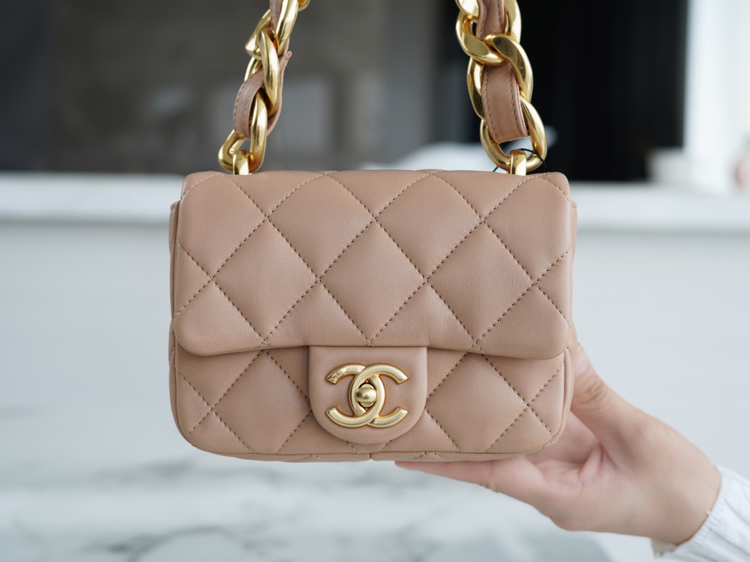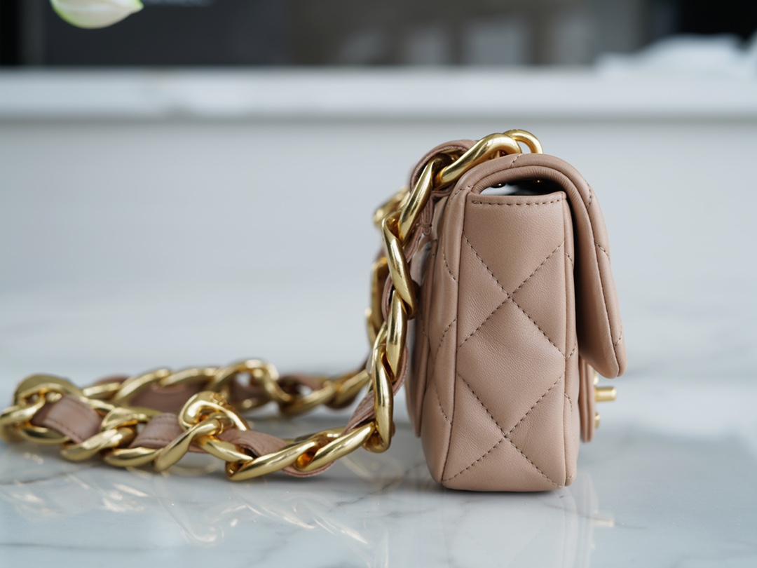 ???????????? ?????? 粗链条cf腋下包 奶茶色 ???????????? ????????春夏走秀款粗链条腋下包,意大利????《方框》原产小羊皮??、柔软而光滑,毛孔细腻,复古又百搭,可手拎可单肩,真的太洋翻了