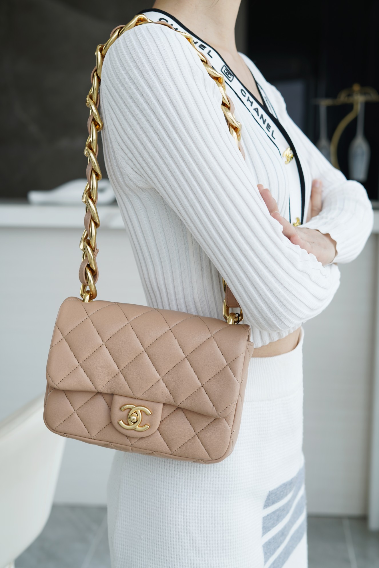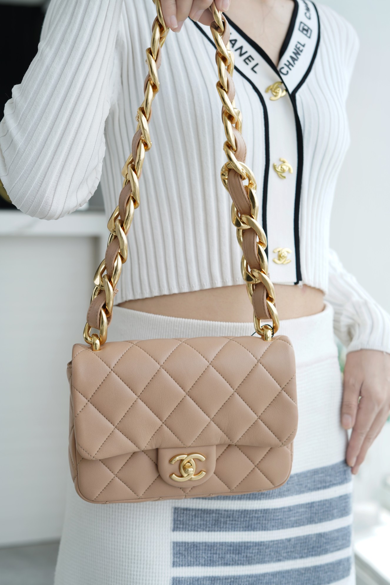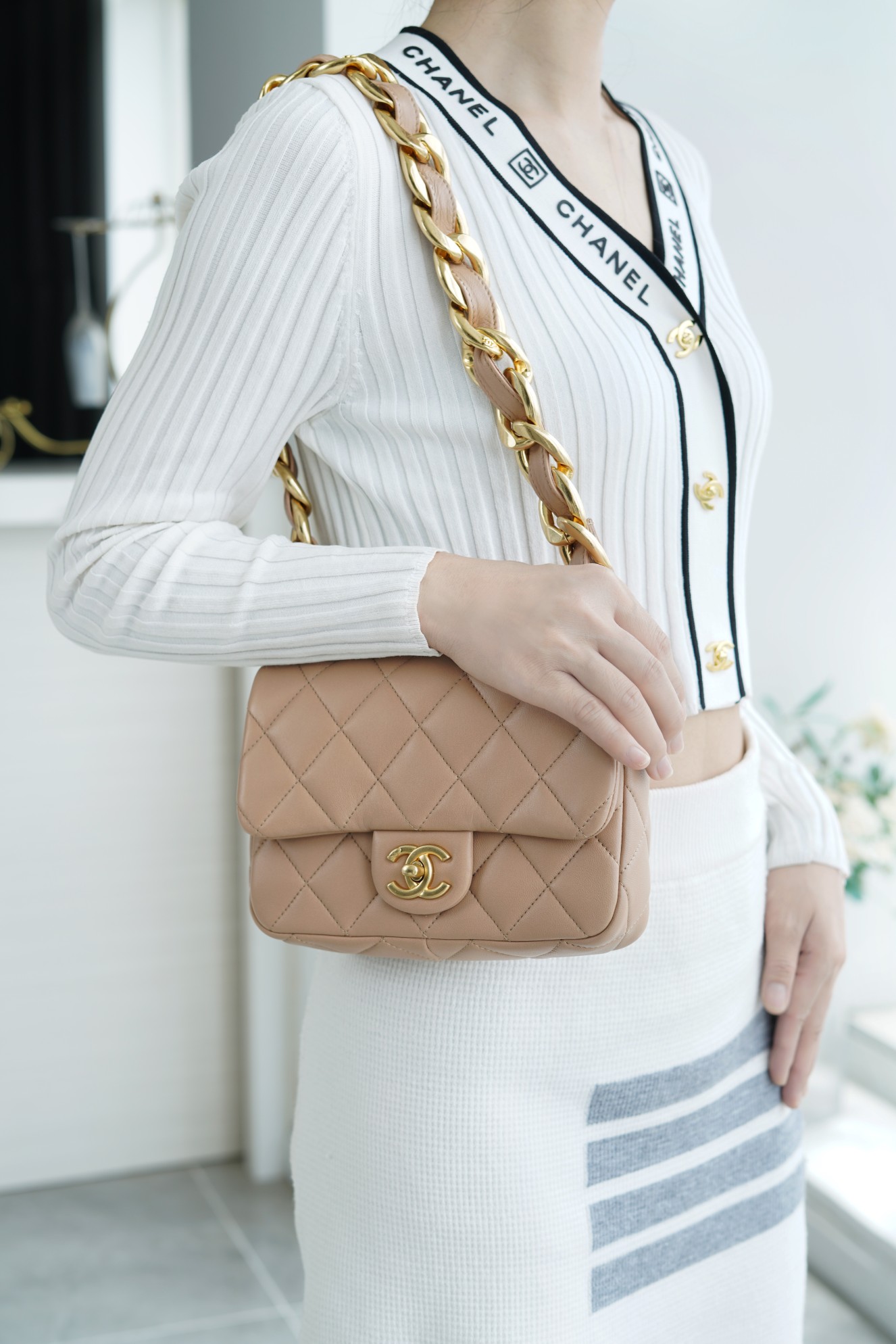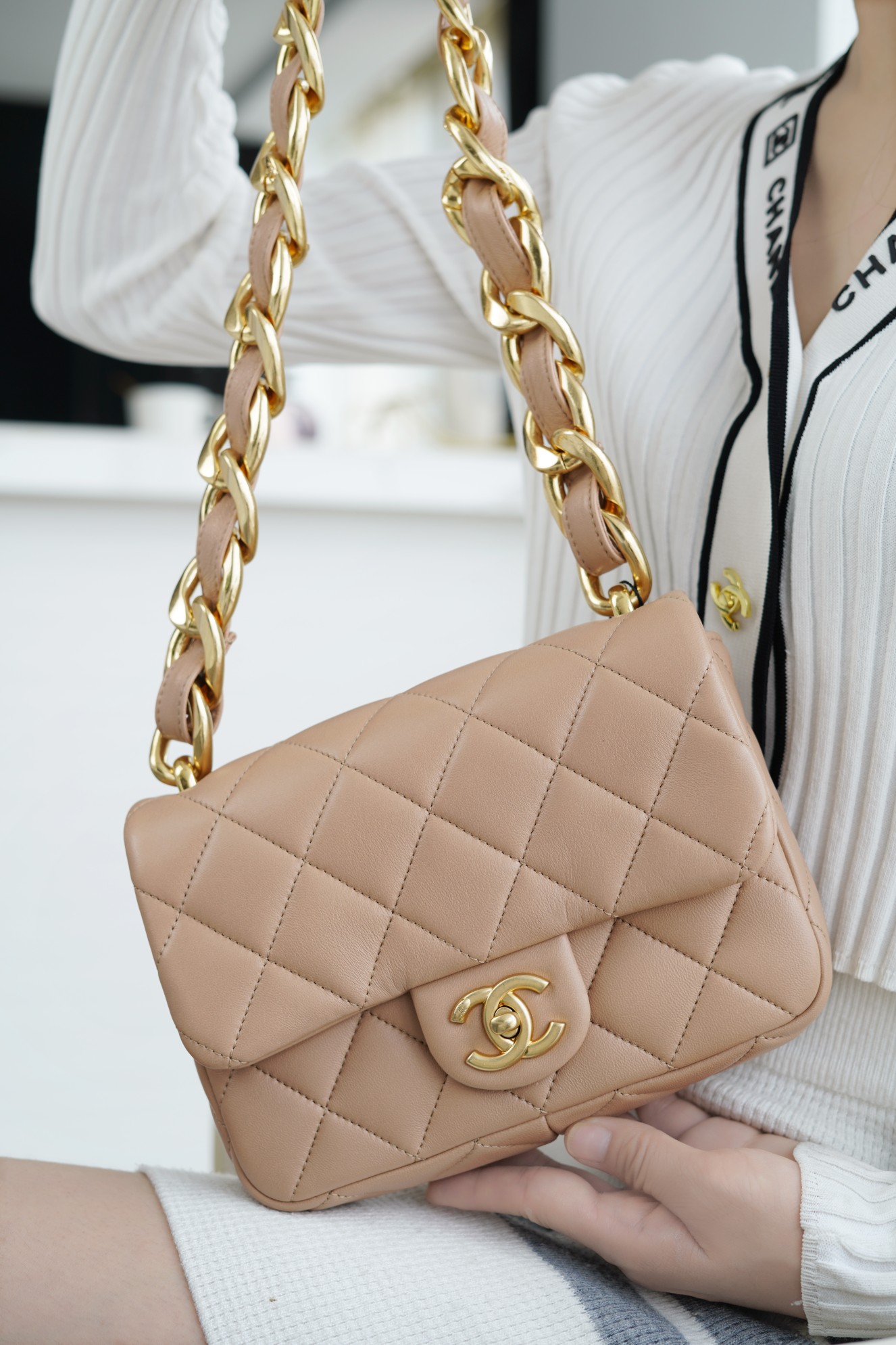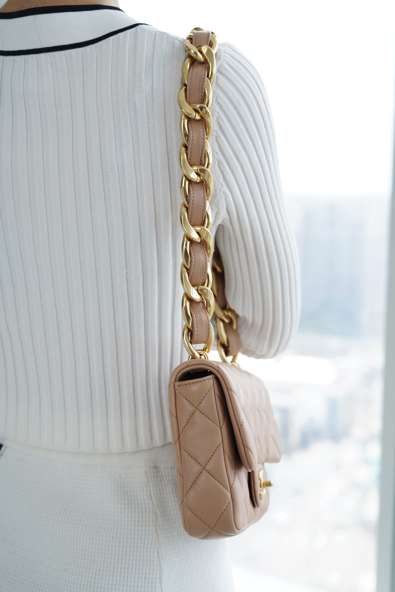 ???????????? ?????? 粗链条cf腋下包 奶茶色 ???????????? ????????春夏走秀款粗链条腋下包,意大利????《方框》原产小羊皮??、柔软而光滑,毛孔细腻,复古又百搭,可手拎可单肩,真的太洋翻了