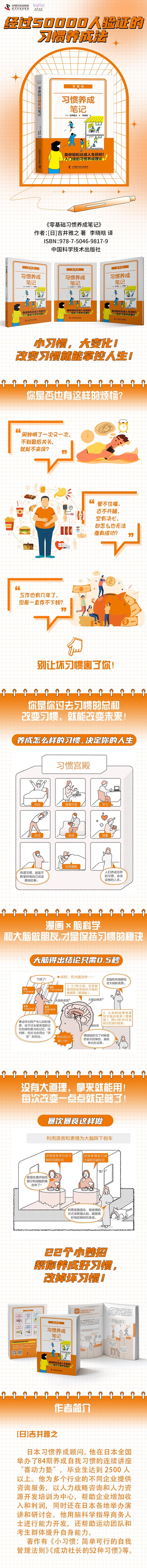 前?6?9 言 想要成为理想的自己 最重要的是先做做试试 感谢您阅读本书。 作为习惯养成顾问,我在17年间为5万人以上的企业经营者、以个体户为代表的商务人士、社团活动的学生以及广大考生,进行了实践训练。 至今为止,我在和为数众多的“成幸者a”打交道的过程中,发现了一些共同点。 这个共同点就是,所谓的“成幸”不是只有特别的人才能做到的,而是说无论是谁,只要你稍微意识到了这一点,坚持着试一试,就能够实现能力的提高,甚至能够改变自身周围的环境。 虽说所有人都是为了实现梦想而生,但也存在一些面对人生变得怯懦,或是由于错觉而对人生持否定态度的人。 我认为这是非常令人惋惜的。 就让我们以今天为起点,来改变通向大脑的路径,把“坏习惯”变成“好习惯”吧。 没关系的。请把这本《零基础习惯养成笔记》当作你人生路上的伙伴,如果遇到能给你带来启发的事情,无论是一件还是两件,都试着做做看吧。 如果你曾遇到以下情形,那么我尤其要推荐这本书给你。 “倒是有干劲,却总觉得事事不顺的人。” “设立过目标,迎接了挑战,却从未完成到底的人。” “认为自己的人生不顺是厄运使然的人。” “买了书却总也不读,只是摆在书架上的人。” “就算买了书开始读了,也一定会半途而废、不能读到最后的人。” “参加研讨会、学习会时情绪高涨,却完全不落实到具体行动上的人。不,是不知道该如何行动的人。” “按照别人说的、按照指南教的、按照所学的做了,却感到只有自己一无所获的人。” “树立了目标,却感到有负担,被‘必须做’的责任感束缚,对实现目标失去兴致和期待的人。” “有梦想,却没有勇气踏出第一步的人。” 请一定把这本书读到最后。 “这我好像能做到!”“这么简单就可以?”尝试从会让你有这些感觉的事情做起,这才是最重要的。 没关系的。无论是什么人,都是可以改变的。你会不断地进步。 你的大脑这个硬盘和周围其他人的没有什么不同。让我们从你的硬盘上删除“坏习惯软件”,安装上“通向成功的软件”“实现自我的软件”吧。 你是自己人生的经营者。作为自己人生股份有限公司的董事长,经营你的人生应当是你毕生的事业。 不管是在家庭中,还是在工作现场,无论是要把人生过得丰富多彩,还是要安于现状,都取决于你自己。 也正因为这一切都取决于你自己,你才能自由地做出改变。 请让我们一起,来更好地改变人生、成就理想的自己吧。 口号是……没关系, 你,不是一个人在战斗。 简单任务(Simple task)有限公司 董事长吉井雅之