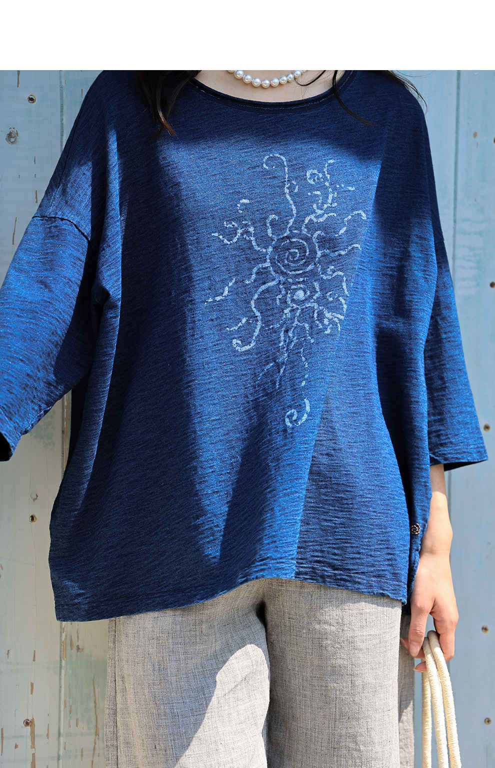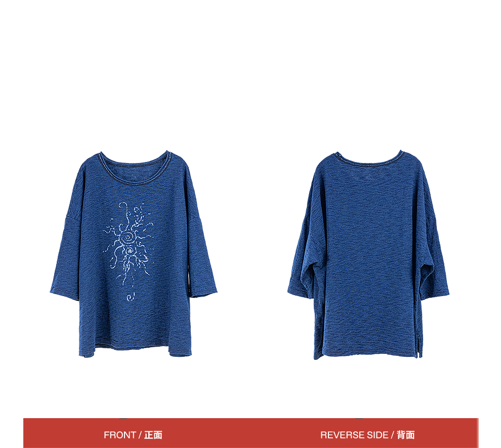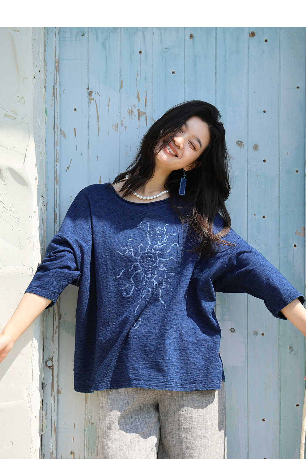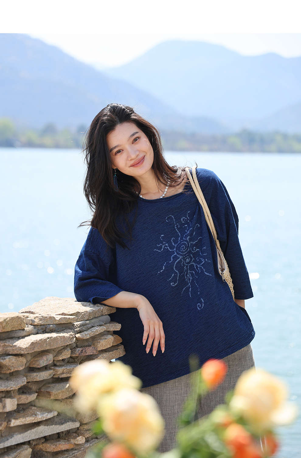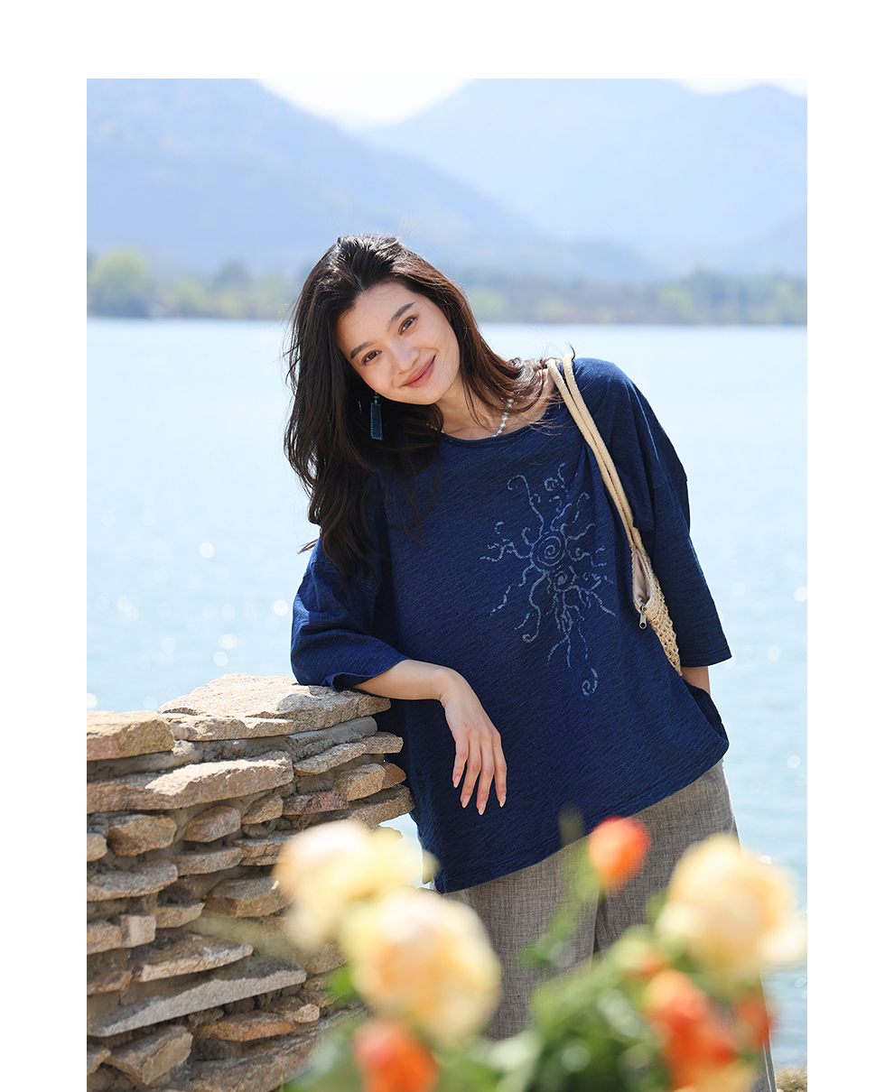 绽放旅行女装232朵/竹节棉针织蓝螺旋手绘花落肩八分袖T恤短袖女