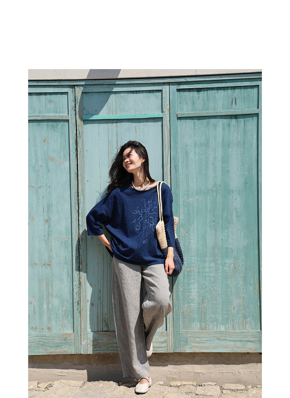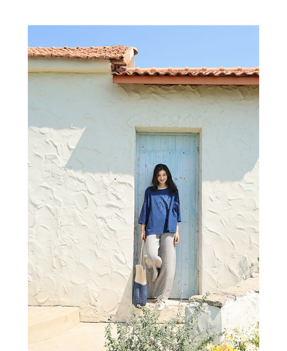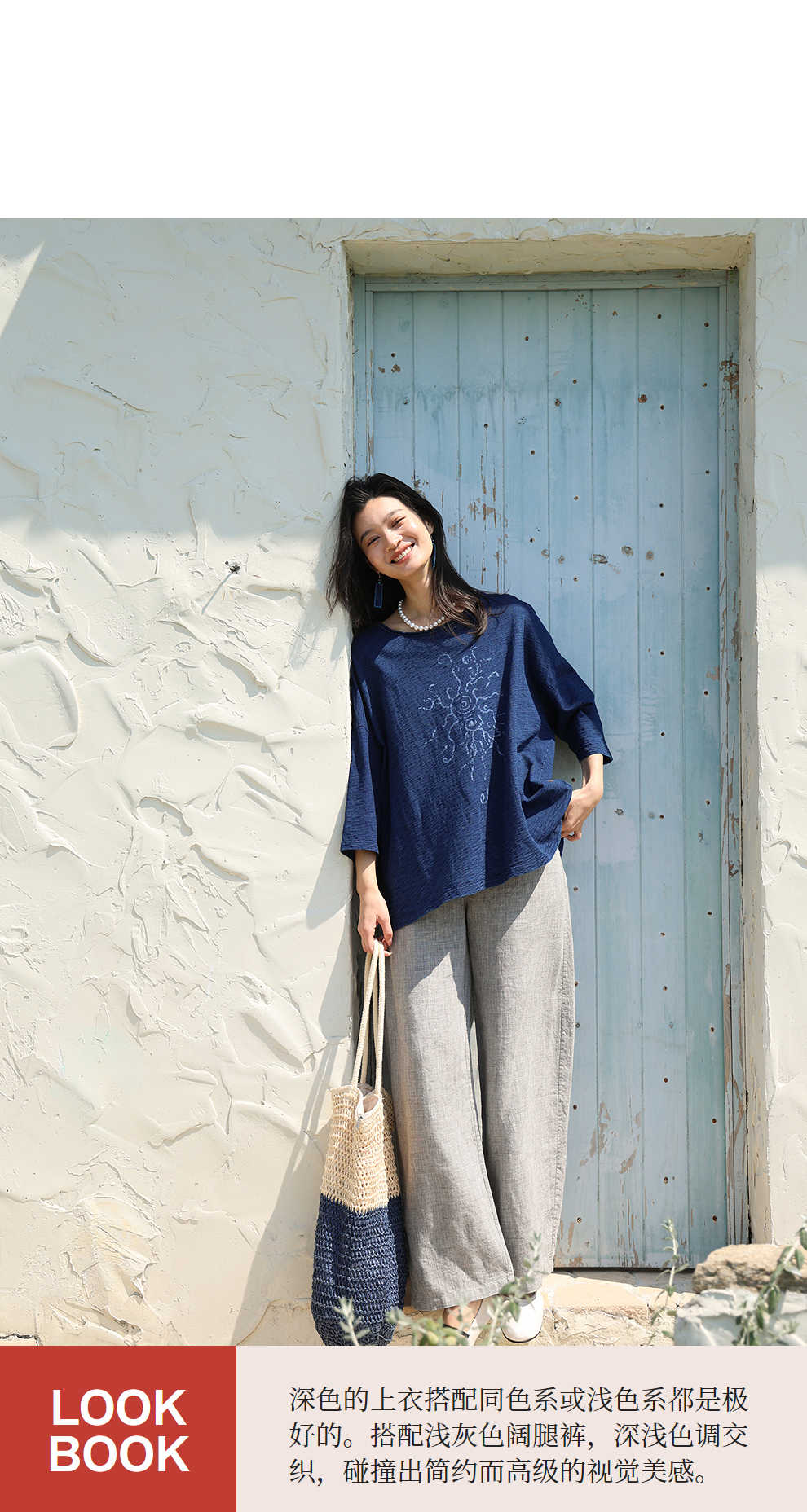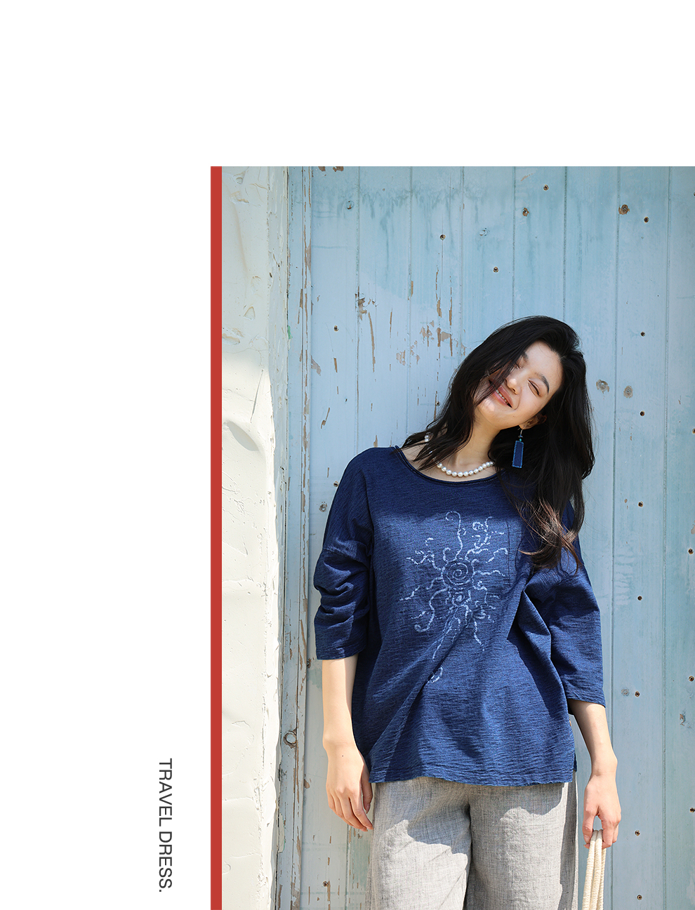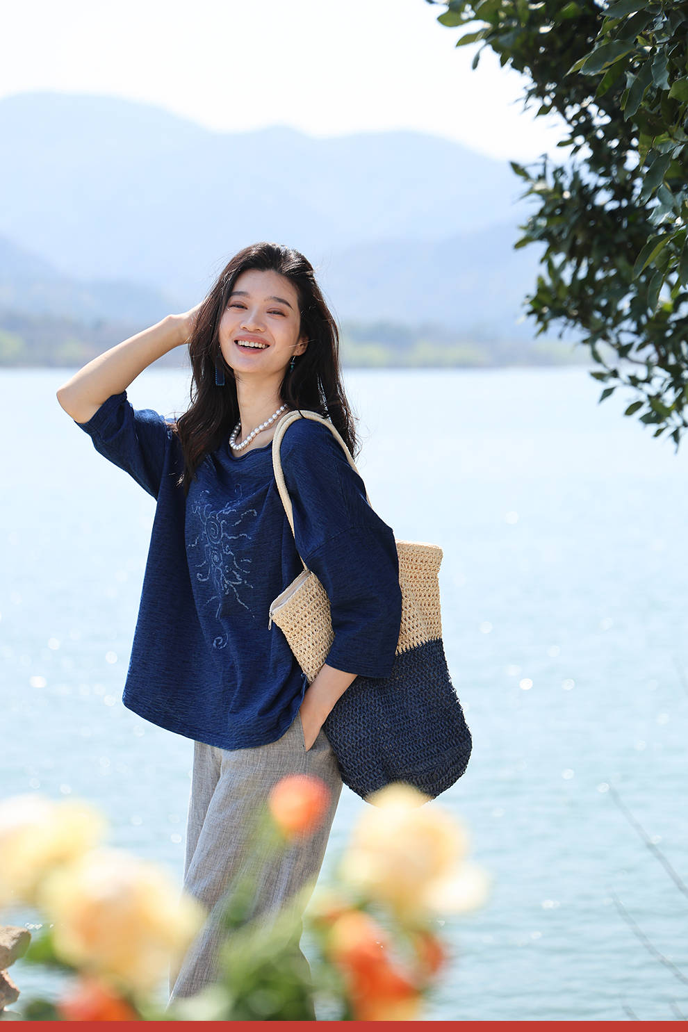 绽放旅行女装232朵/竹节棉针织蓝螺旋手绘花落肩八分袖T恤短袖女