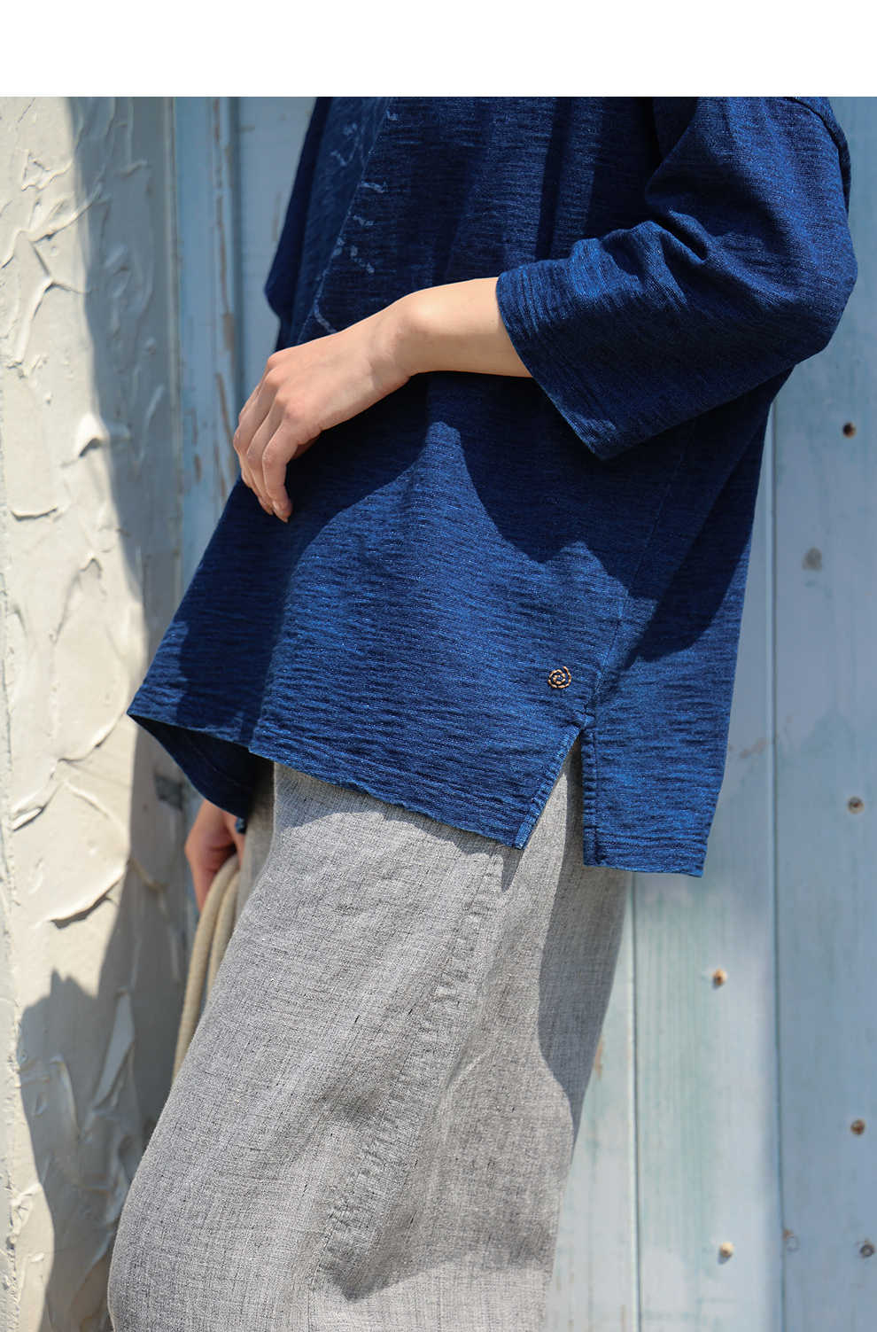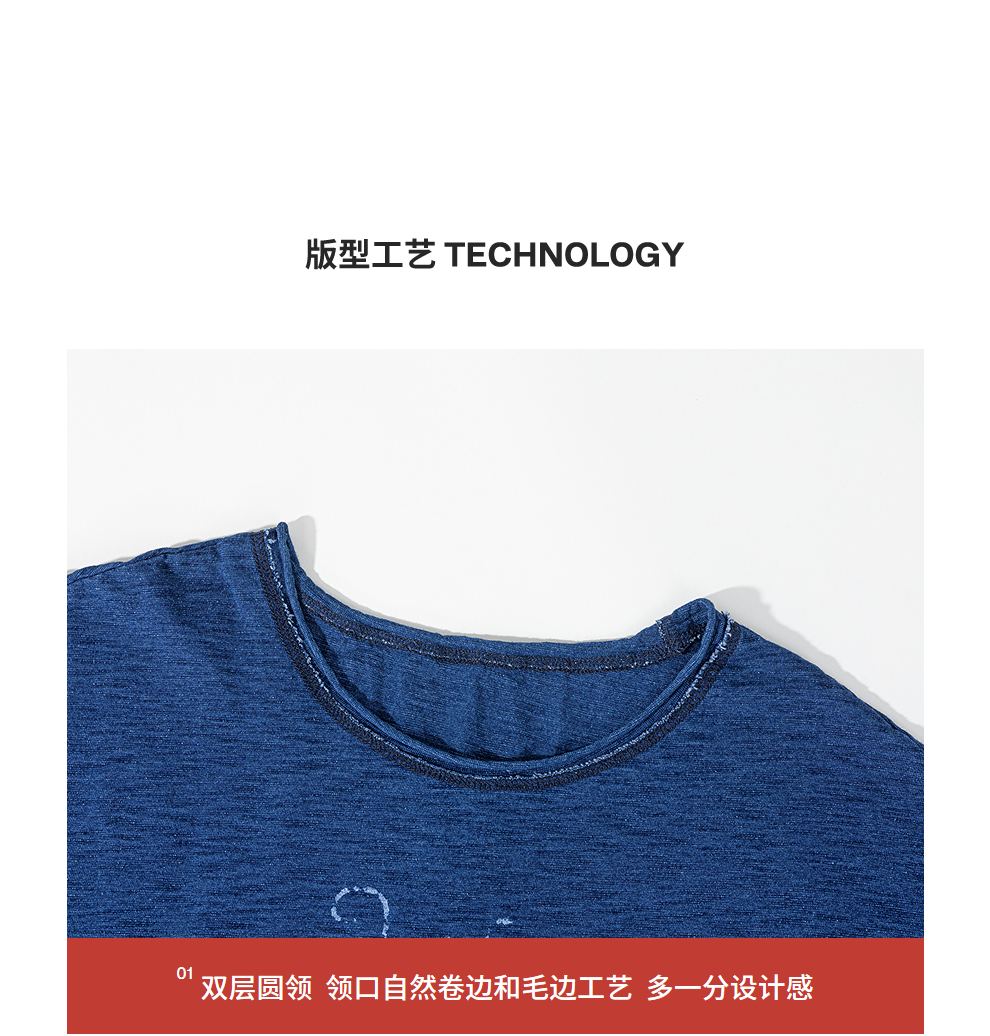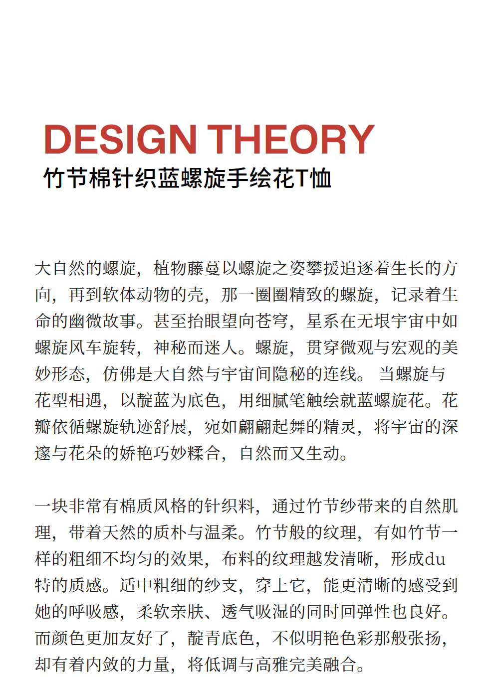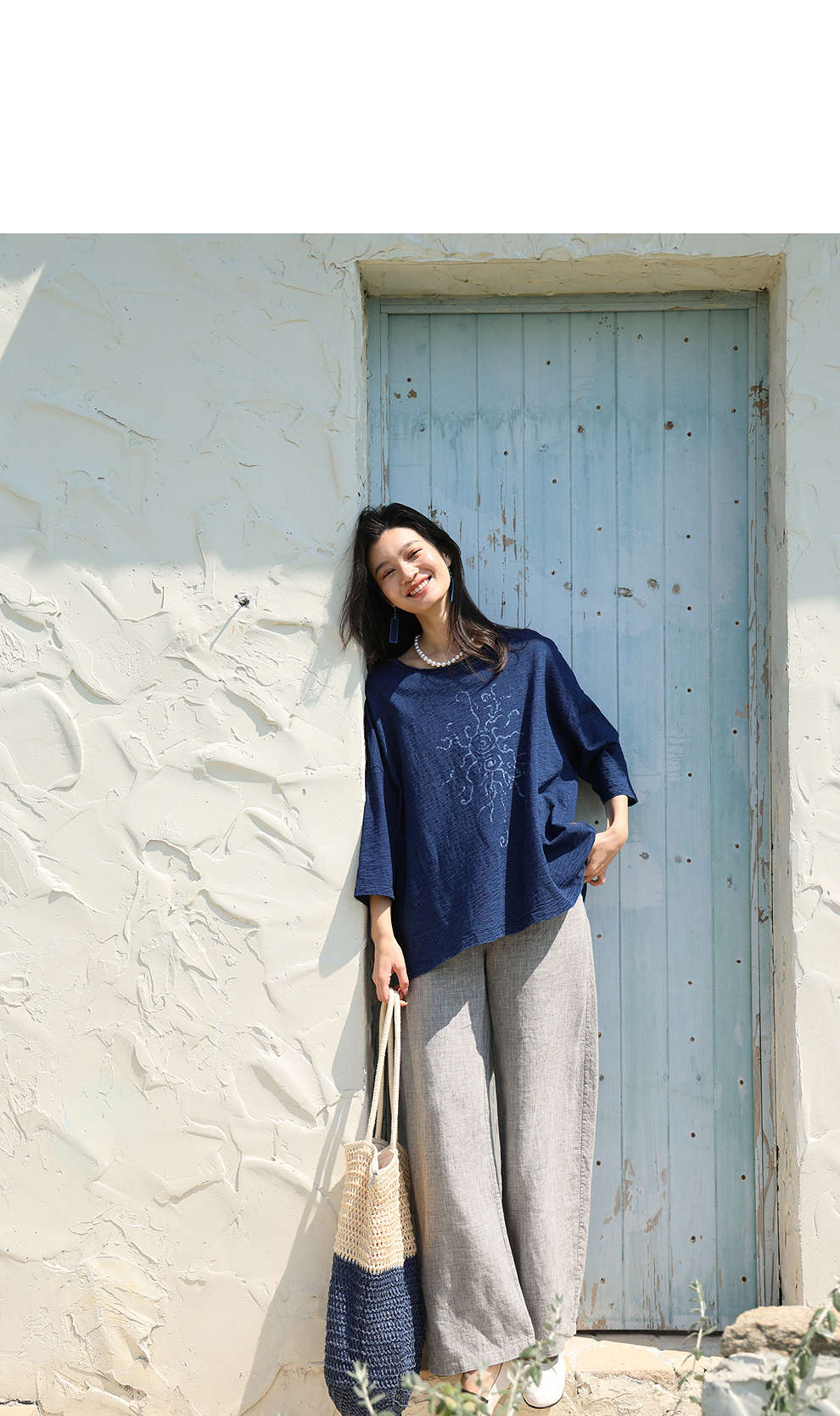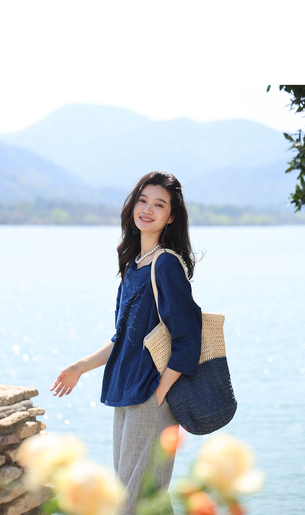 绽放旅行女装232朵/竹节棉针织蓝螺旋手绘花落肩八分袖T恤短袖女