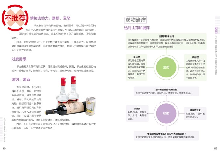 饮食是健康的基础,没病别吃出病,患病也可以通过饮食调理帮助恢复,所以帮助读者弄明白怎么吃更有利于健康、怎么吃不利于疾病康复是本书的立足点。本书通过告诉读者如何优选食物、哪些食物要少吃或不吃,以预防甲状腺疾病;同时又针对常见甲状腺疾患人群,如甲状腺功能亢进、甲状腺功能减退、甲状腺炎、甲状腺肿等,给予饮食调养、生活调养、具体用药指导,来辅助治疗疾病、改善不适症状。但是,千万不要对照书本找疾病,硬给自己扣上“患病”的帽子,徒增不必要的心理负担。