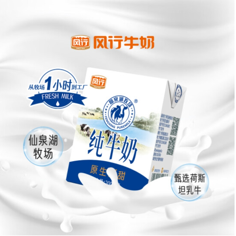 风行仙泉湖牧场纯牛奶200ml*12盒/箱