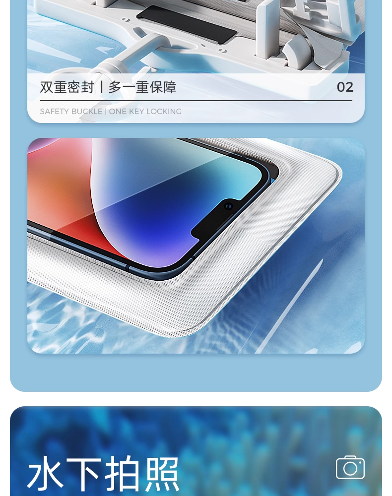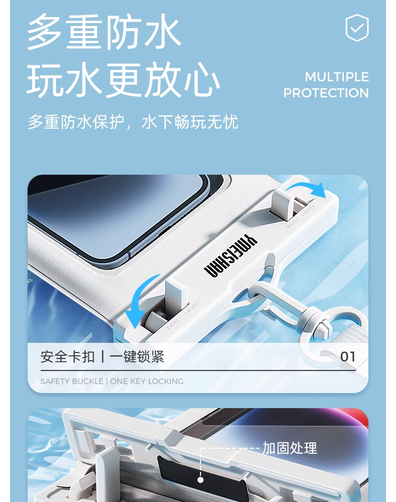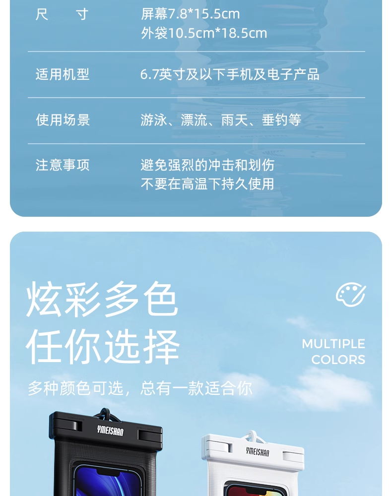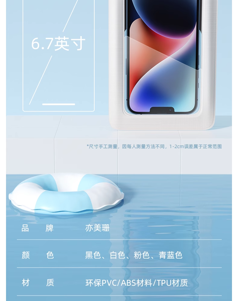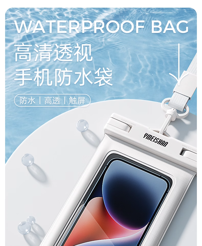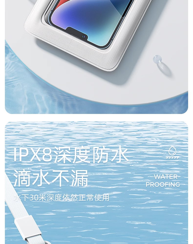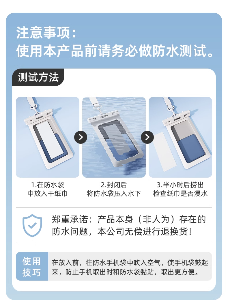 注:防水手机袋请务必在签收 7 日内,按照如下步骤先进行防水测试,如测试有问题,请及时反馈售后,超期及使用过程中出现的任何问题,将不再售后(1.在防水袋中放入干纸巾。2.封闭后将防水袋压入水中。3.半小时后捞出,检查纸巾是否浸水。)