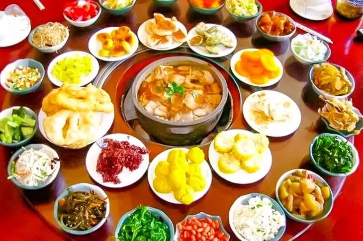 四周配以具有农家特色的三个辅锅,三个小碗,六个凉菜,取三羊开泰、四平八稳、六六大顺之意以传统制作工序和制作工艺进行加工制作—以豆腐为主,以其他菜肴为辅—着重于美容、养颜、滋补。