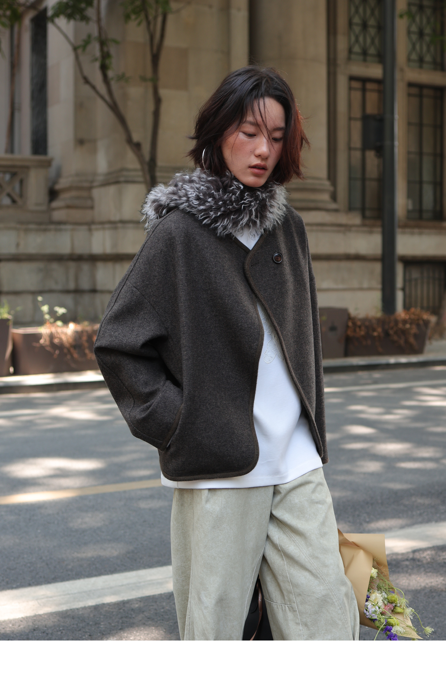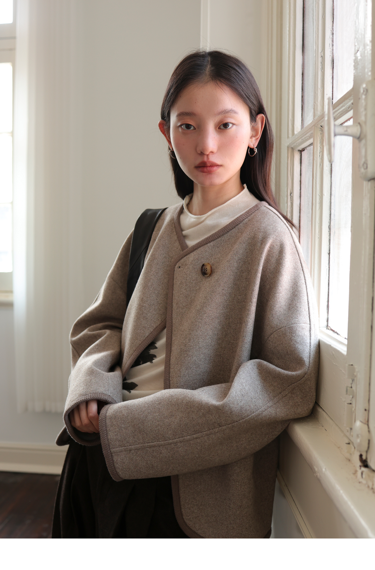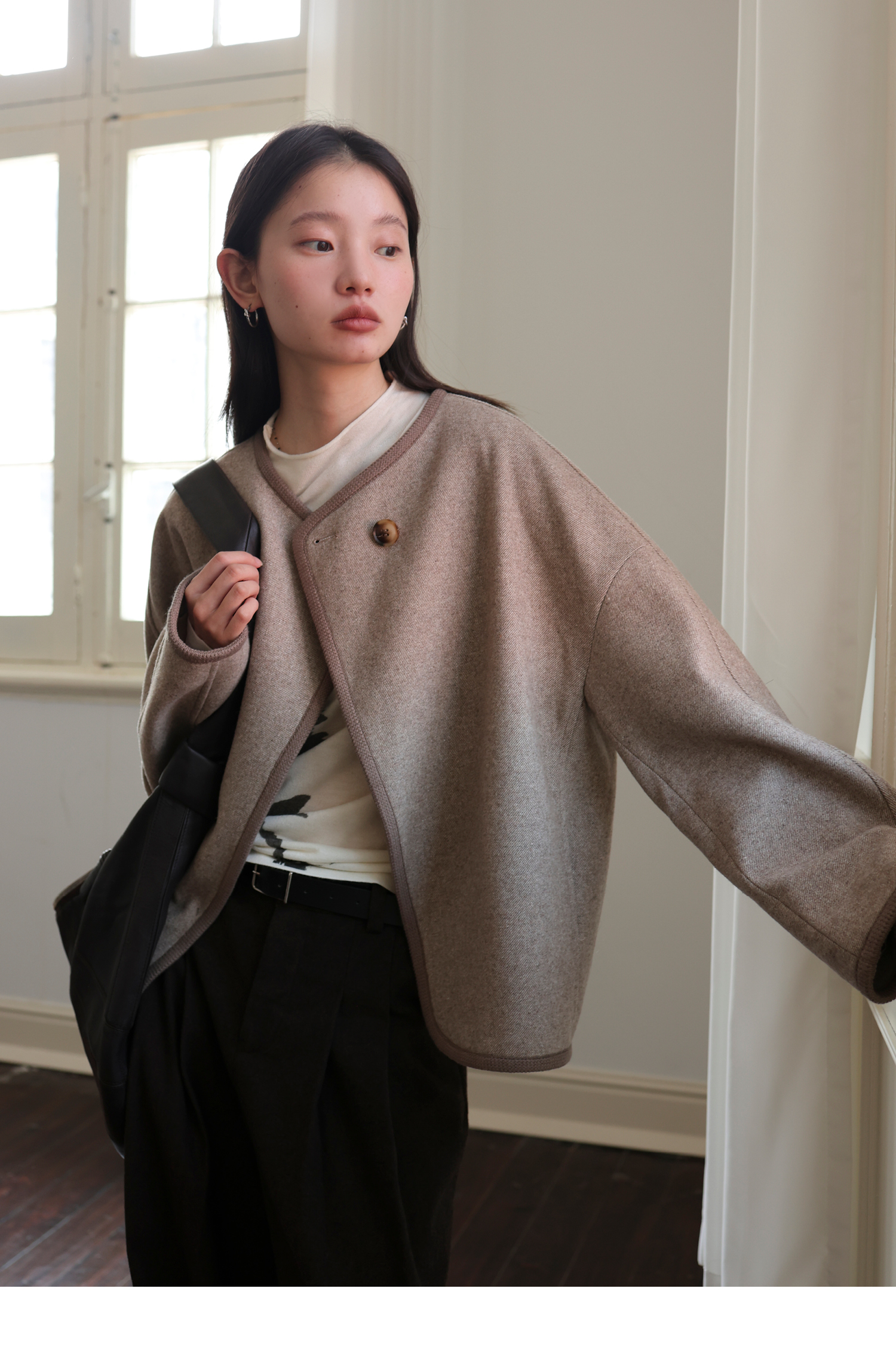 【5折不退换 买六免一】SUPERSCAPE素舶 设计感秋冬V领单扣落肩薄呢宽松休闲短款大衣