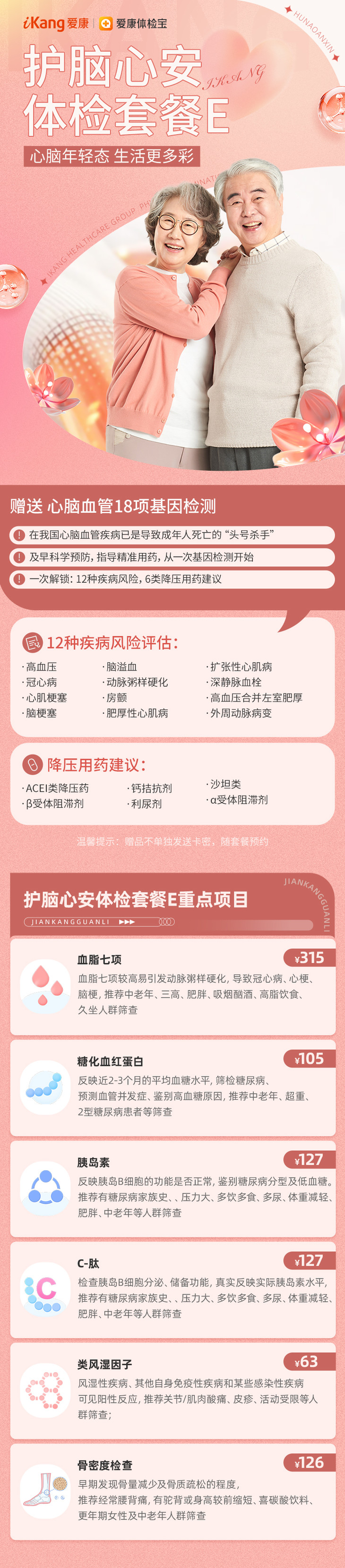 【升级血脂七项、糖化血红蛋白、胰岛素、C-肽、类风湿因子、骨密度检测】爱康 护脑心安体检套餐E(含心脑血管18项基因检测)