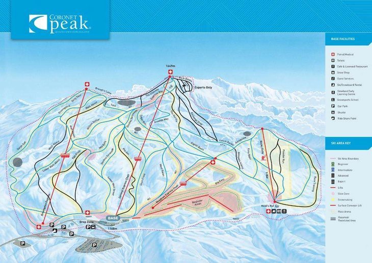 Cardrona是处于新西兰南岛皇后镇和瓦纳卡城市之间的一座滑雪场。从皇后镇开车到雪场大约需要一个小时的时间。Cardrona是新西兰最高的滑雪场,海拔近2000米,可以满足从初学到高难度的各种需求。拥有初级、中级和高级滑道,其中25% 初级雪道,50%中级雪道,25%高级雪道,适合普通滑雪爱好者。雪场有一条普通速度的四人缆车,两条高速四人缆车,三条魔毯,缆车每小时能够运输7800人。另外,雪场还有儿童中心和滑雪公园,提供餐厅、雪具租用店、医疗急救中心等必要设施。