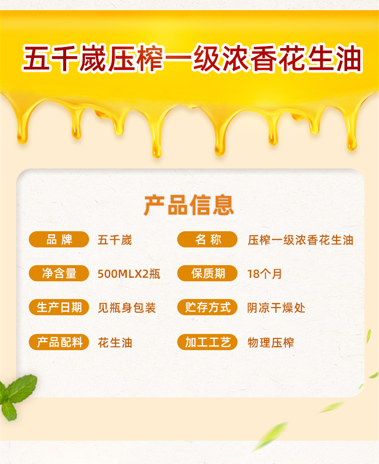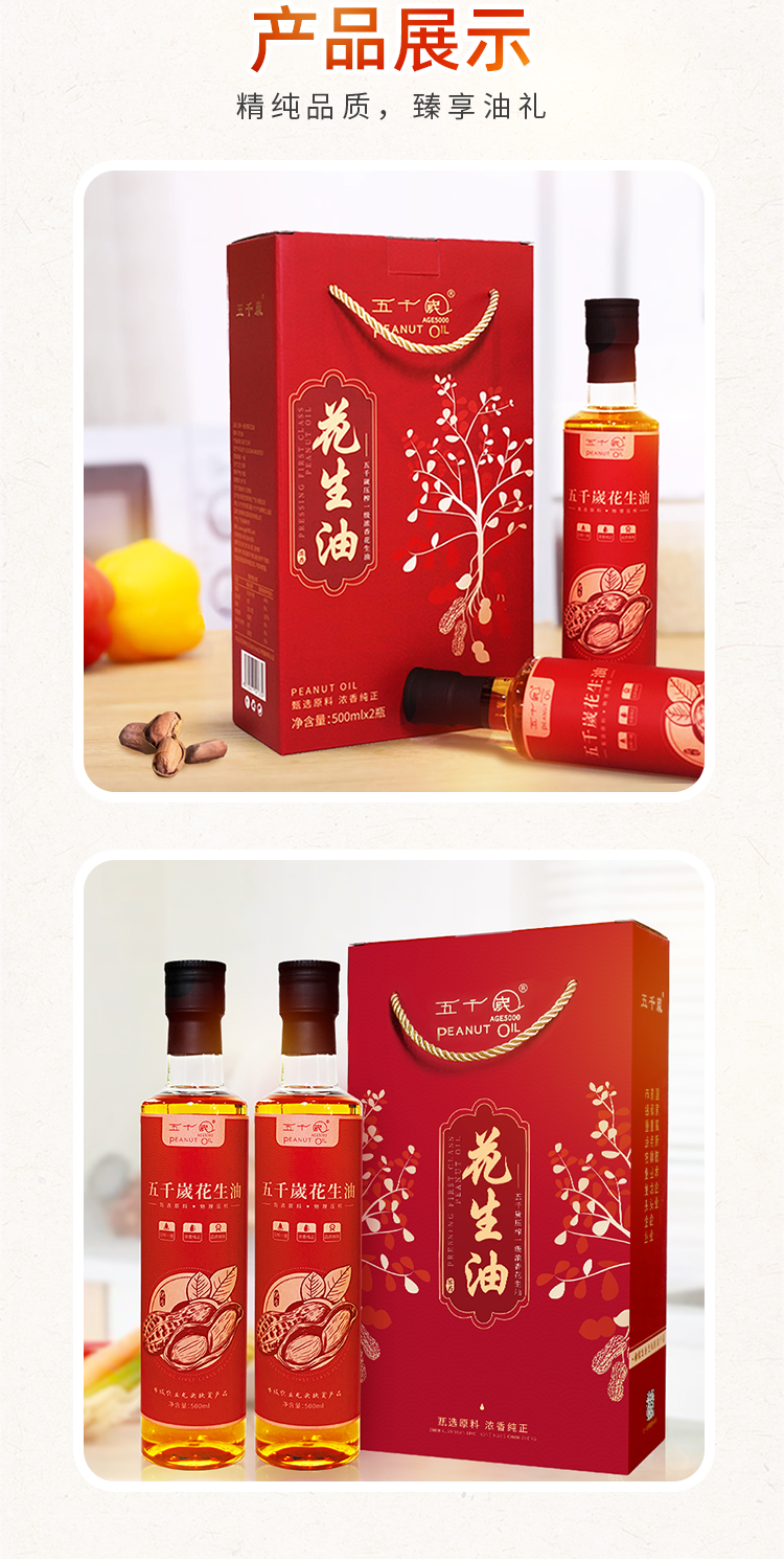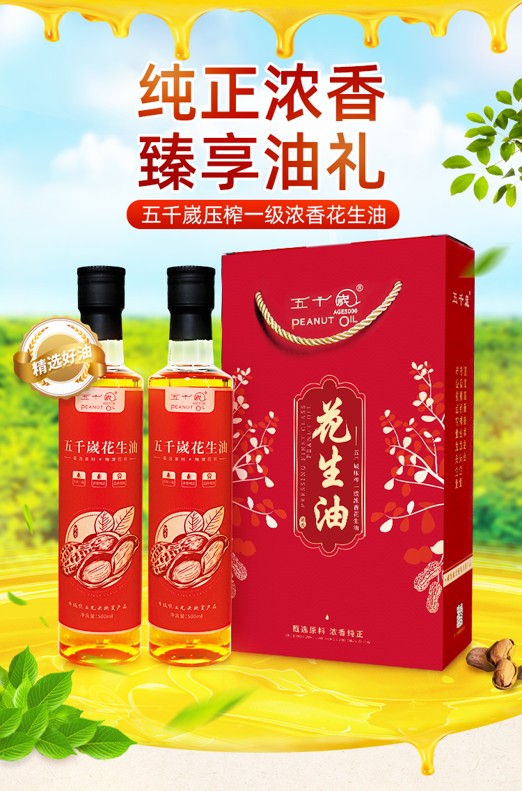 五千岁花生油压榨一级浓香纯正食用油礼盒装送礼礼品 500mlX2