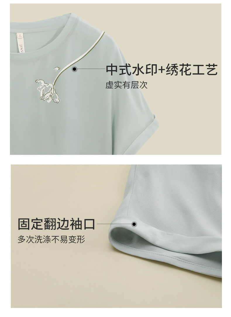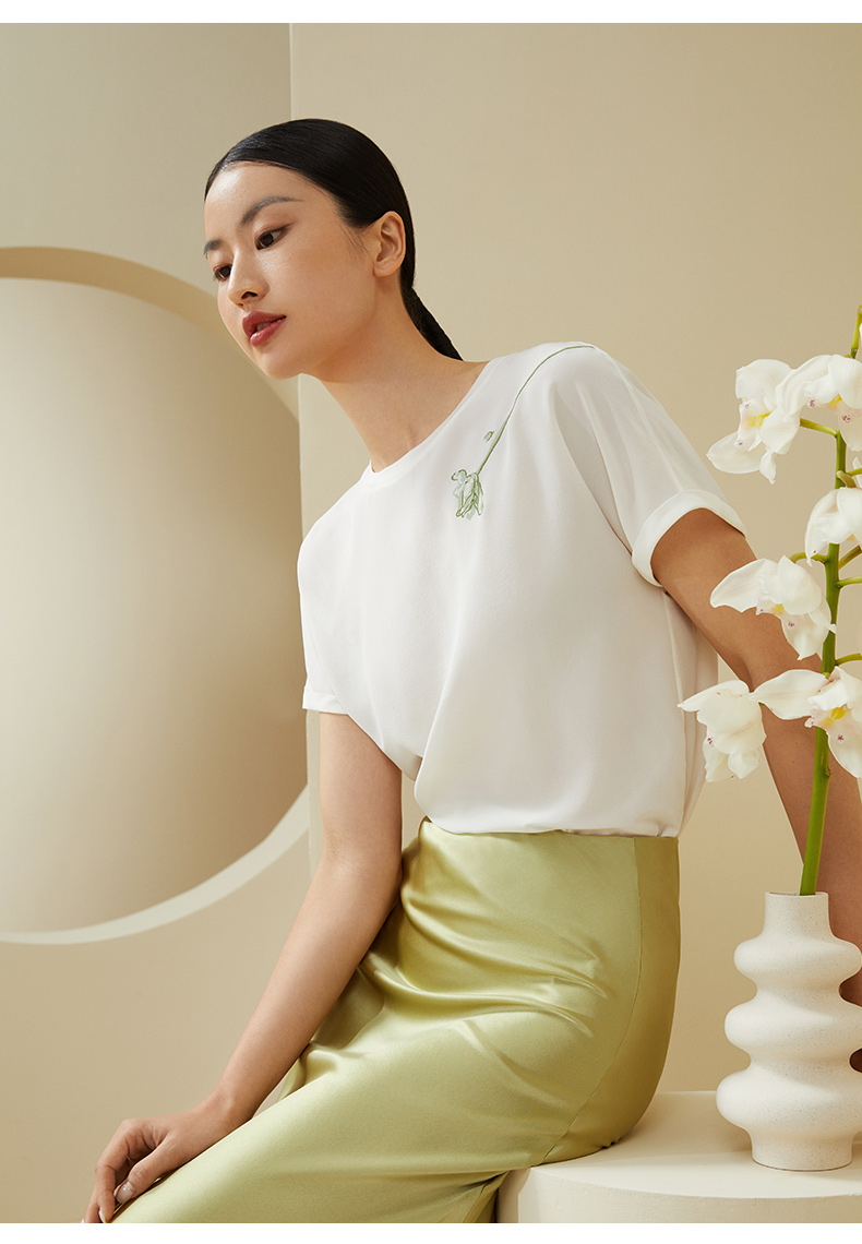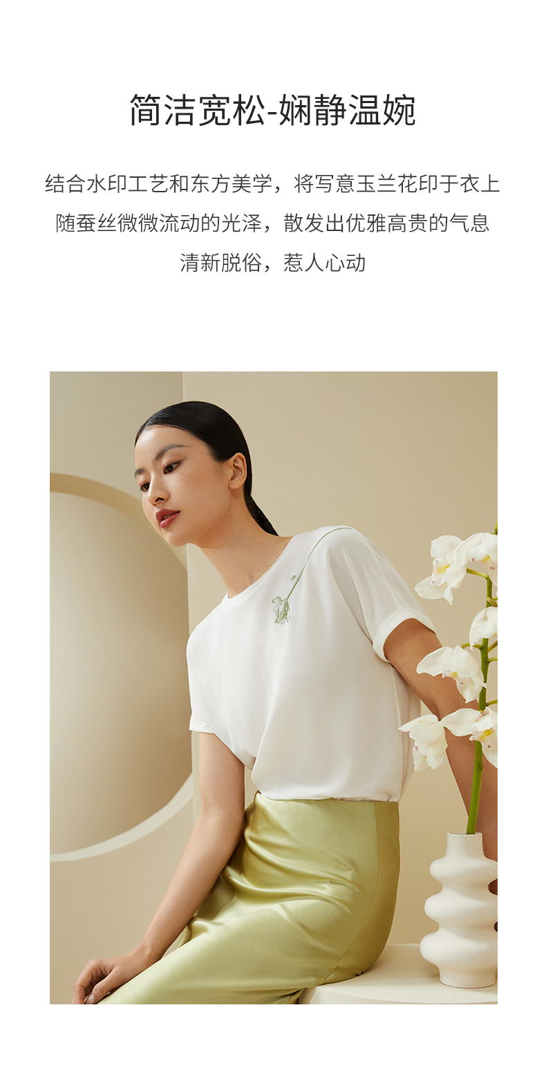 【不易皱的真丝】金三塔100%桑蚕丝玉兰花印花女士上衣时尚舒适外穿T YSFDA701