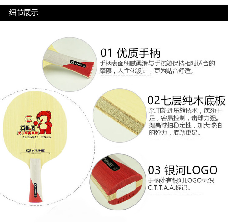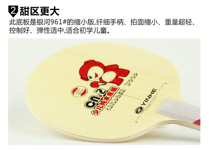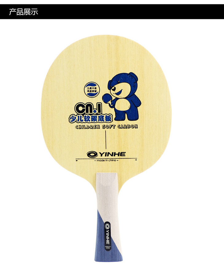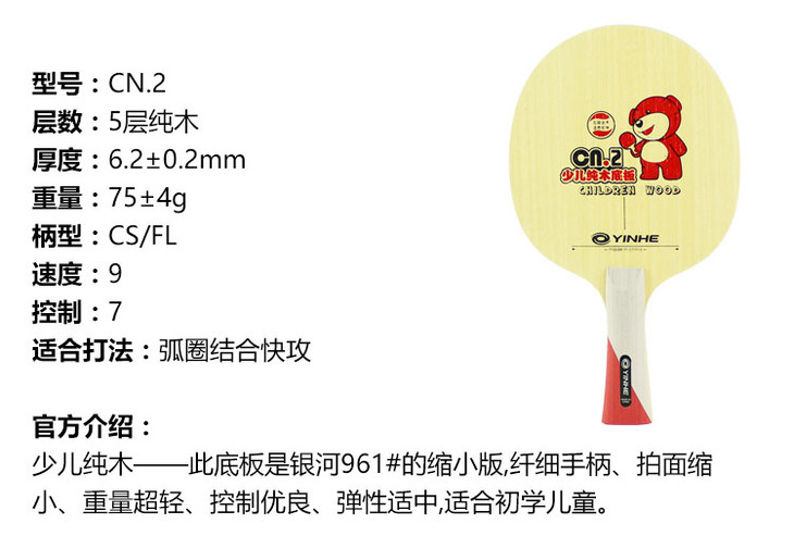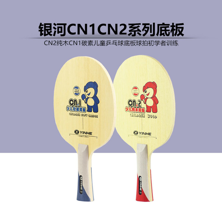 银河CN系列是银河专为儿童设计的球板,首字母C似乎正是“children”的意思。CN-1与CN-2均为儿童的需求为球板做出了轻量化设计,并且均为“ALL”级,击球感较为柔和,利于快速建立手感。