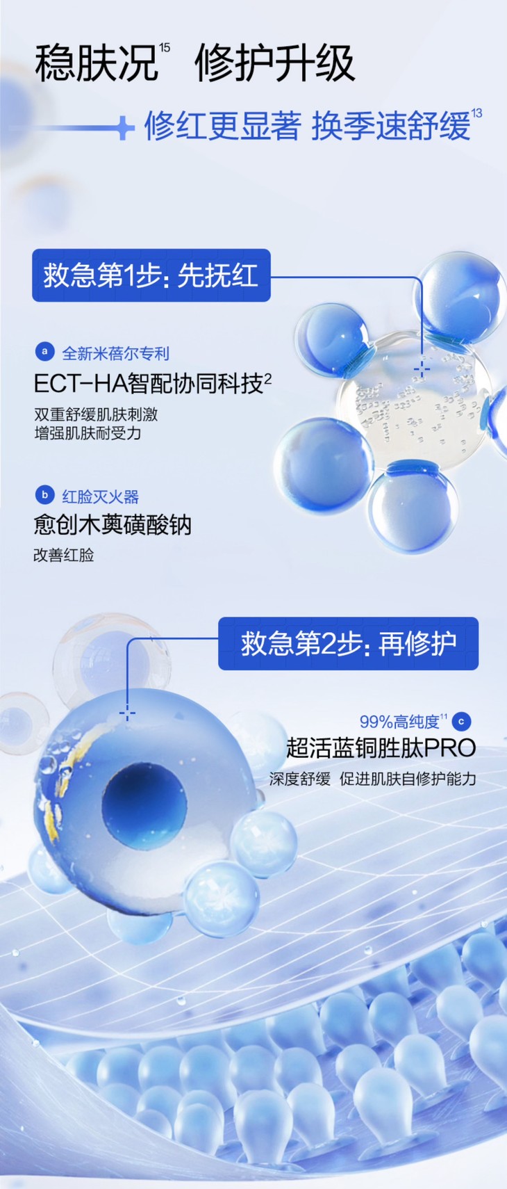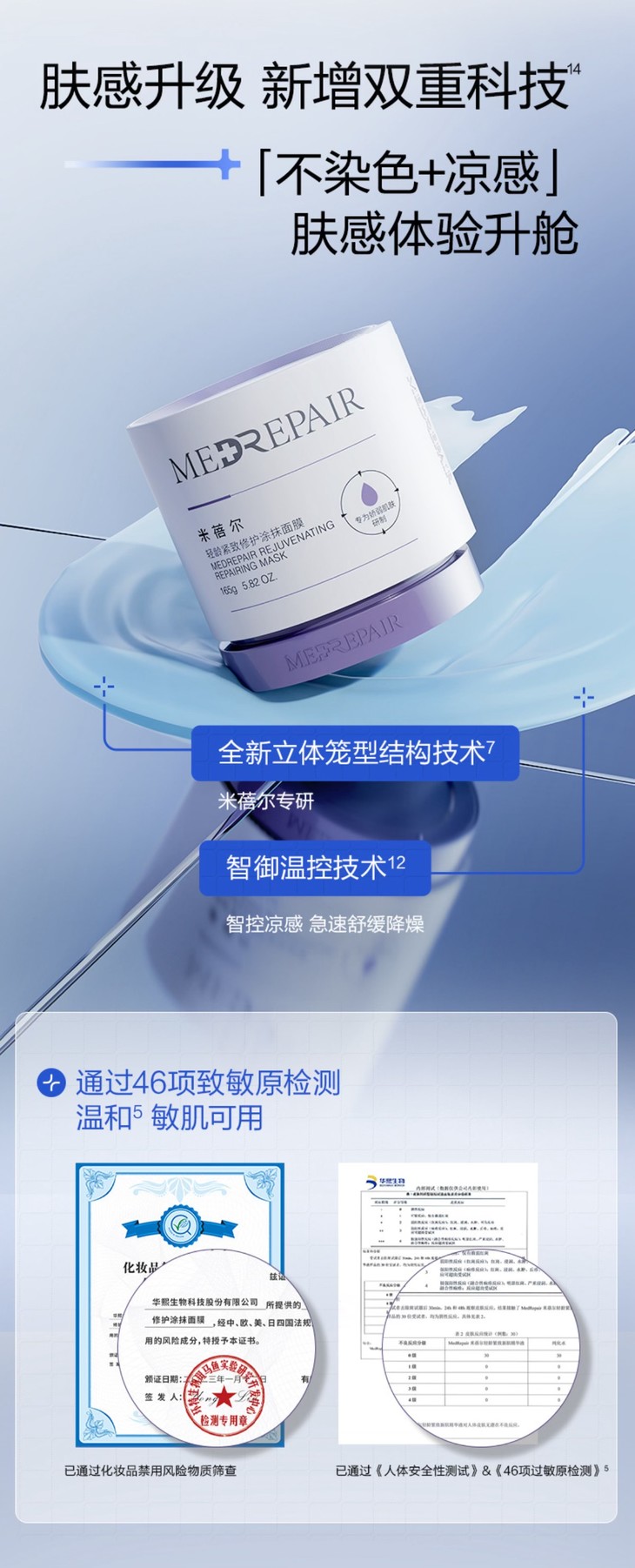 在肤感方面,蓝绷带2.0也实现了升级,新增双重科技,带来不染色且有凉感的全新肤感体验,借助立体笼型结构技术与智御温控技术,面膜能够迅速舒缓肌肤燥热,清凉舒适。同时,面膜运用独特的米蓓尔敏肌功效方程式ECT-HA,不仅能有效修红舒缓,还能增强肌肤耐受力,改善红脸现象。面膜通过了46项致敏原检测,温和安全,敏敏的老粉也可安心用哦!