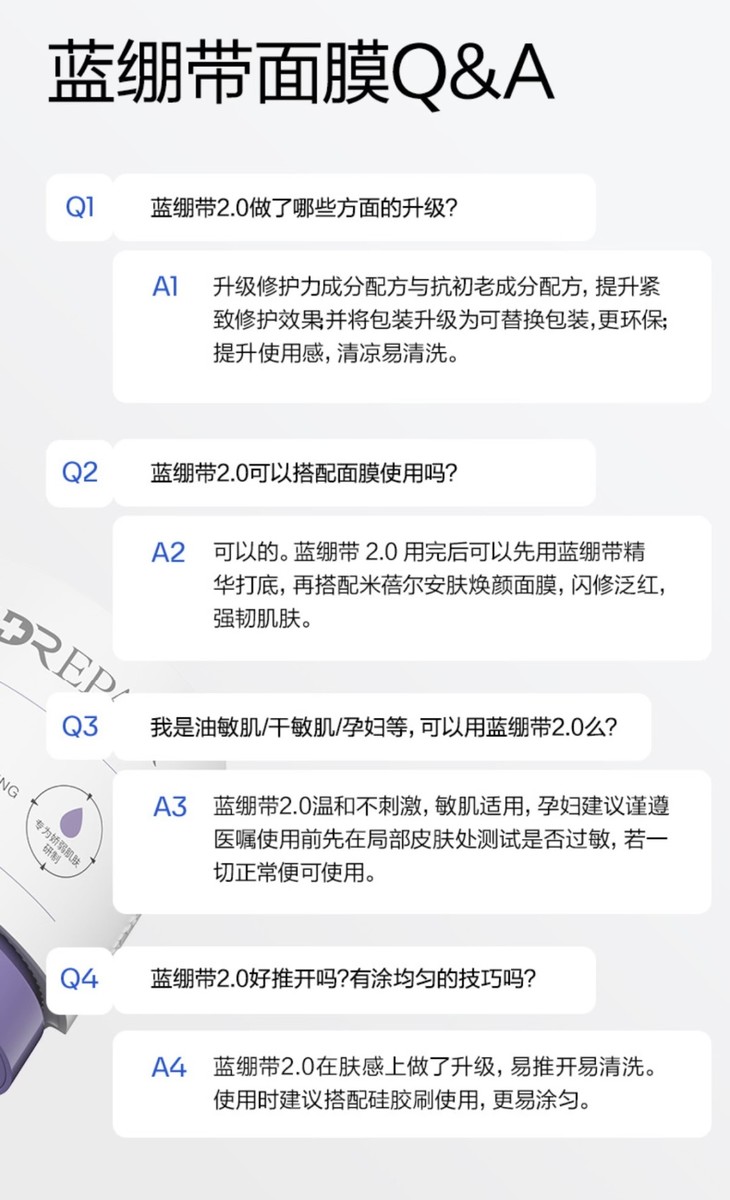 蓝绷带面膜2.0,一罐是165g,有正装和替换装可以选,1+1套组就更划算了!用法很简单,清洁面部后,用涂抹棒或面膜刷均匀涂抹,厚度以盖住肤色为宜,注意避开眼周,敷15-20分钟,用湿洗脸巾或化妆棉轻轻擦拭干净,再彻底冲洗,再涂抹上蓝绷带精华和面霜,好好保湿,安稳度过敏敏季!