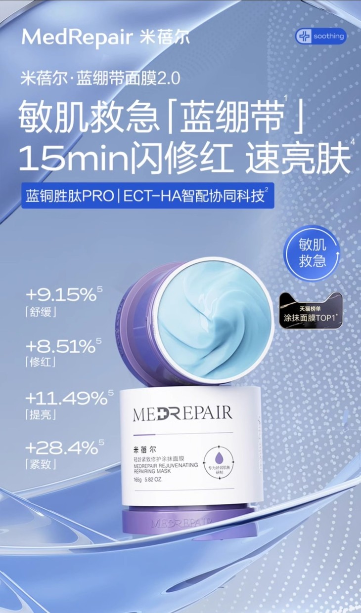 米蓓尔的蓝绷带2.0面膜,蕴含99%高纯度的超活蓝铜胜肽Pro,能深入肌肤底层,高效舒缓肌肤,显著增强自我修护能力。作为备受瞩目的抗初老面膜,它在修复的基础上还添加了华熙生物自研的核心焕亮成分——超活麦角硫因Bioyouth-EGT PRO,还可以有效提亮肤色,真的很全能了!