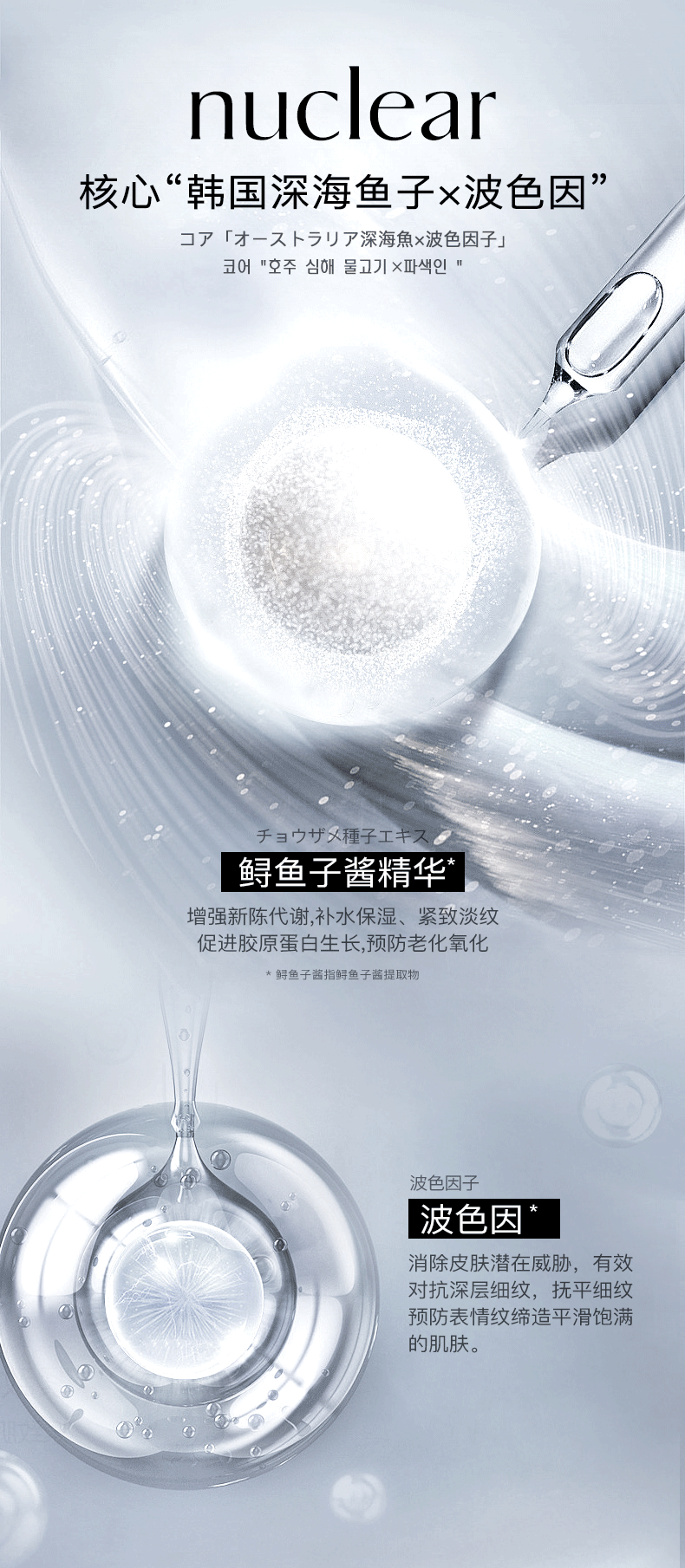 成份:含烟酰胺、B-葡聚糖、透明质酸钠、鲟鱼子酱、大麦籽、密罗木叶、海茴香、北美金缕梅、积雪草、蚕丝氨基酸类精粹,质地水润清爽不油腻。·适应人群:正常肤质 敏感肌孕妇除外·功效:帮助改善干燥粗糙肌肤,轻薄润肤,淡化细纹,紧致弹滑肌肤,舒纹抗皱,改善暗沉,使肌肤柔滑水嫩。