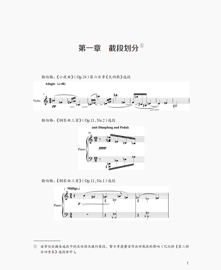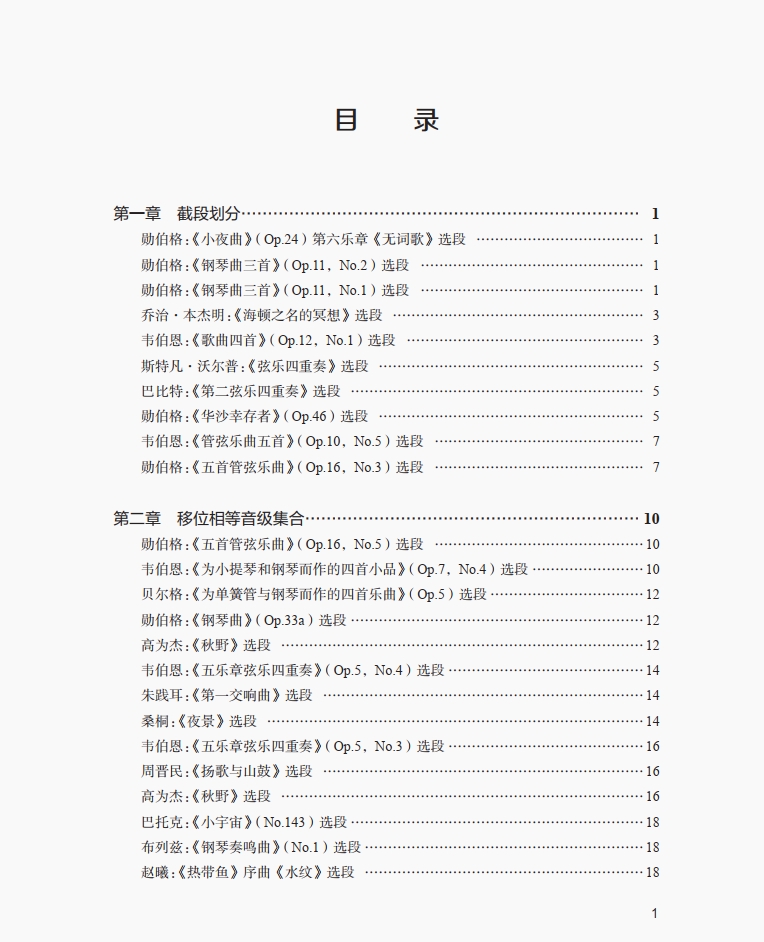 本书主要面向作曲与作曲理论专业的学生,根据阿伦福特《无调性音乐的结构》一书中知识点的讲解顺序,共分为九个章节,分别为:截断划分、移位相等音级集合、反行相等音级集合、向量相同的不相等音级集合、音级集合的子集、相似性关系、顺序关系、音级集合的补集和集合复合型结构。前八章为实例片段,最后一章为完整作品,按照从易到难的顺序排序,每一章节后都涉及相关的练习及思考题。