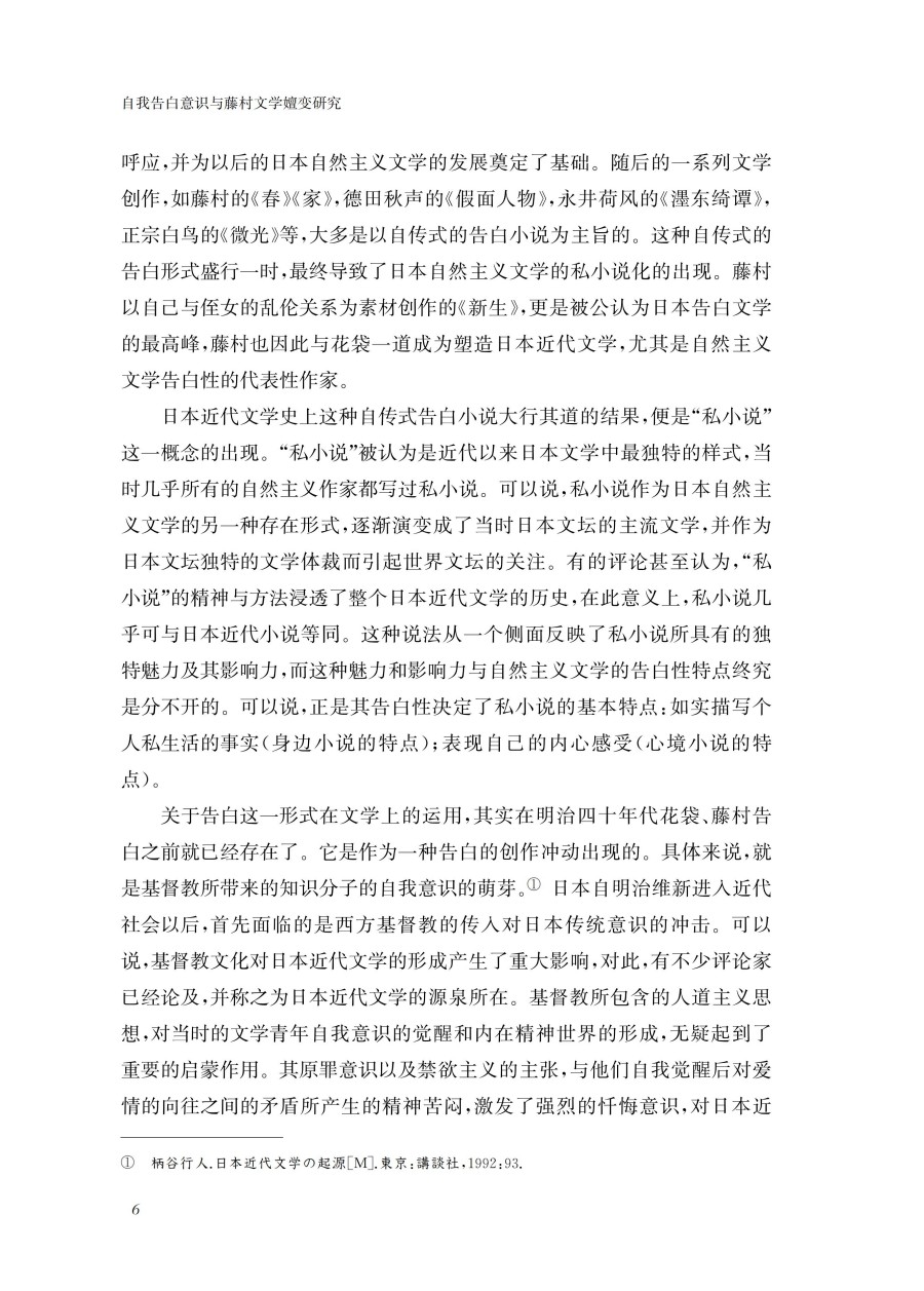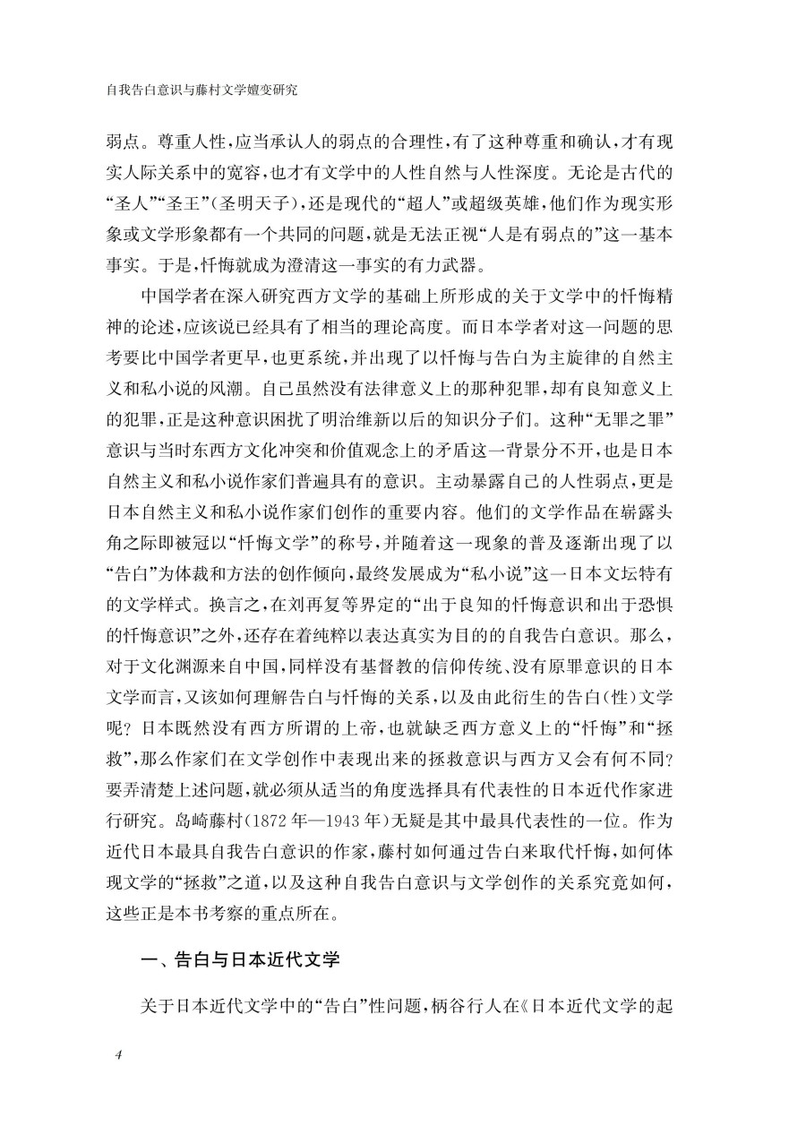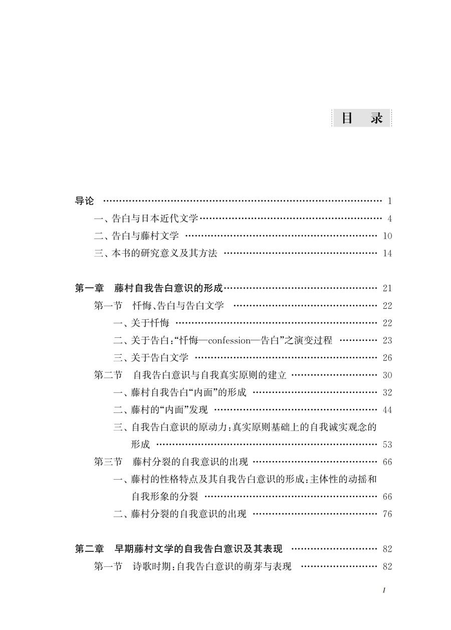 本书主要通过研究日本著名作家岛崎藤村的;自我告白意识对各个时期的创作所产生的影响及其嬗变关系,从而挖掘出个人主义意识对日本近代作家的创作及人生所产生的深刻影响。从诗歌到散文、再到小说,从社会小说转向自传性告白小说、再到历史小说,藤村文学的变化轨迹与其自我告白意识有着密切关系。本书不仅在主题、内容上考察了藤村文学受到其自我告白意识的影响,还重点分析了其创作风格变化过程与其自我告白意识的联动关系。通过对自我告白意识与藤村文学嬗变关系的研究和论述,既可以更深切地了解近代自我问题在日本近代文学发展进程中所起到的独特作用,也可以透视日本近代社会的矛盾性的根源所在,为理解日本近代文学和近代社会提供了有效的方法论。