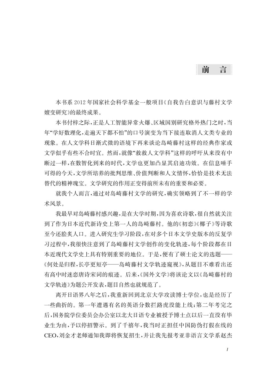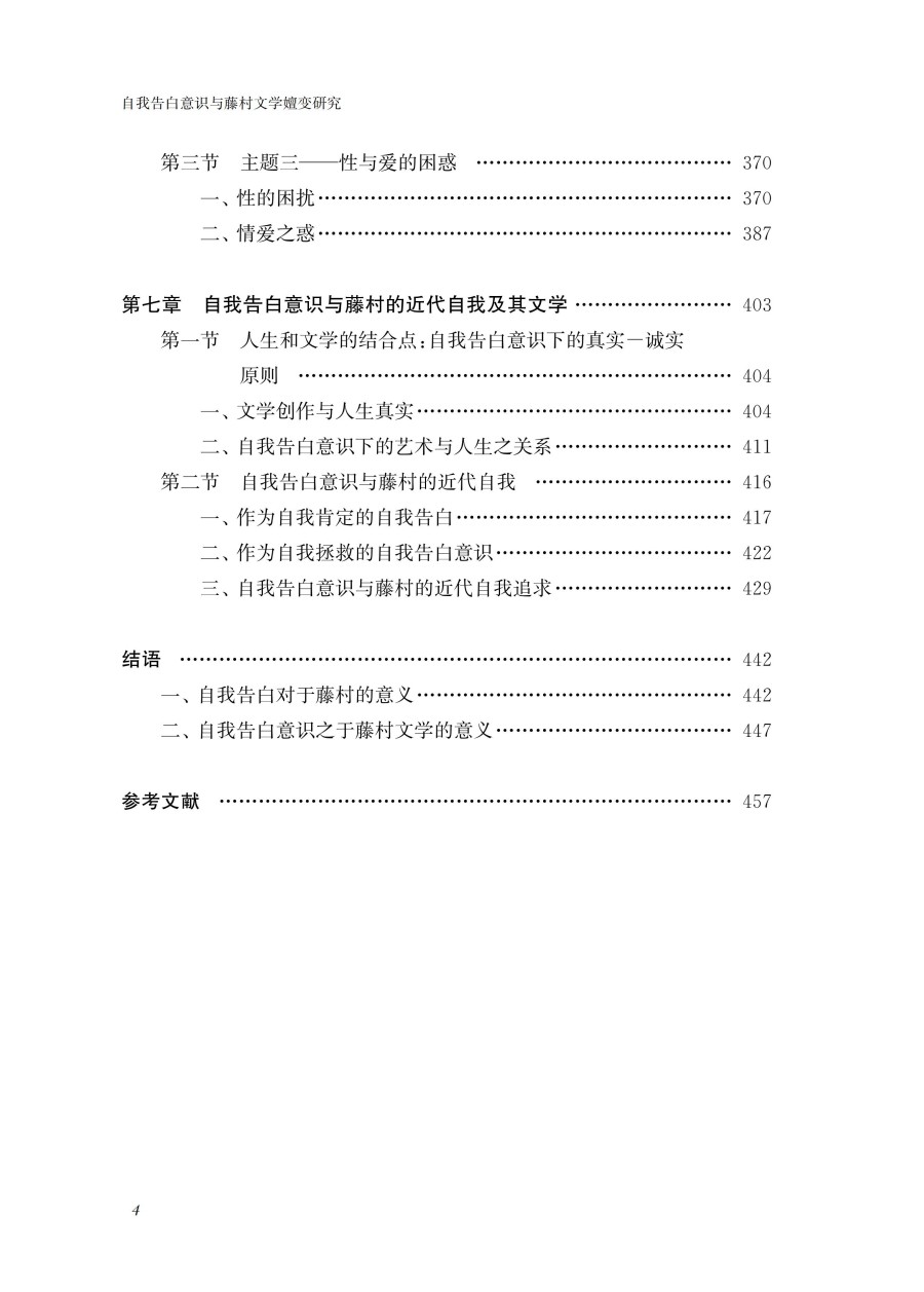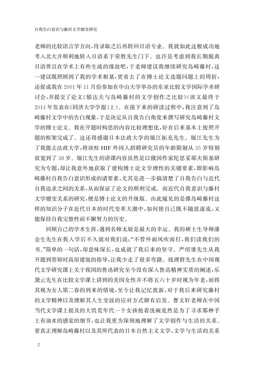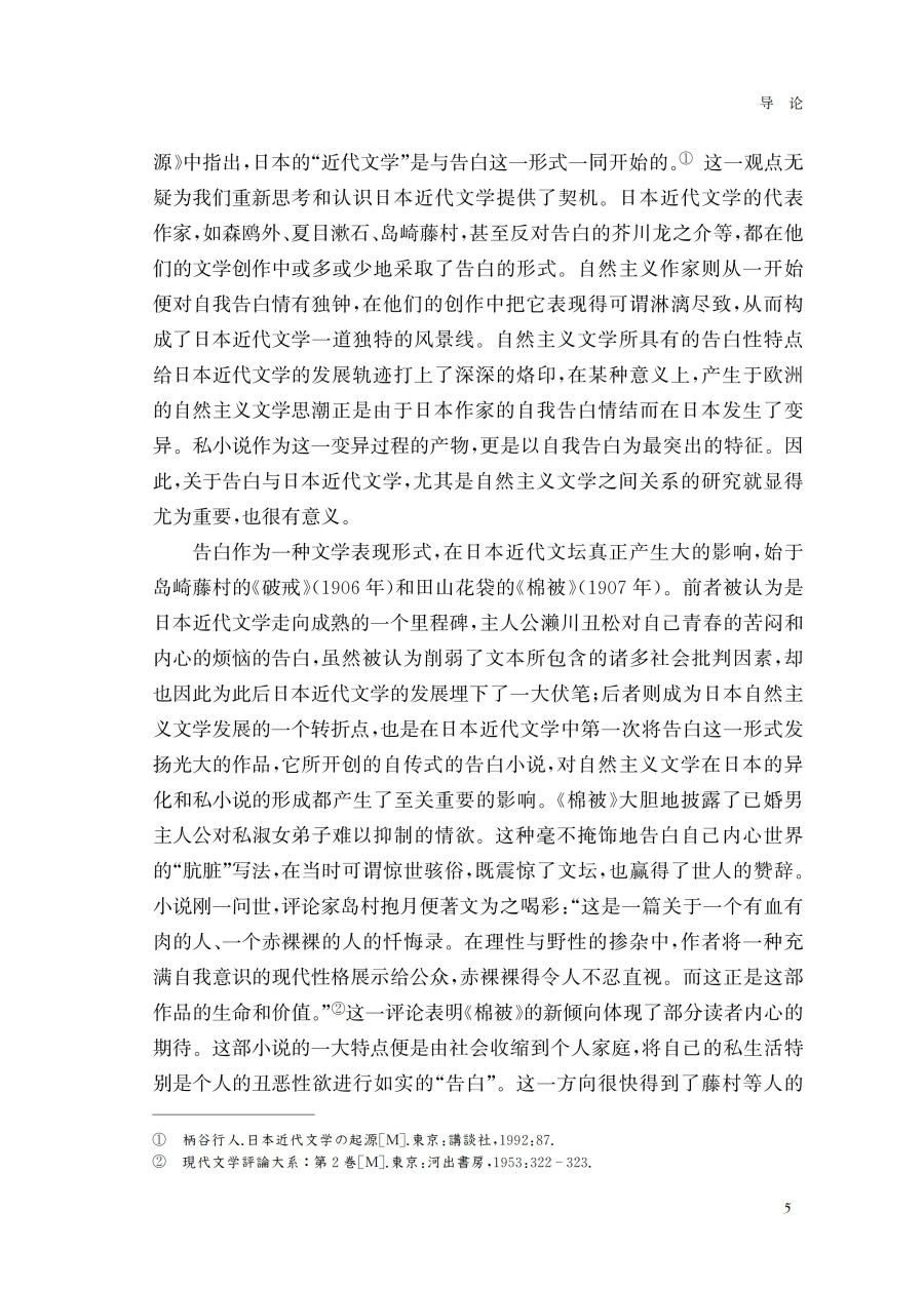 本书主要通过研究日本著名作家岛崎藤村的;自我告白意识对各个时期的创作所产生的影响及其嬗变关系,从而挖掘出个人主义意识对日本近代作家的创作及人生所产生的深刻影响。从诗歌到散文、再到小说,从社会小说转向自传性告白小说、再到历史小说,藤村文学的变化轨迹与其自我告白意识有着密切关系。本书不仅在主题、内容上考察了藤村文学受到其自我告白意识的影响,还重点分析了其创作风格变化过程与其自我告白意识的联动关系。通过对自我告白意识与藤村文学嬗变关系的研究和论述,既可以更深切地了解近代自我问题在日本近代文学发展进程中所起到的独特作用,也可以透视日本近代社会的矛盾性的根源所在,为理解日本近代文学和近代社会提供了有效的方法论。
