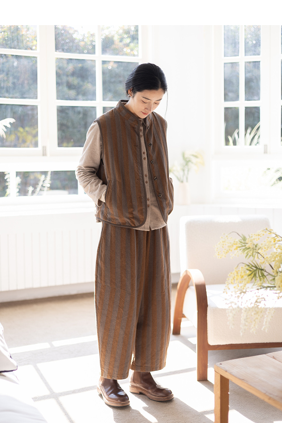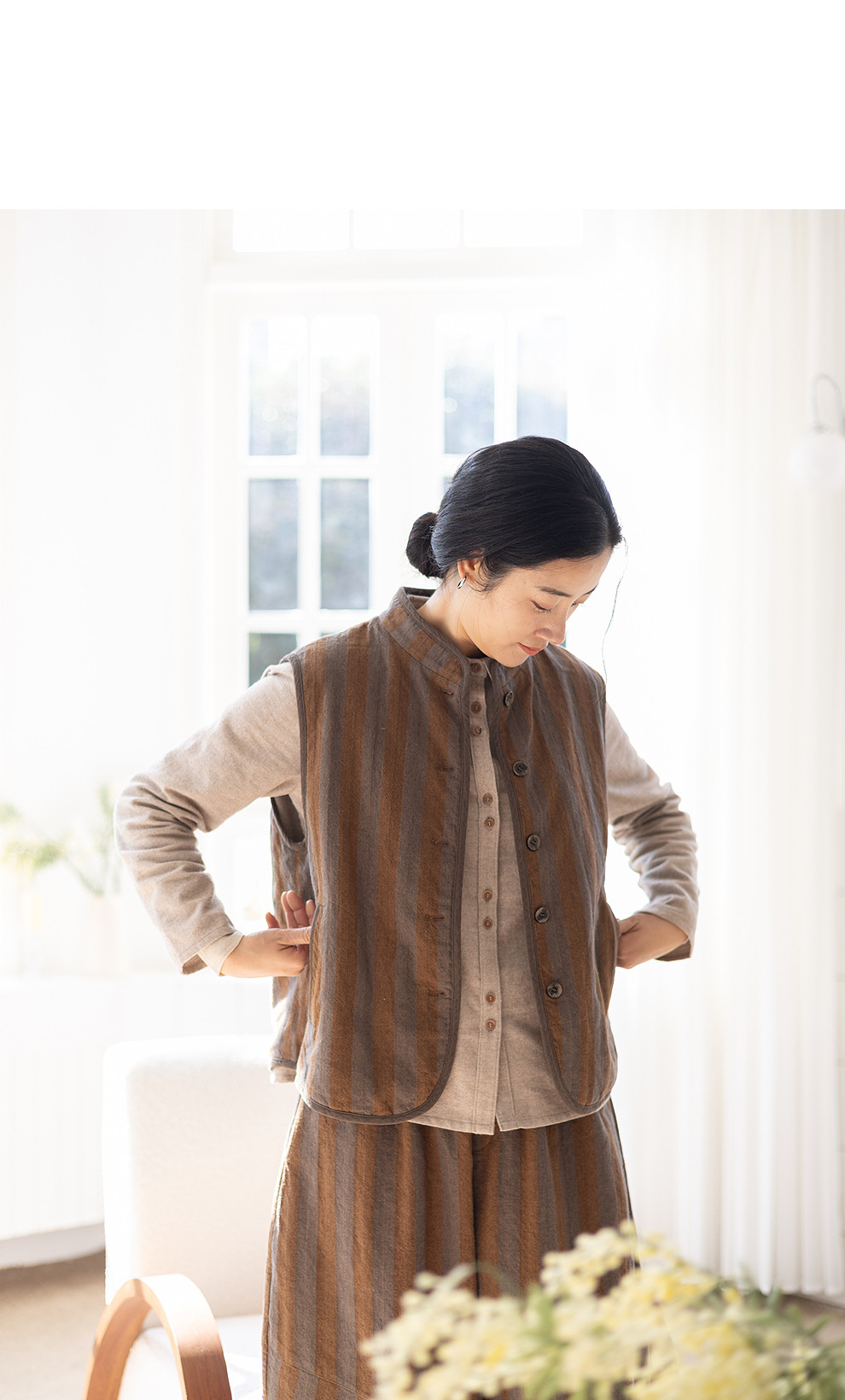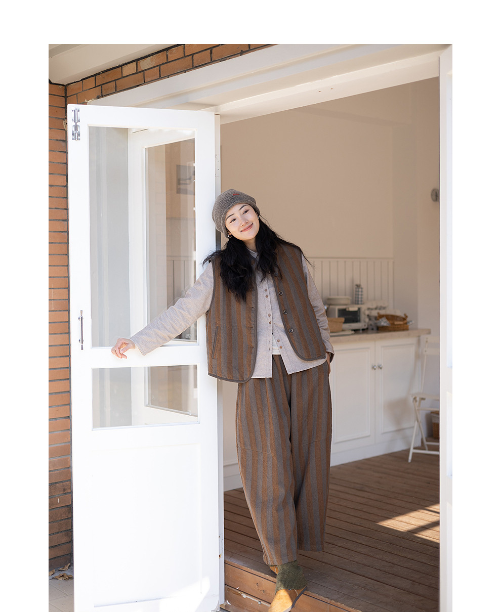 绽放031朵/棉麻色织鱼骨纹夹棉叠穿马甲女小立领文艺百搭马夹加厚