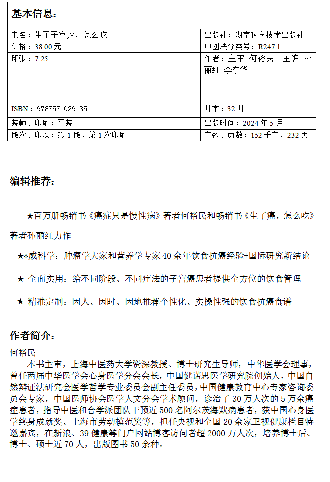 精准饮食抗癌智慧:生了子宫癌,怎么吃 畅销书著者何裕民孙丽红 *新力作饮食 防控 科学