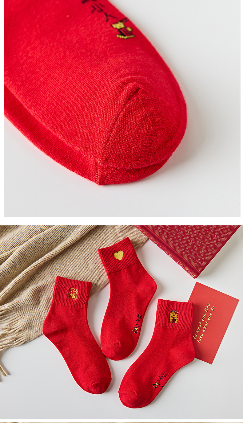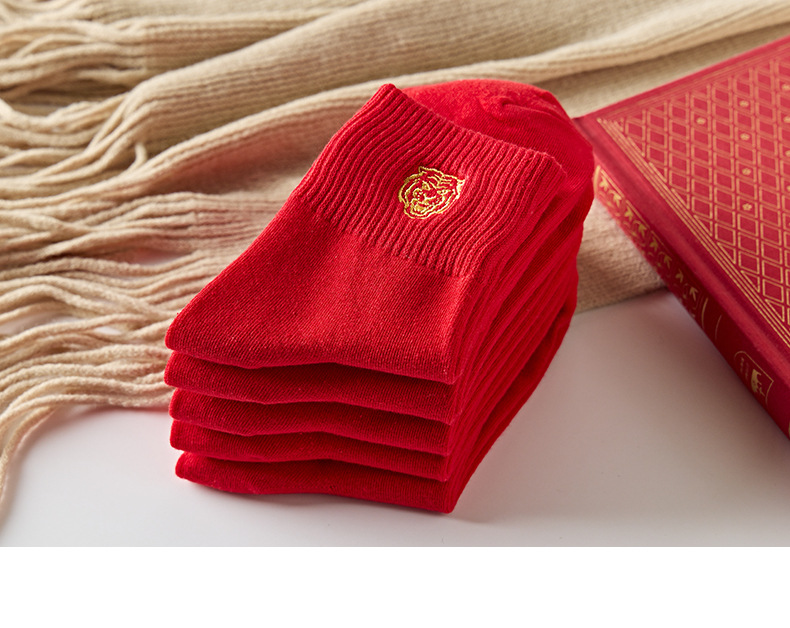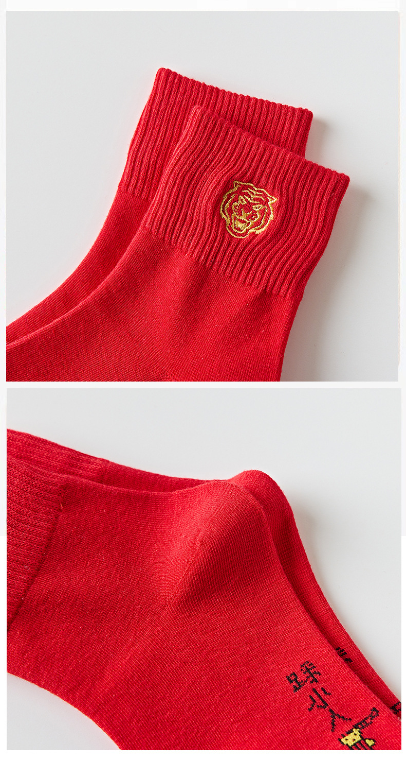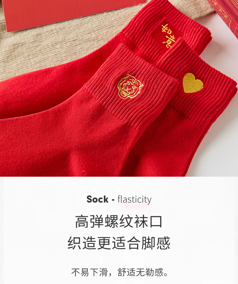【5双装 新年红开运袜 好运相伴】虎年新年袜红袜子女秋冬刺绣中筒袜本命年袜子男士结婚棉袜情侣袜
