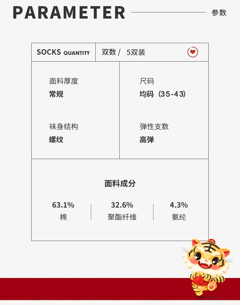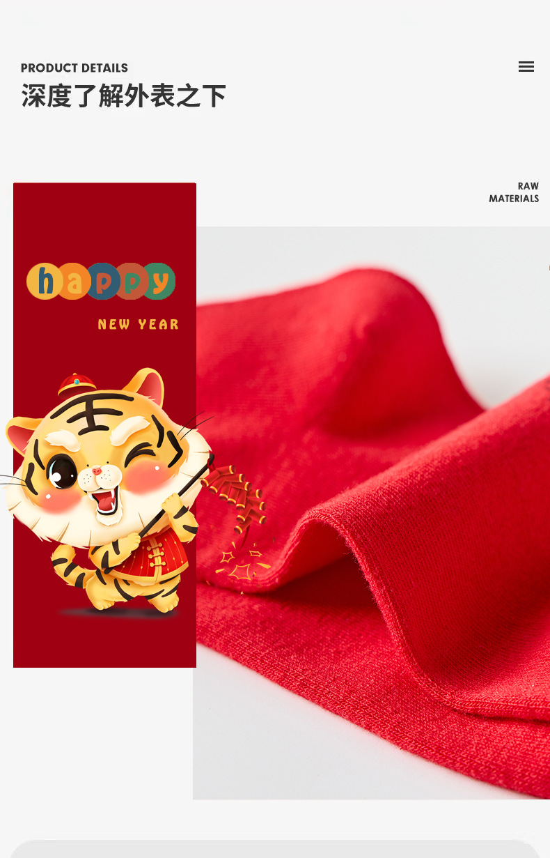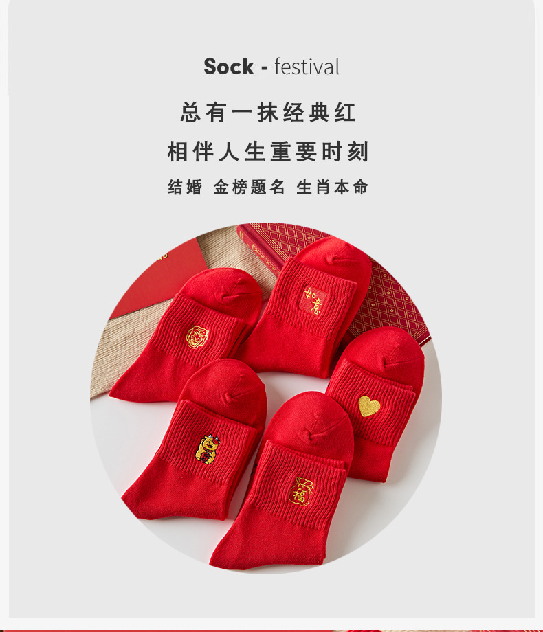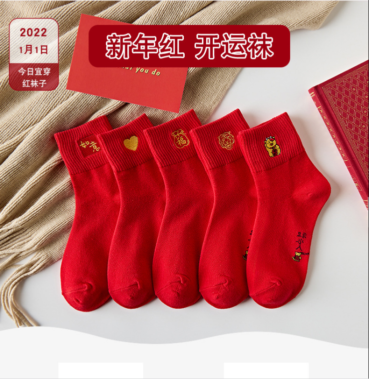 【5双装 新年红开运袜 好运相伴】虎年新年袜红袜子女秋冬刺绣中筒袜本命年袜子男士结婚棉袜情侣袜