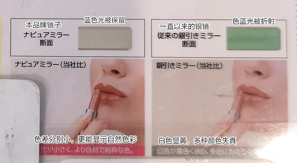 采用去除更多铁元素的透明玻璃制成的天然化妆镜。