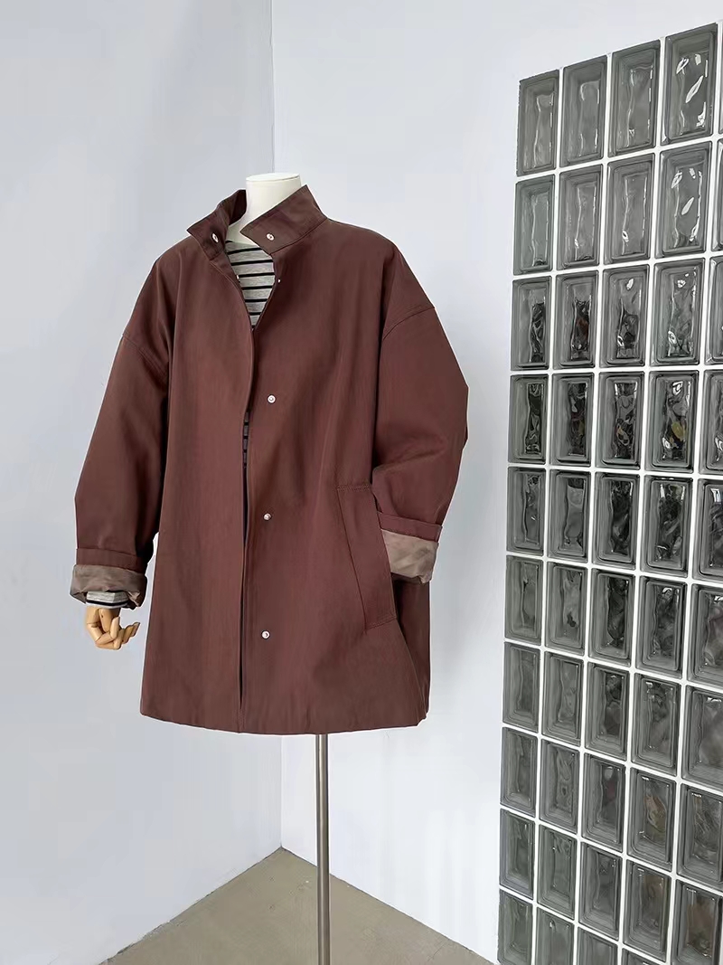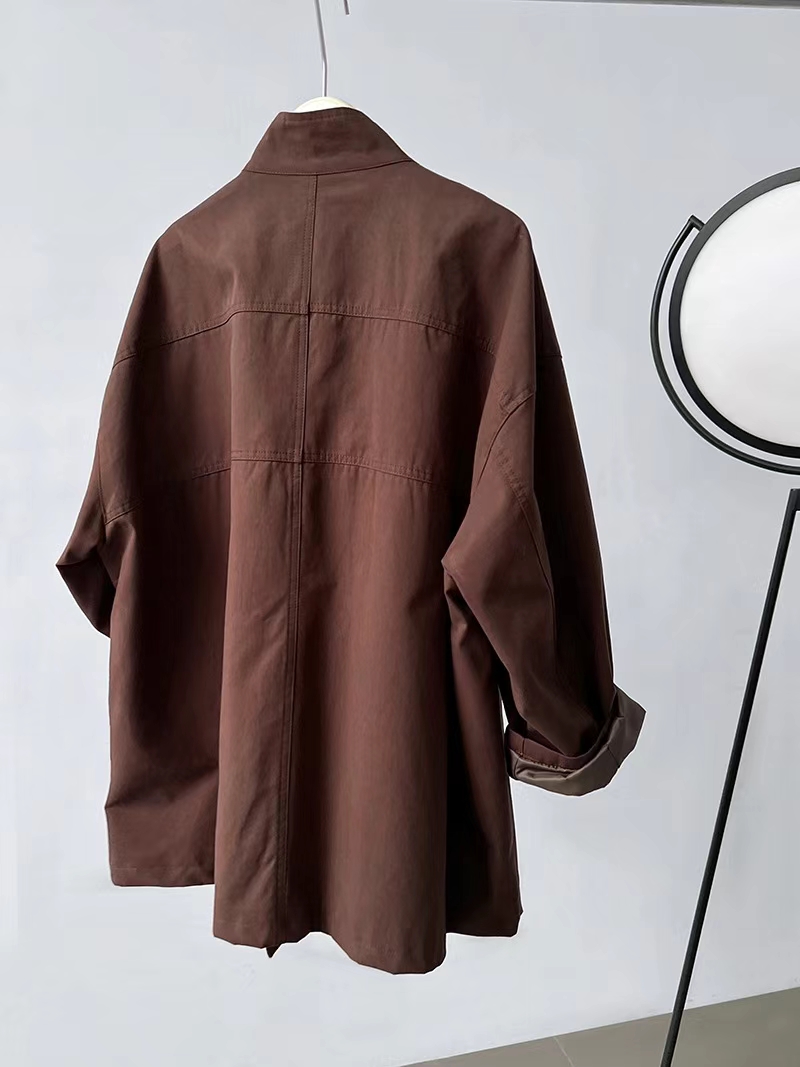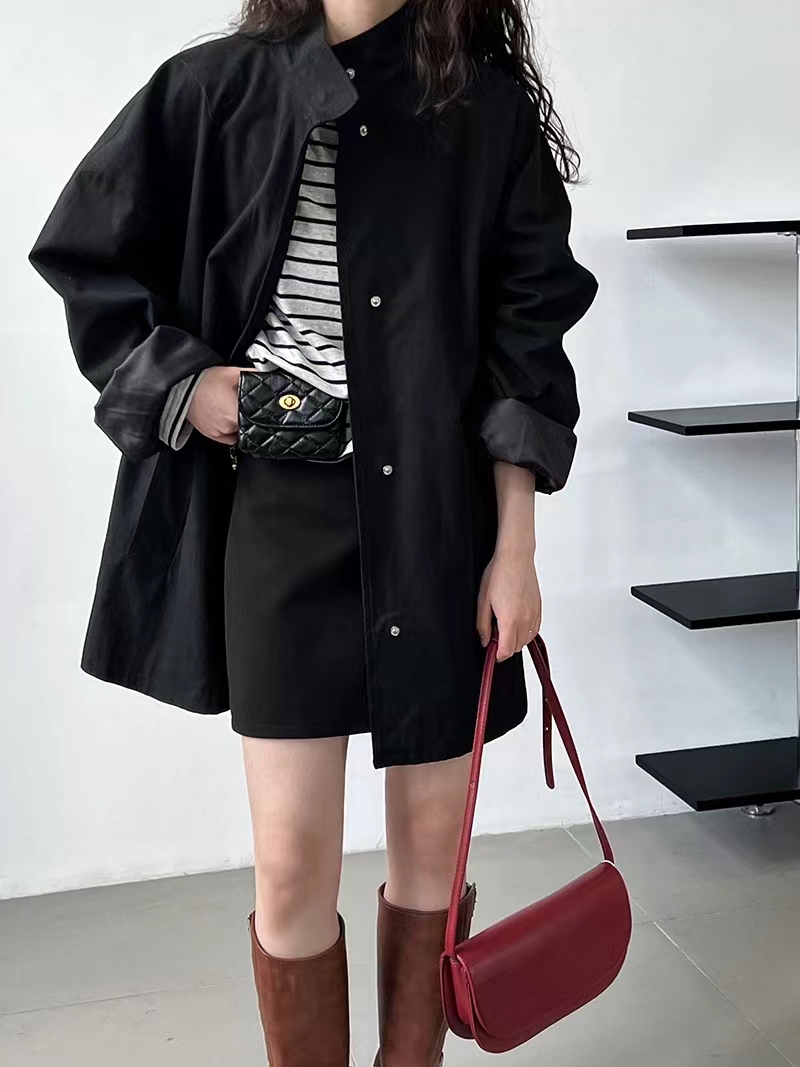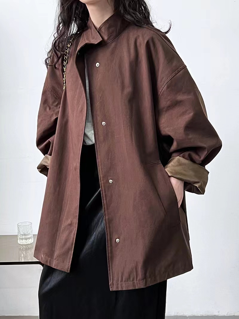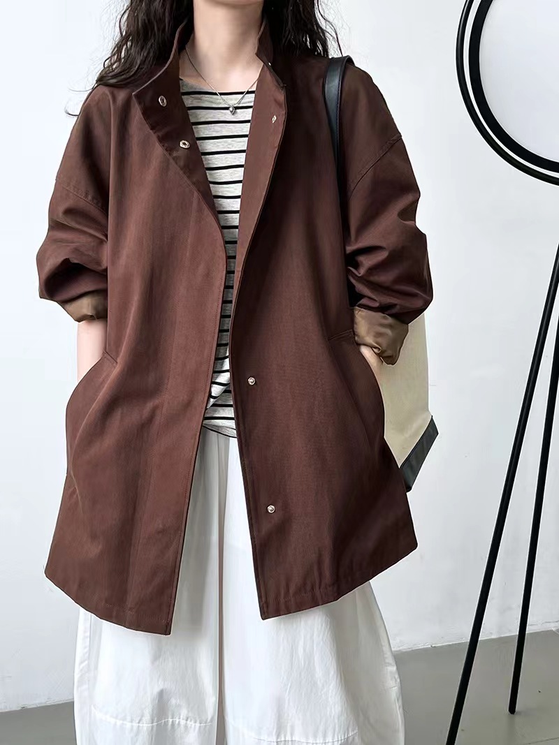 春秋太适合了~这款复古休闲的宽松设计感风衣,绝对是你的zui佳选择。立领的设计帅气十足,不仅能防风,还增添了一份时尚感。纯色的夹克外套简约而大气,无论是搭配牛仔裤、短裙还是连衣裙,都能轻松打造出不同的风格。