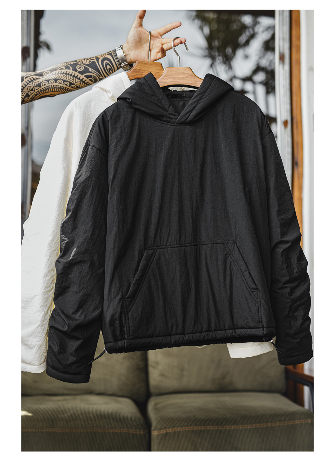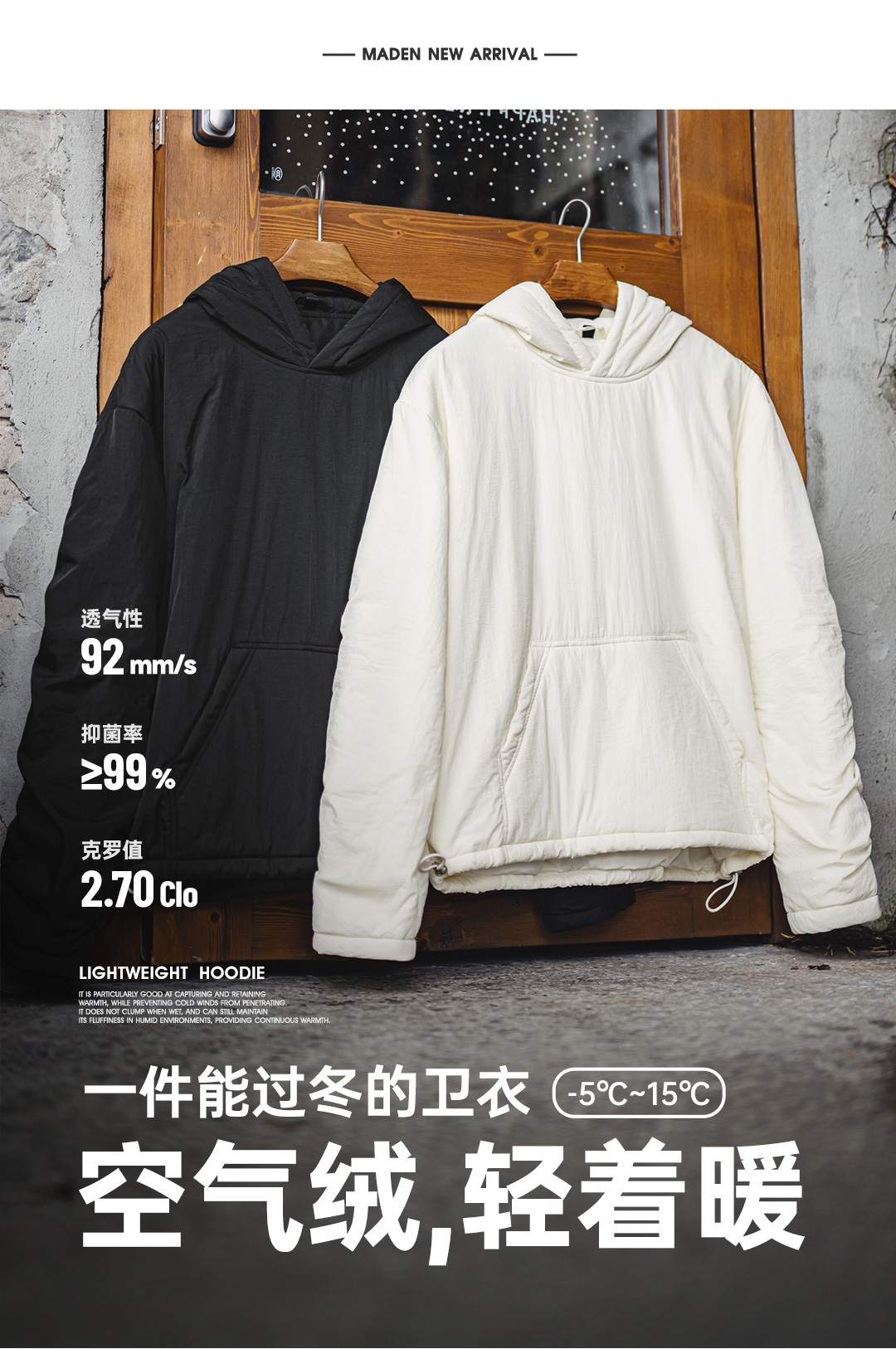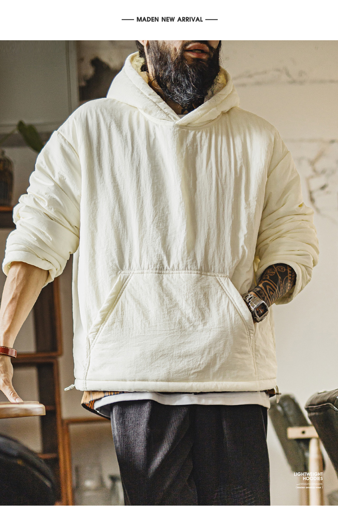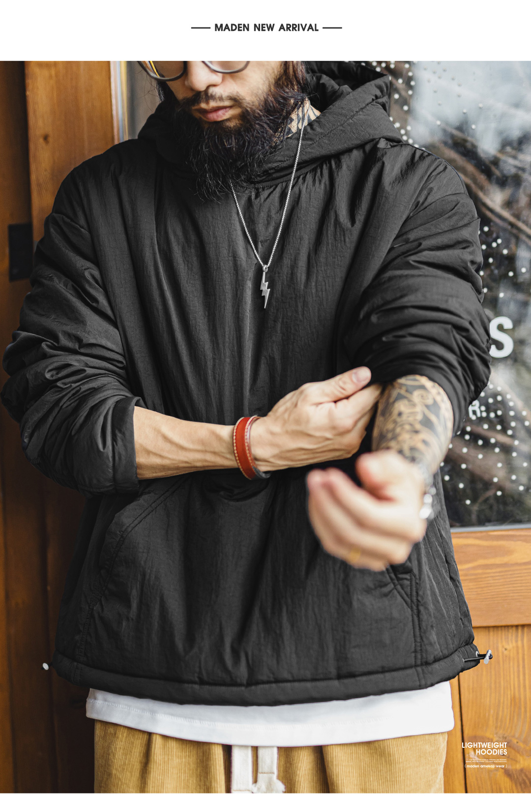 马登工装美式气绒套头口袋卫衣圆领连帽通勤加绒保暖廓形外套男冬